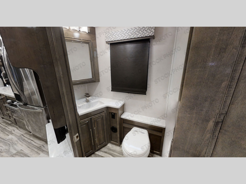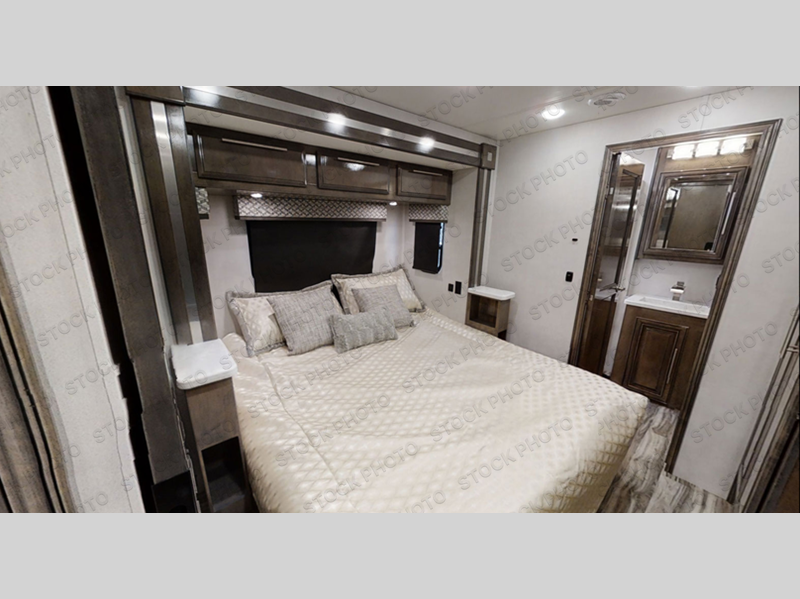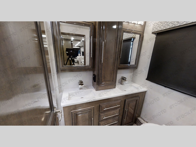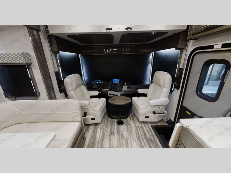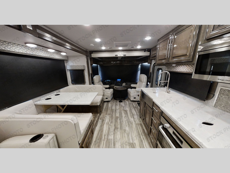 Comfort and convenience is found all throughout this motorhome! Starting with the full rear master bath that has a 42" x 30" shower with a seat and a dual sink vanity, plus it leads into the private bedroom. Inside the bedroom is a 72" x 80" king bed slide with overhead cabinets across from a dresser with overhead cabinets and a 32" LED TV, a wardrobe, and another wardrobe that is prepped to add an optional stackable washer and dryer. The half bathroom is conveniently near the fully equipped kitchen so you can get back to creating your best home cooked meals fast. Relax in true comfort each night by either playing games at the booth dinette or on the theater seating that comes with power recline, heat, and massage!