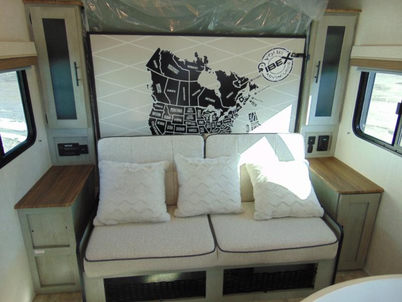 This Ibex travel trailer is incredibly versatile! With two sofas, there's plenty of room to relax inside, or set up outdoors under the 16' awning. There's a 60" x 80" Murphy bed where you'll be able to sleep comfortably. Dine in style at the L-shaped countertop with bar stool seats and chat with the cook in the kitchen. Stainless steel appliances finish the look. At the rear you'll find a full bath with a radius shower. And you might like to add the optional Unplugged Package that comes with premium lithium-ion batteries, an easy view control panel, a high efficiency A/C, and more!