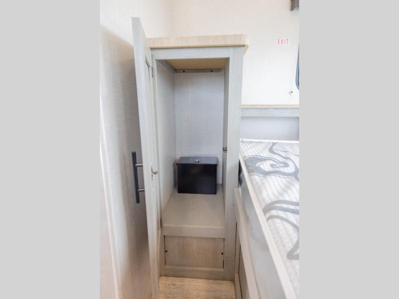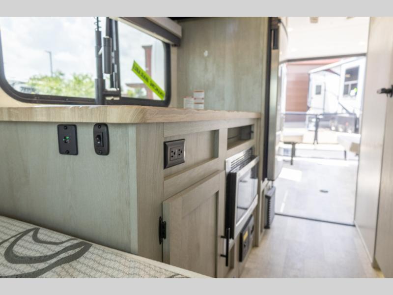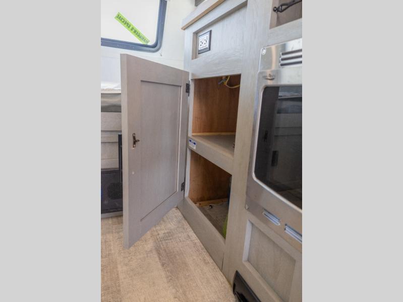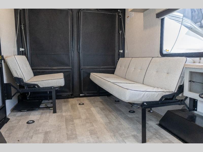 Get out with your toys in this IBEX! Whether you have motorcycles or a Razor 1000, the ramp door will provide easy loading and unloading plus you can secure your toys for safe travels. Once at your destination, the garage area becomes your living area as well as kitchen for you to enjoy after hitting the trails. There is a fold-up sofa, an additional seat, plus entertainment center and storage for your gear, and a space to place your dry goods and snacks in the pantry. The galley kitchen has everything nearby so the cook can whip up warm meals. And the full bathroom includes a shower so everyone can stay clean, plus the front area offers a queen bed, a wardrobe plus overhead storage for clothing and such. And you might like to add the optional Unplugged Package that comes with premium lithium-ion batteries, an easy view control panel, a high efficiency A/C, and more!