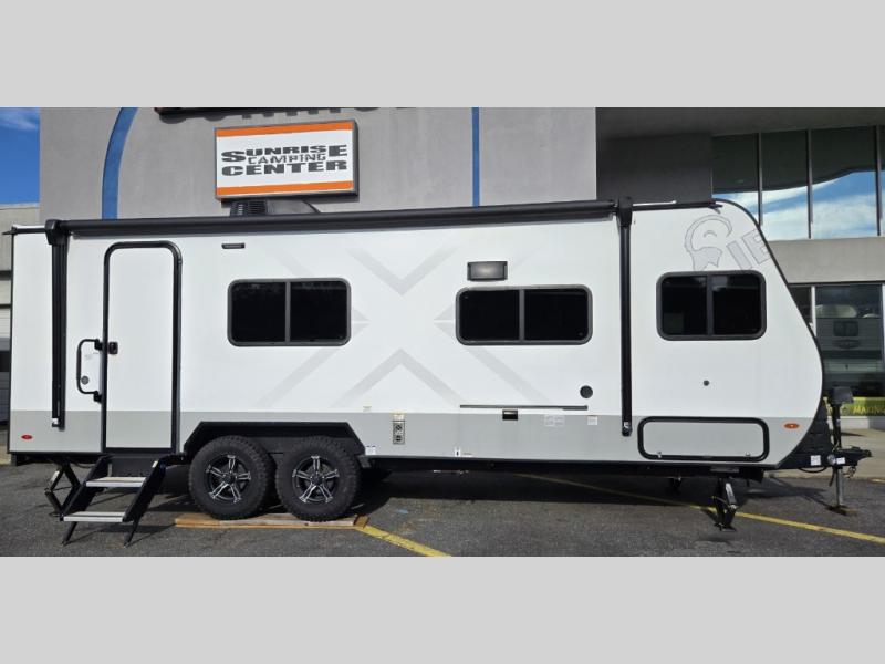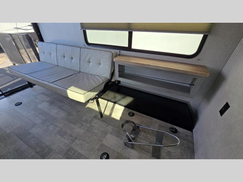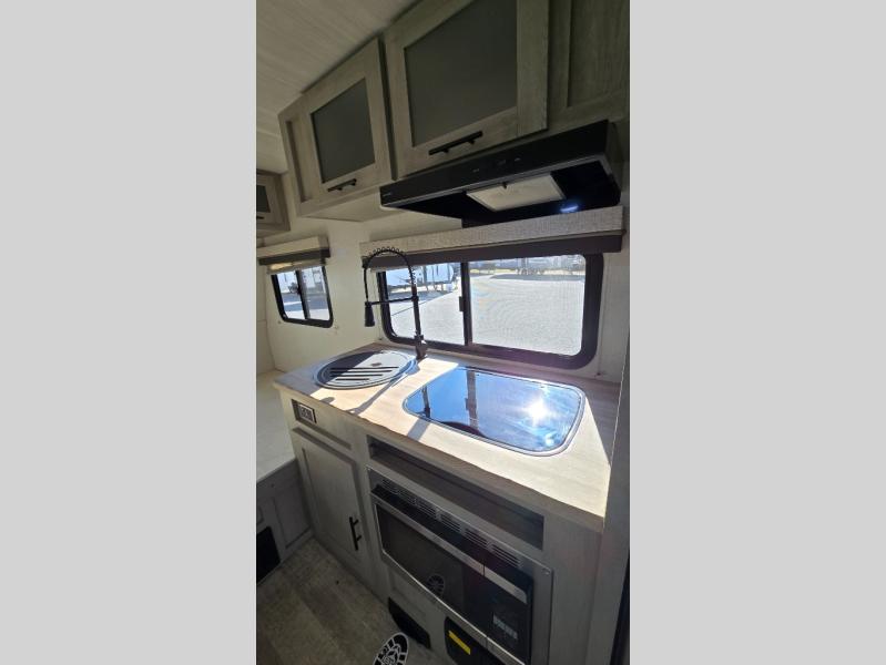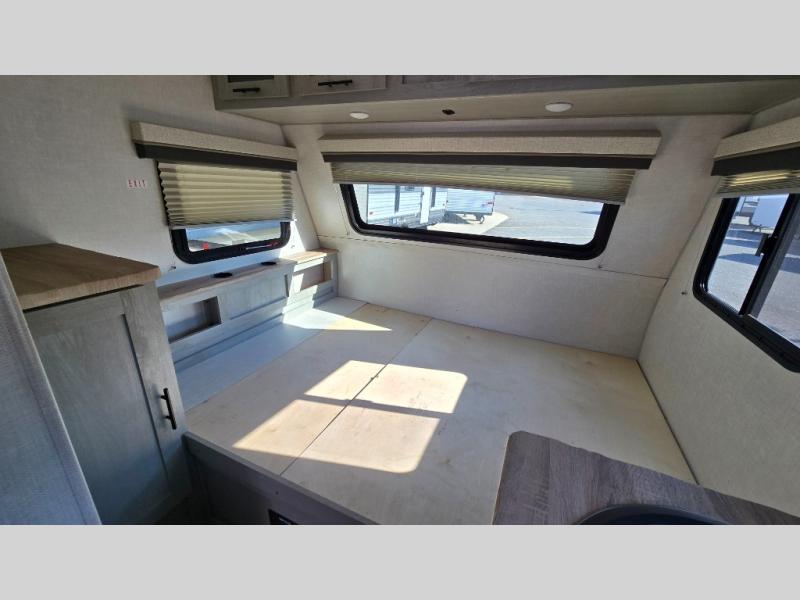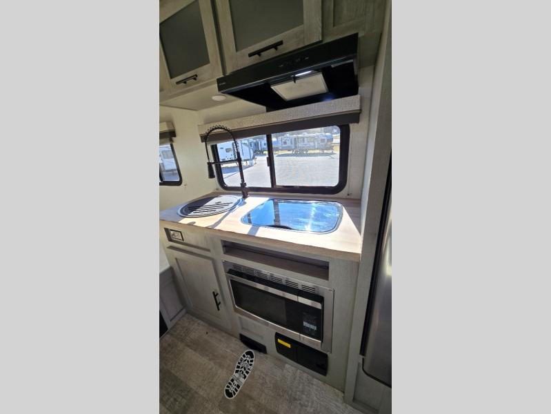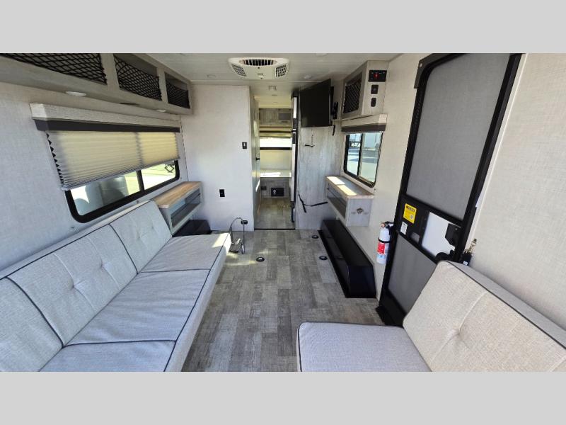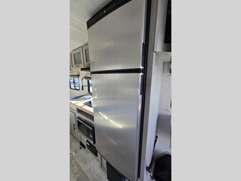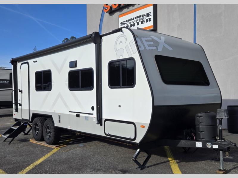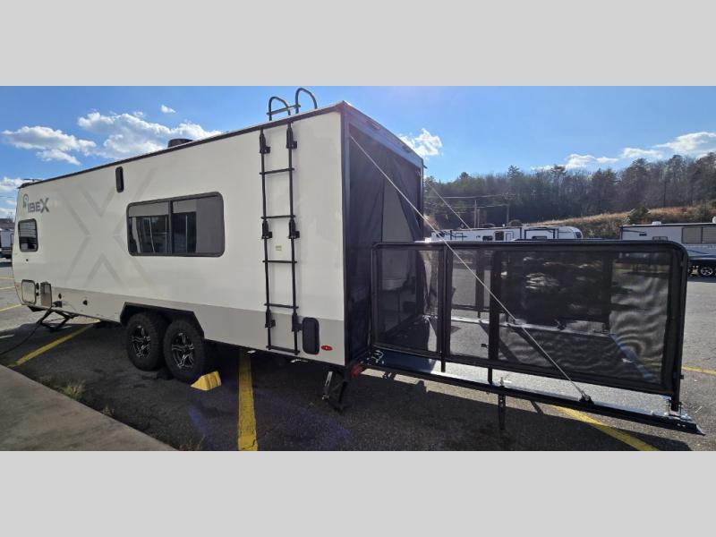 With any IBEX travel trailer or toy hauler by Forest River, the interior offers stainless steel appliances for style, seamless countertops for durability and easy care, and a largest-in-class refrigerator for more cold storage. The Azdel construction and PVC roof will help extend the life of your unit, and the all terrain tires and increased ground clearance means you can go more places. A JBL wireless Bluetooth audio system also comes standard so you can listen to your favorite tunes, along with Rhino-Rack RTV tracks to keep your gear secure!