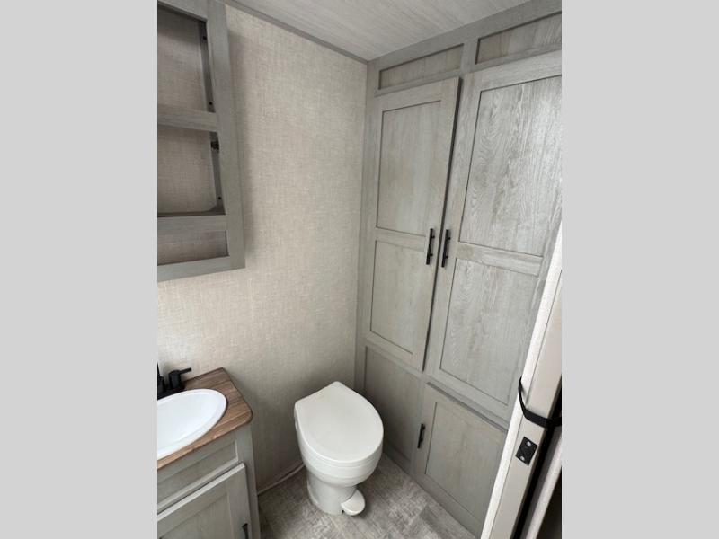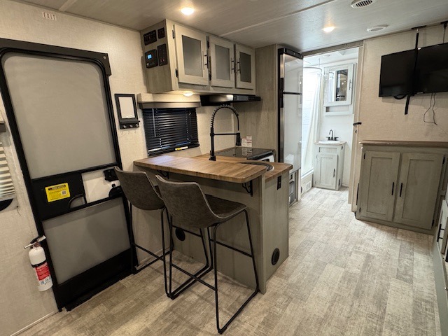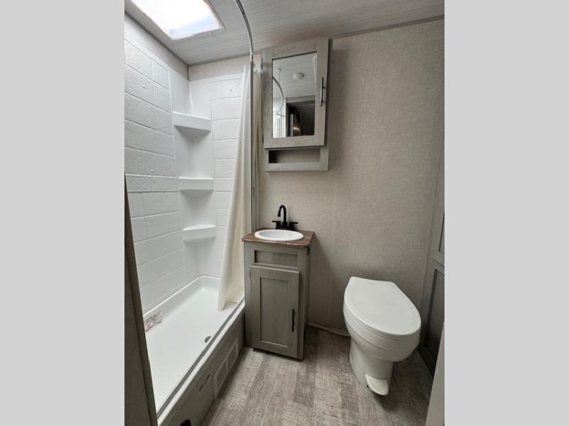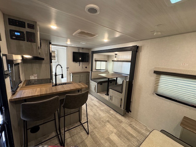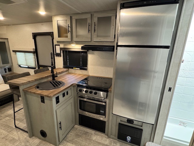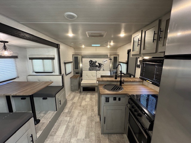 With any IBEX travel trailer or toy hauler by Forest River, the interior offers stainless steel appliances for style, seamless countertops for durability and easy care, and a largest-in-class refrigerator for more cold storage. The Azdel construction and PVC roof will help extend the life of your unit, and the all terrain tires and increased ground clearance means you can go more places. A JBL wireless Bluetooth audio system also comes standard so you can listen to your favorite tunes, along with Rhino-Rack RTV tracks to keep your gear secure!