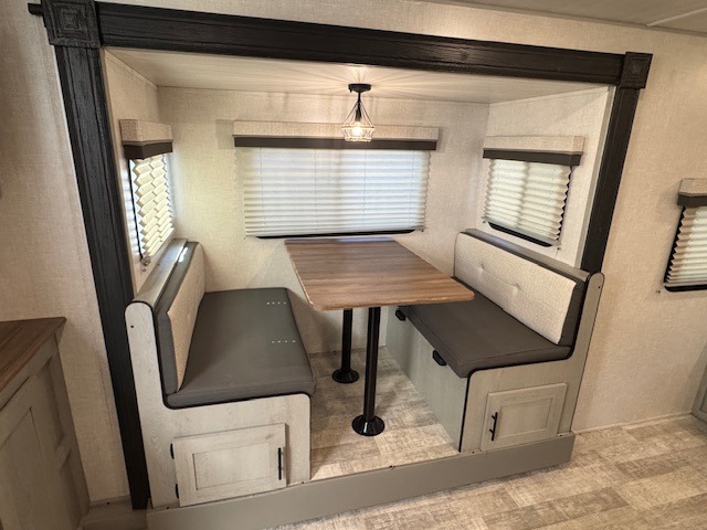 This Forest River IBEX travel trailer has a clever use of space that gives you a lot of options. The kitchen features a seamless L-shaped countertop with bar stool seats, or you can eat at the booth dinette that is tucked into its own slide out so there's plenty of floor space. The sofa is across from the entertainment center, so you can watch the 32" TV or relax. When it's time for bed, there's a 60" x 80" Murphy bed which will be super comfortable for a good night's sleep! The rear bath has a roomy shower and a wardrobe to store all your things. And you might like to add the optional Unplugged Package that comes with premium lithium-ion batteries, an easy view control panel, a high efficiency A/C, and more!