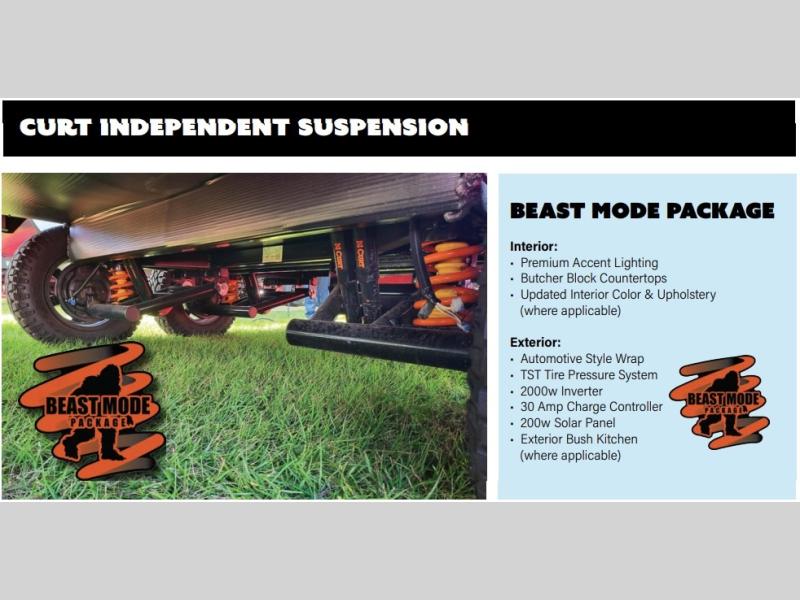 Adventure with brains and brawn. The Coachmen Ibex 20MDS packs big comfort into a lightweight design, and the Beast Mode Package with CURT Independent Suspension delivers smoother towing and true off-road confidence. Built for campsites others can’t reach.