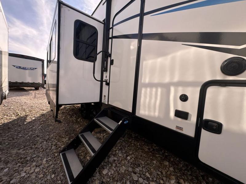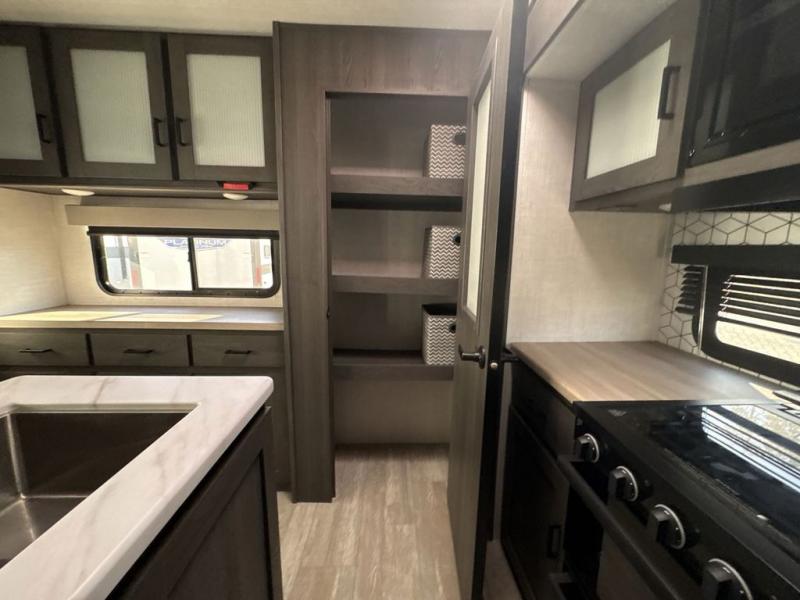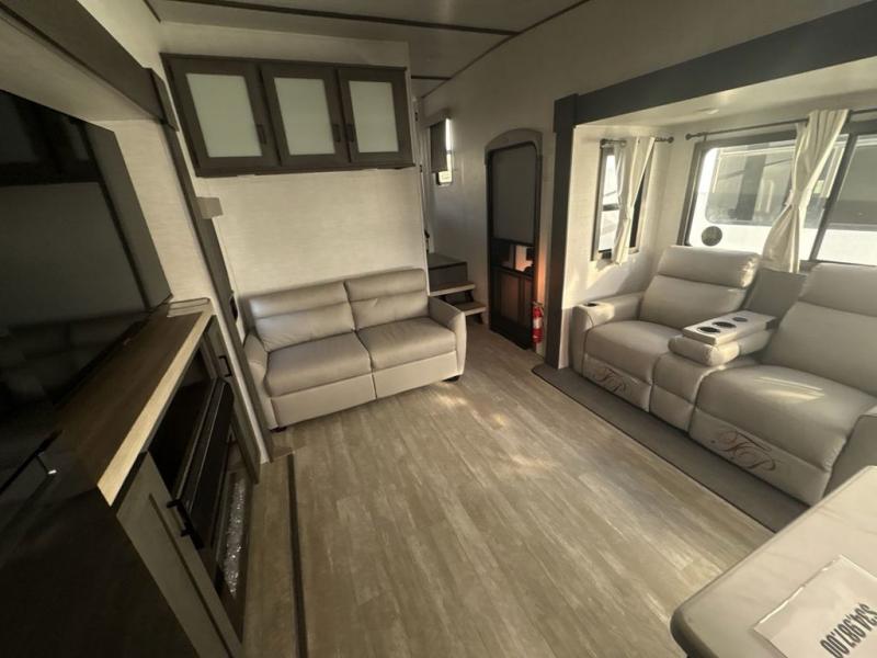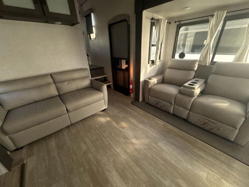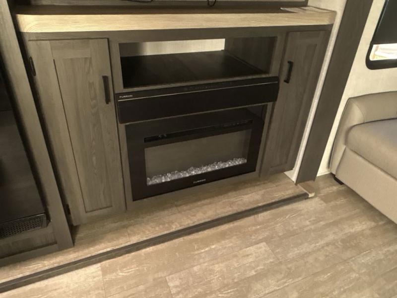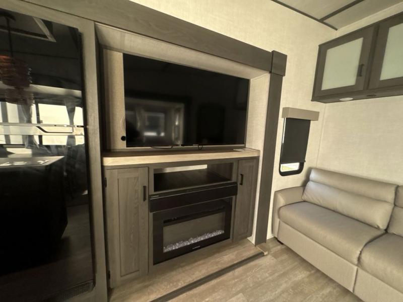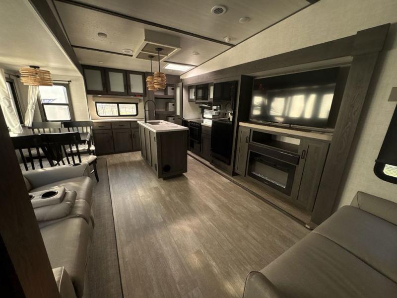 This fifth wheel is spacious, inviting and comfortable! Walk right inside to the combined kitchen and living area with two opposing slides, or walk around the kitchen island to access the floor-to-ceiling pantry. There is a large counter space plus lots of upper and lower cabinets for your dishes, games, and such. You can dine or even work at the free standing dinette with chairs, and relax on the theater seats with USB ports or the tri-fold hide-a-bed sofa while watching the 50" LED TV with soundbar and enjoying the fireplace below. Get cleaned up in the full bathroom and fall quickly to sleep on the walk-around queen bed in the front bedroom that includes three wardrobes, a space prepped for a washer/dryer option, plus nightstands.