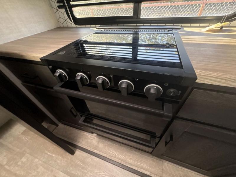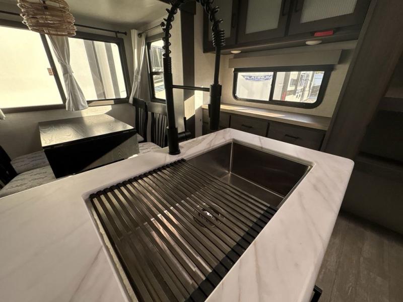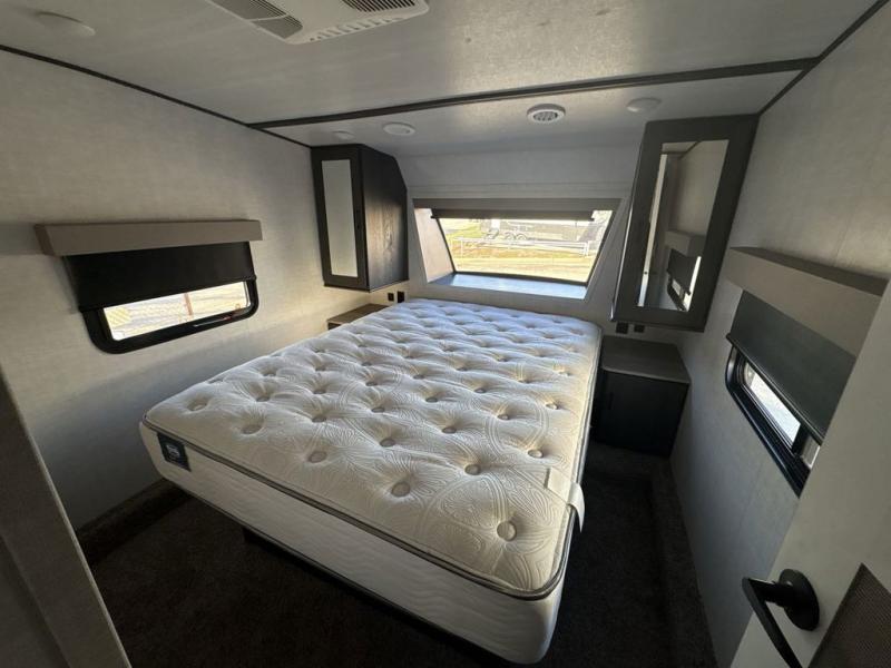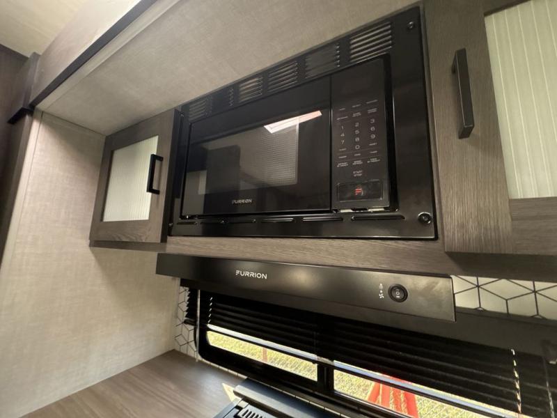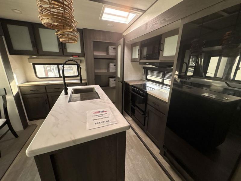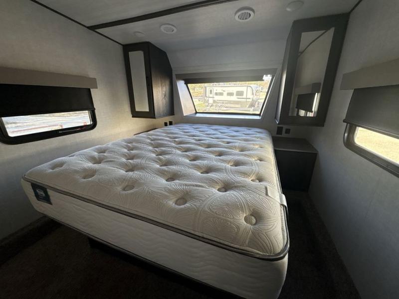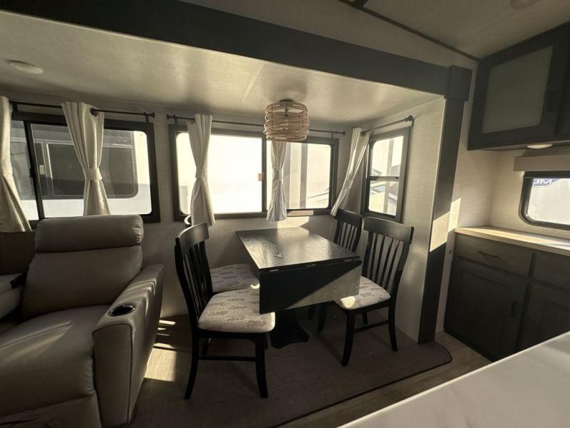 This fifth wheel is spacious, inviting and comfortable! Walk right inside to the combined kitchen and living area with two opposing slides, or walk around the kitchen island to access the floor-to-ceiling pantry. There is a large counter space plus lots of upper and lower cabinets for your dishes, games, and such. You can dine or even work at the free standing dinette with chairs, and relax on the theater seats with USB ports or the tri-fold hide-a-bed sofa while watching the 50" LED TV with soundbar and enjoying the fireplace below. Get cleaned up in the full bathroom and fall quickly to sleep on the walk-around queen bed in the front bedroom that includes three wardrobes, a space prepped for a washer/dryer option, plus nightstands.