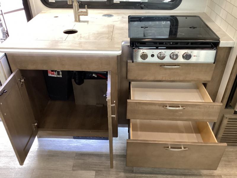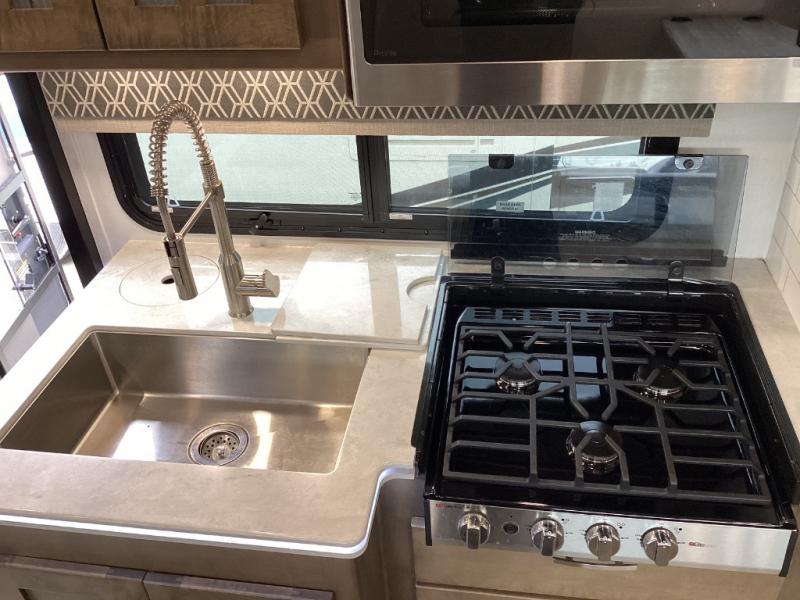 Features a full residential-style interior kitchen, booth dinette, and salon-style living plus a luxurious bath with spa-style shower and skylight. -