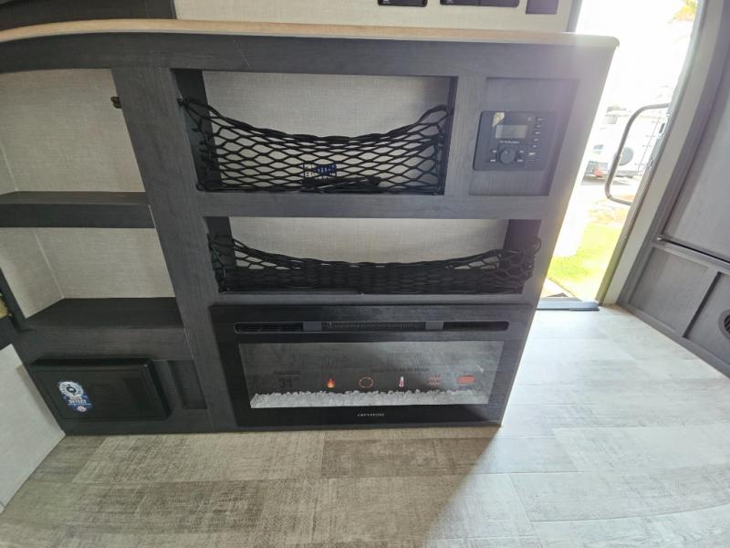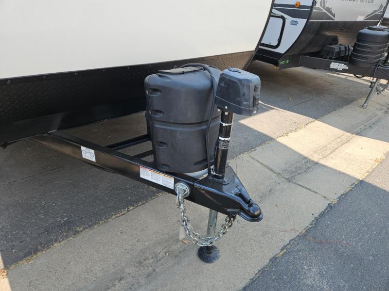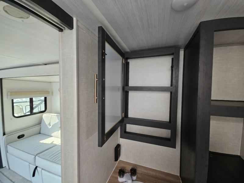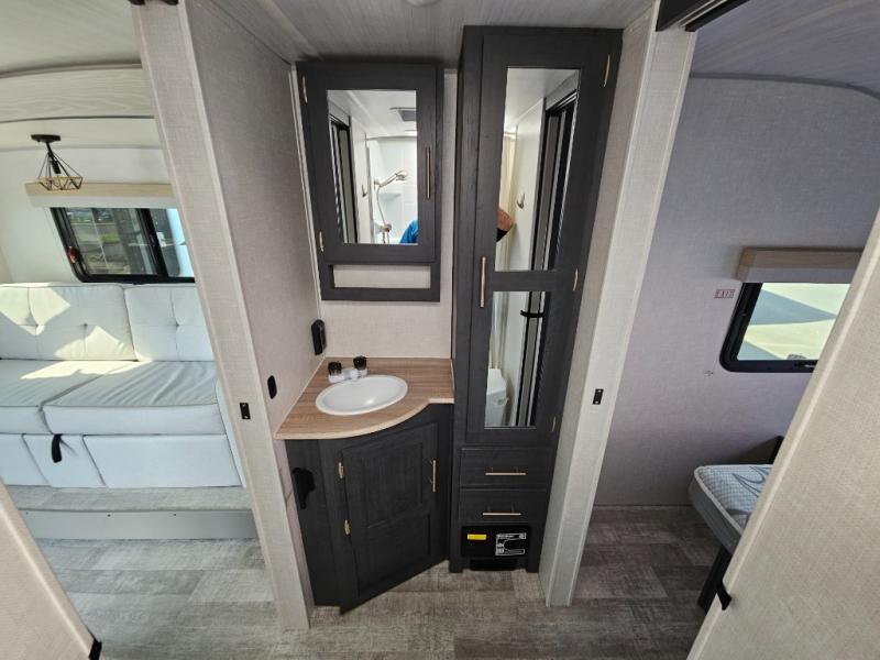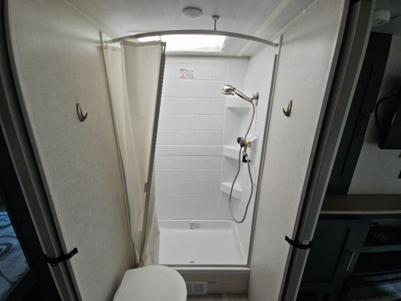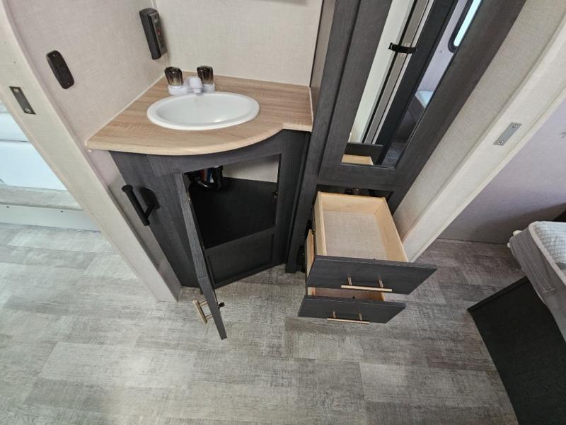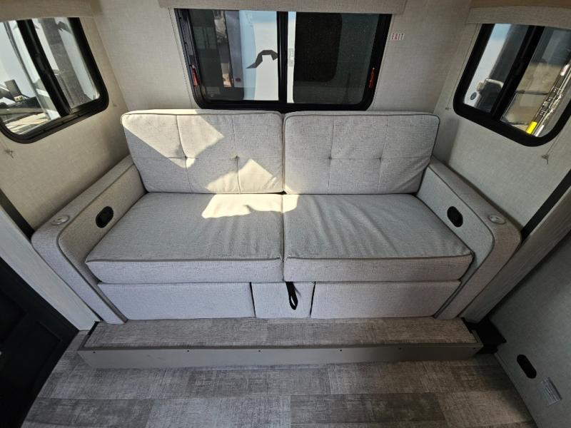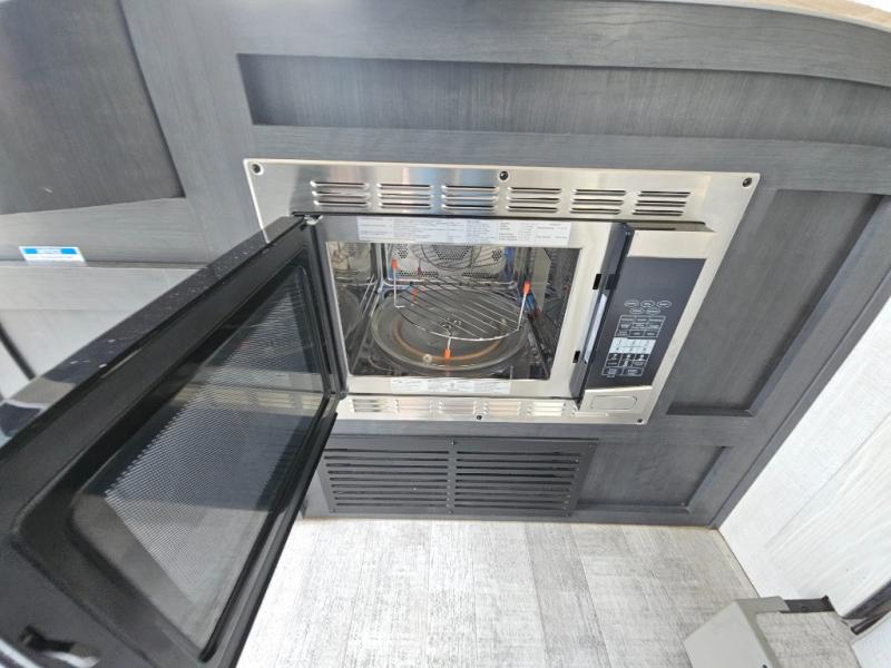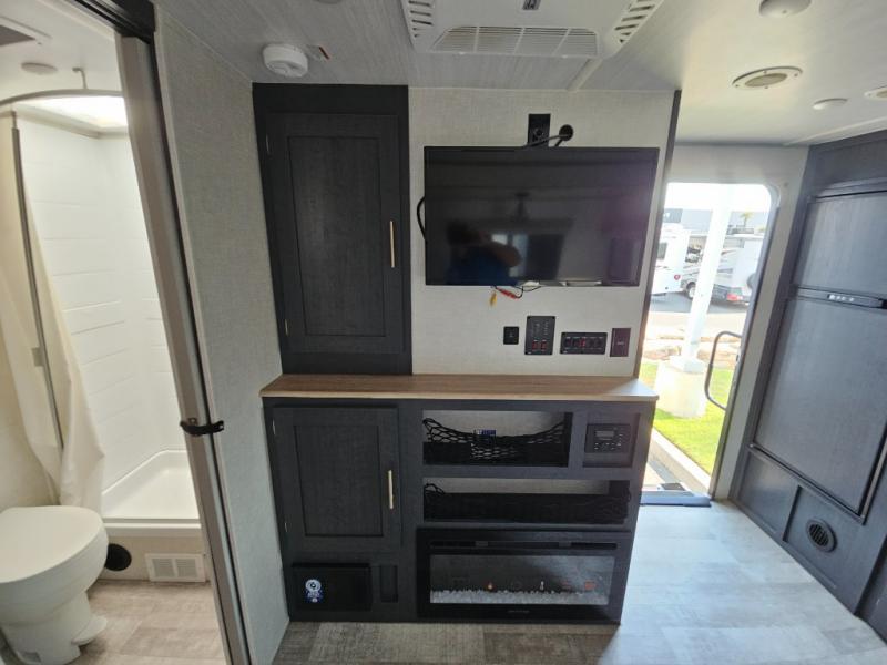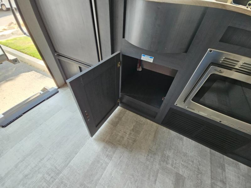 A private bedroom with a walk-around RV queen bed, a walk-through bathroom, and an outside kitchen are a few of the features that you are sure to want in your next RV! You can rest comfortably each night, plus all your clothing can be stored in the dual wardrobes to keep everything tidy. Everyone will stay clean with the full bathroom only steps away, and there is linen storage as well. The main living and kitchen area offers a dinette slide that can also sleep one more camper. The rear kitchen provides everything you will need, plus the outside kitchen with an outdoor griddle and sink gives you more choices. Step inside to start planning your weekend trip!