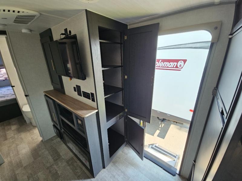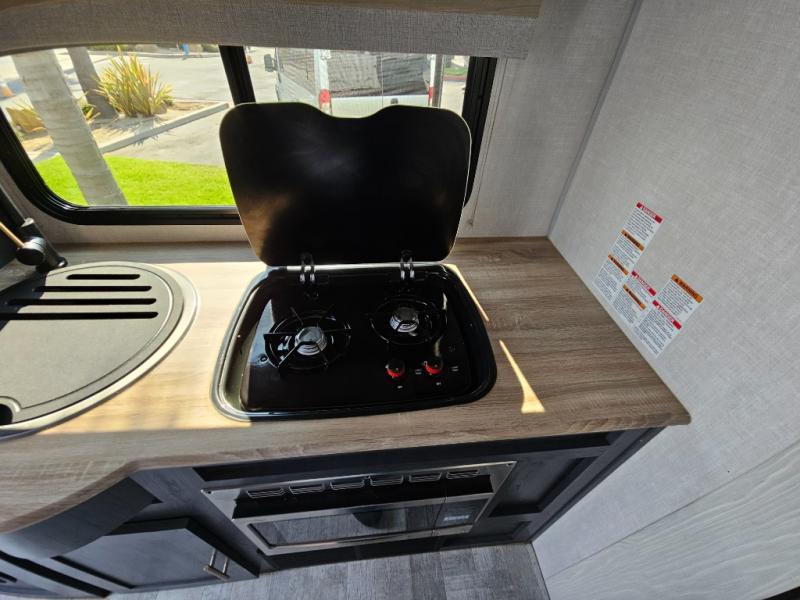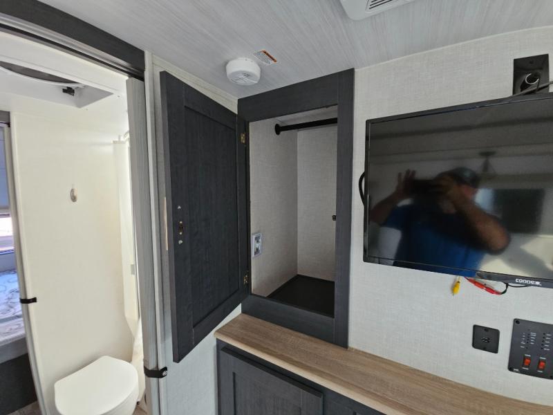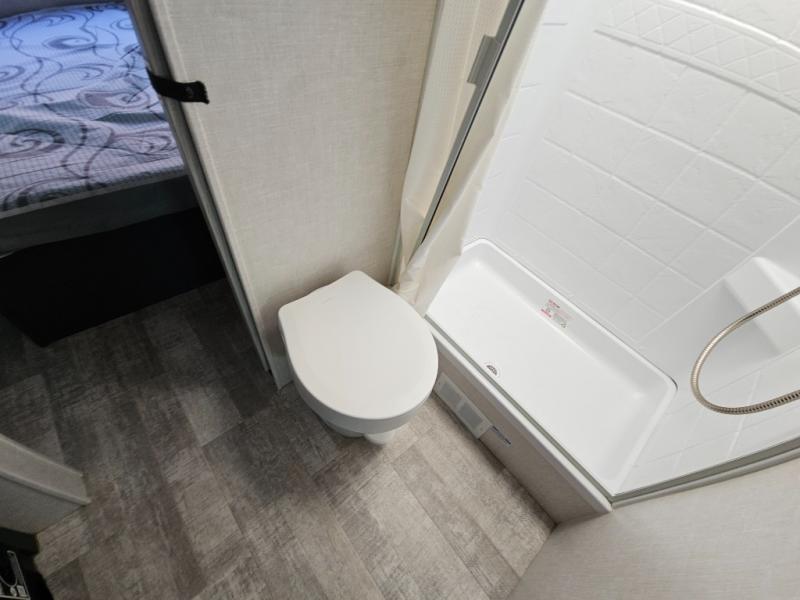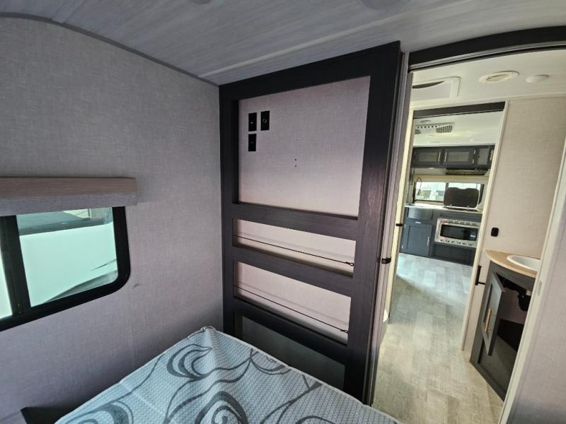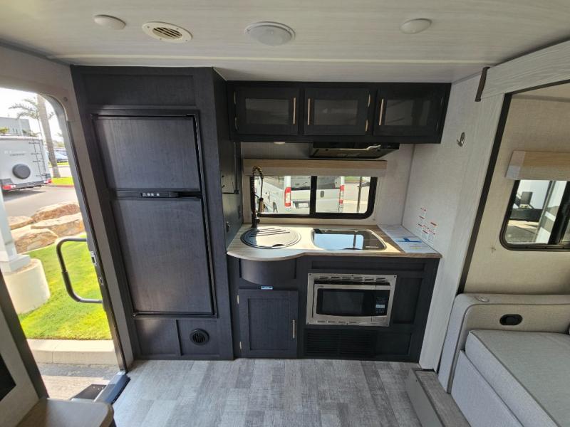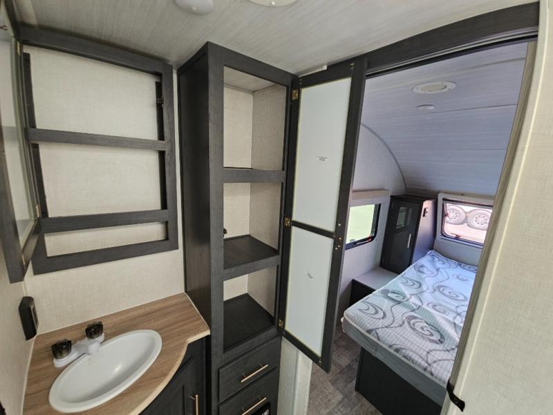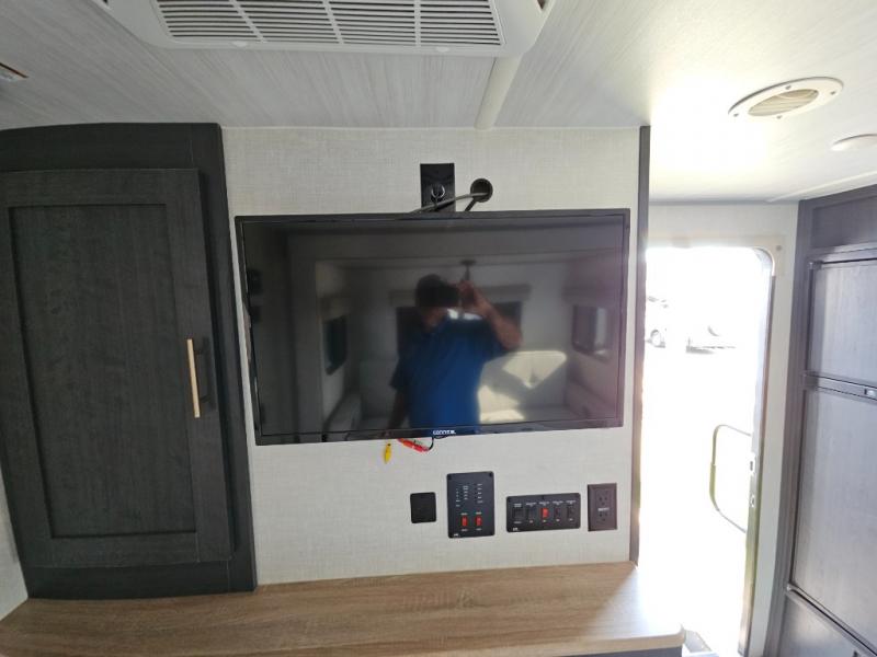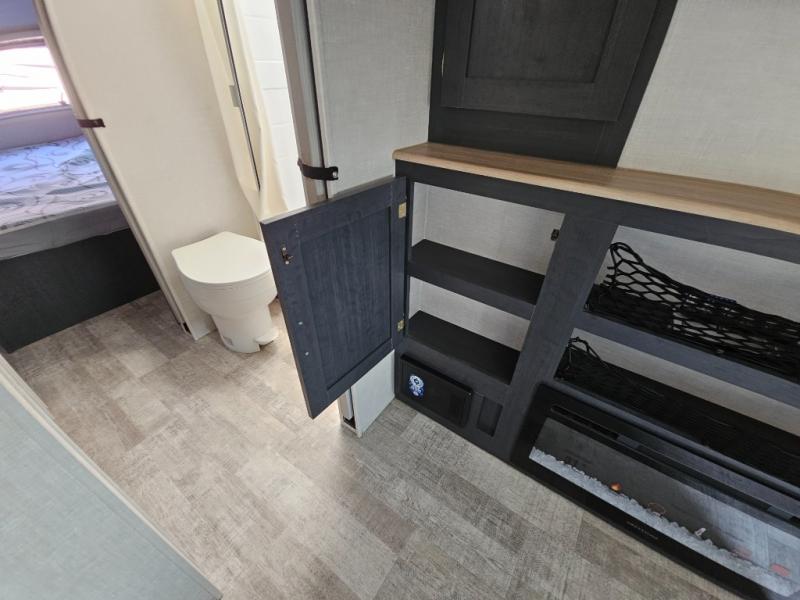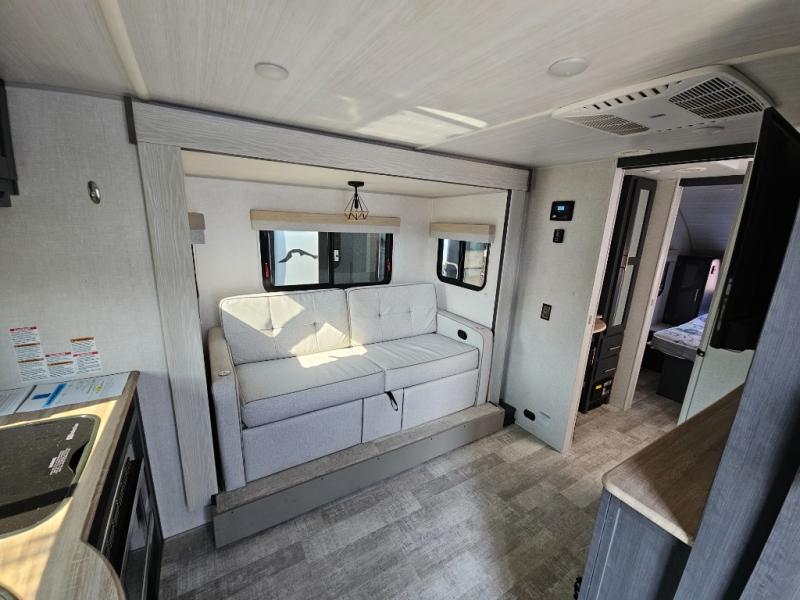 A private bedroom with a walk-around RV queen bed, a walk-through bathroom, and an outside kitchen are a few of the features that you are sure to want in your next RV! You can rest comfortably each night, plus all your clothing can be stored in the dual wardrobes to keep everything tidy. Everyone will stay clean with the full bathroom only steps away, and there is linen storage as well. The main living and kitchen area offers a dinette slide that can also sleep one more camper. The rear kitchen provides everything you will need, plus the outside kitchen with an outdoor griddle and sink gives you more choices. Step inside to start planning your weekend trip!