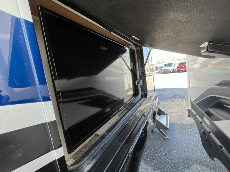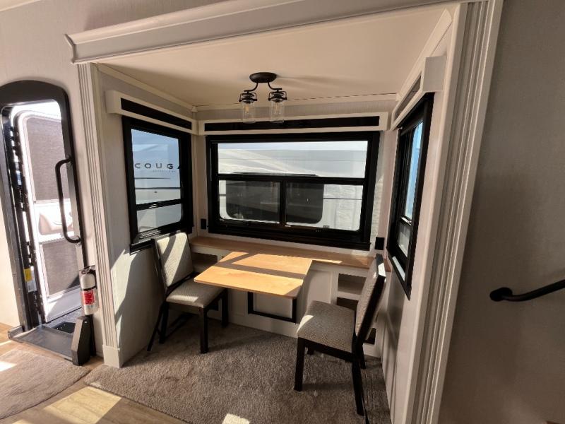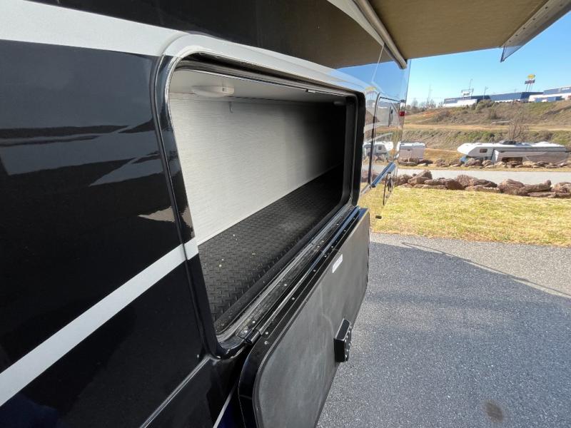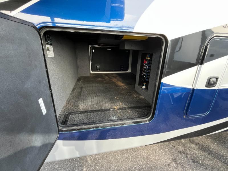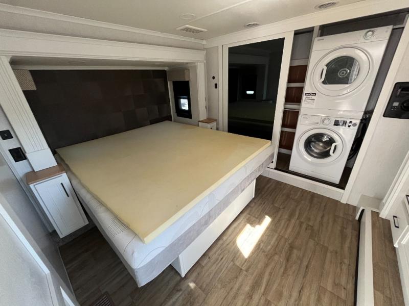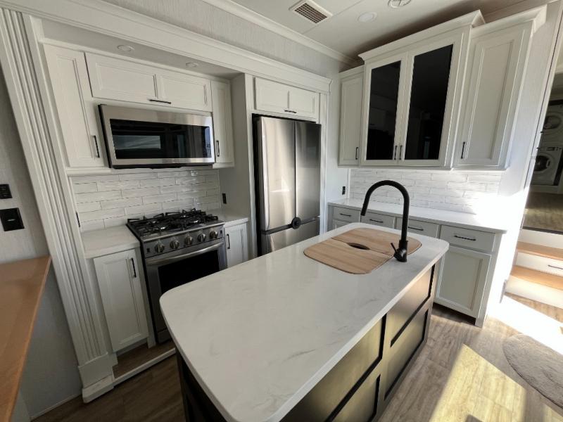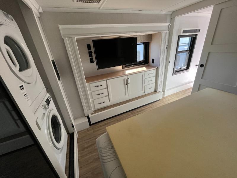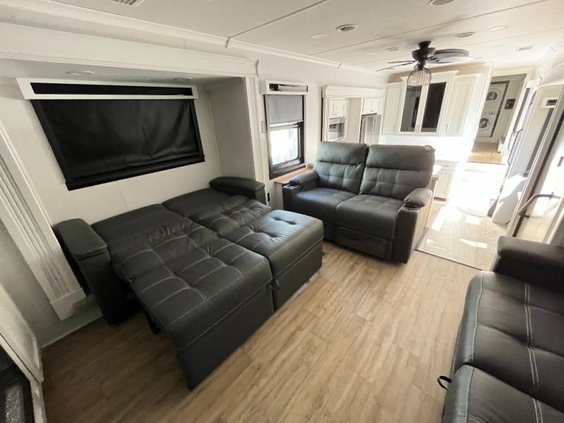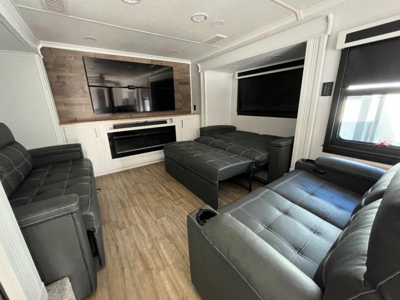 You will be completely impressed with this RiverStone fifth wheel! There is a private bedroom that includes a king-size bed, 40" LED TV, washer/dryer, dresser, and a mirrored wardrobe. The bedroom is right next to the full bathroom where you will find a dual-sink vanity, porcelain toilet with foot flush, shower, and linen closet. The kitchen has opposing slides that keep this space open, and there is a pull-out dinette that you can sit at when it's dinner time. Above the island there is a large Infiniti light, and the ceiling fan will keep the interior cool while you relax. Speaking of relaxing, there's no better place to do that than in the rear den. This separate living area has a theater sofa, two E-Z glide sofas, and an entertainment center with a 65" Samsung LED Smart TV and fireplace.