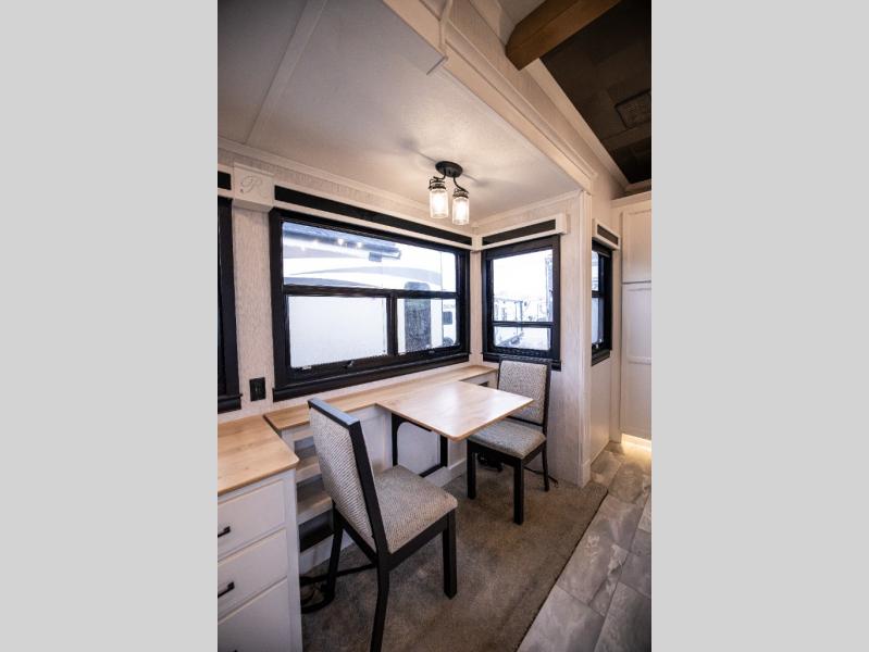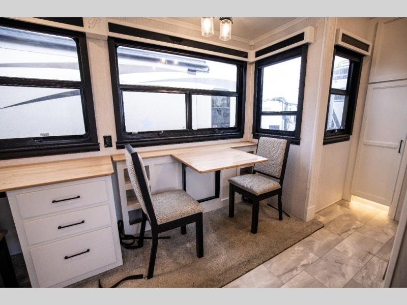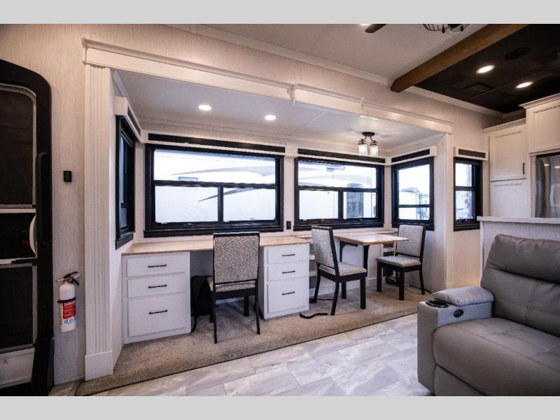 Show your family a good time with this RiverStone fifth wheel! You will get to stay in a super comfortable master suite at the front of this unit which has a dual-sink vanity in the full bathroom. The bedroom offers you a king-size bed that you can rest on while you watch the 40" LED TV across from you, and there is a half bathroom just outside the bedroom for your friends or family to use. If you've decided to bring work with you on the road, you'll be grateful to find a desk in the living area, and the pull-out dinette is a great place to sit down for meals. Work your magic in the kitchen and prepare something delicious on the four-burner range for everyone to eat.