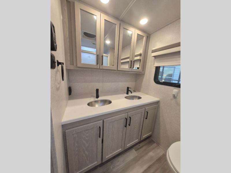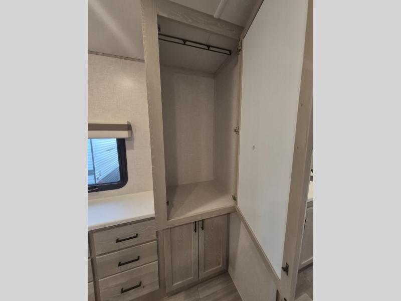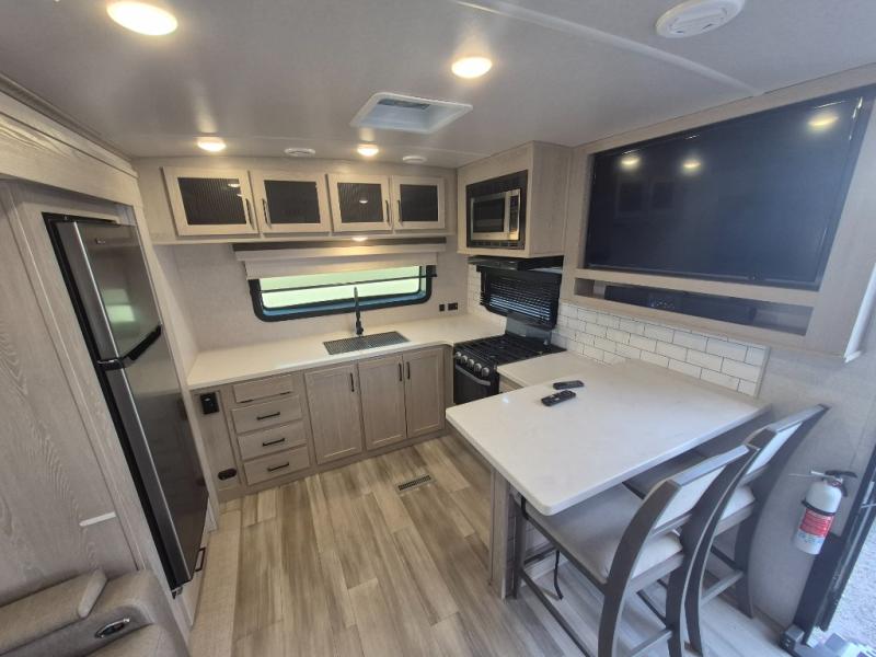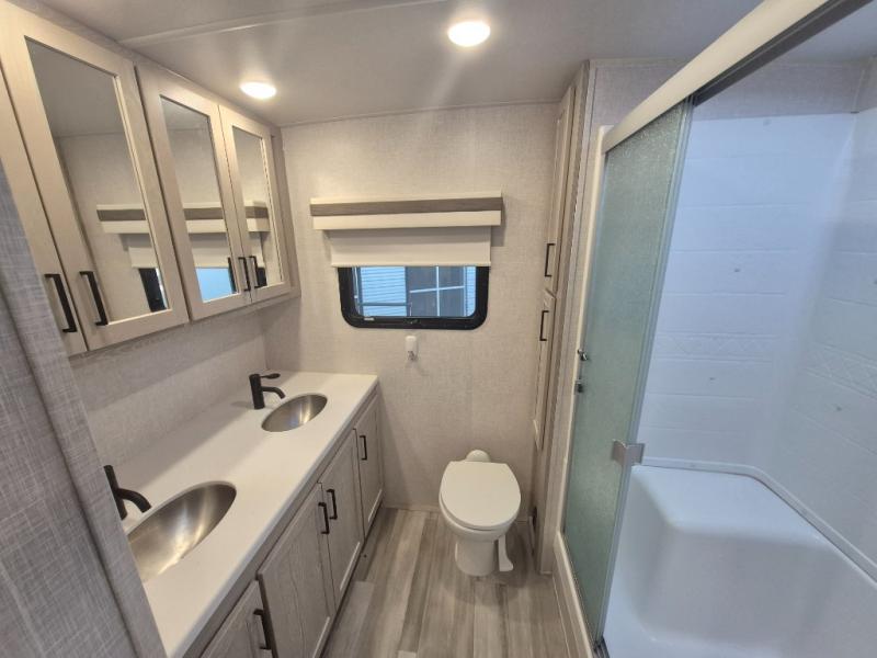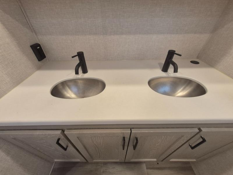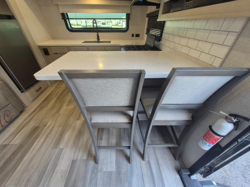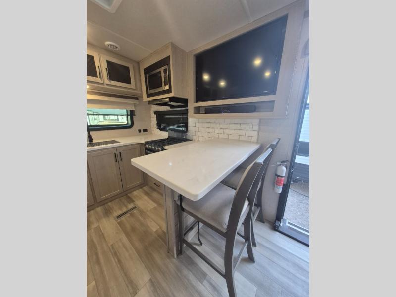 This front kitchen, couple's trailer is ready for adventure when you are! Once you arrive at your destination, prepare a quick lunch on the outside griddle, and enjoy the shade provided by the 19' power awning. You can eat outside, or inside at the counter with stools. The theatre seat will make this travel trailer feel more like home, and the double slides provide more space to stretch out. Within the master bedroom you'll find a king bed, a large wardrobe and a dresser, plus an optional TV. And check out the full rear bath with dual bath sinks and a shower with a seat! Now, that's what I call comfort!