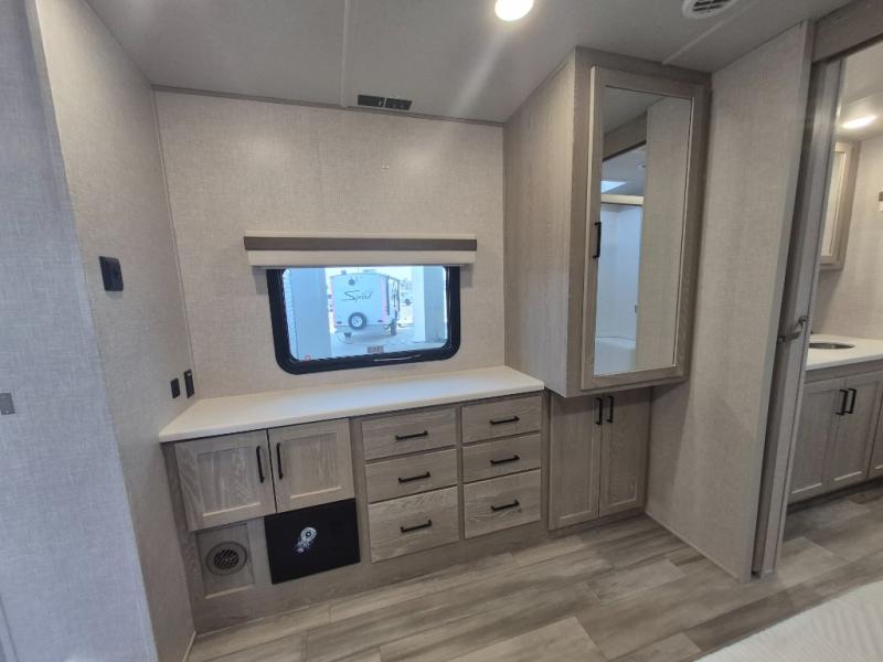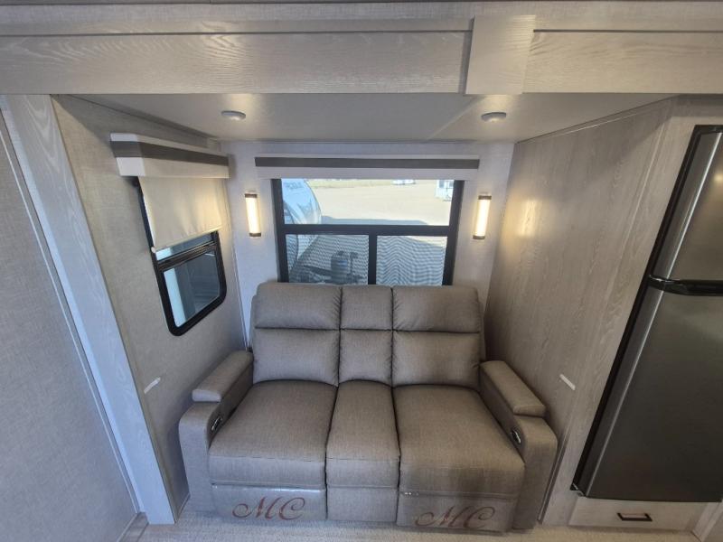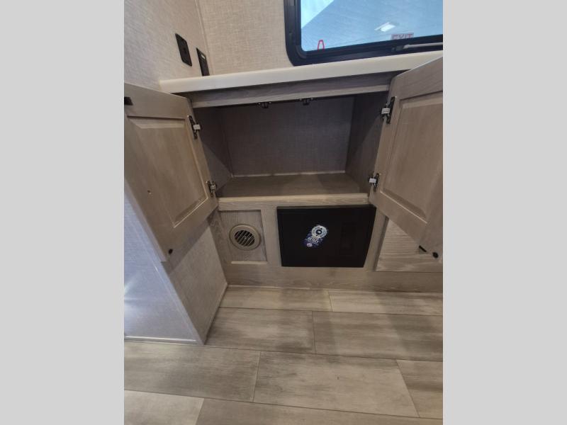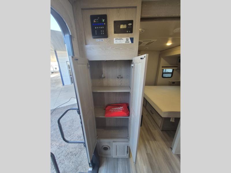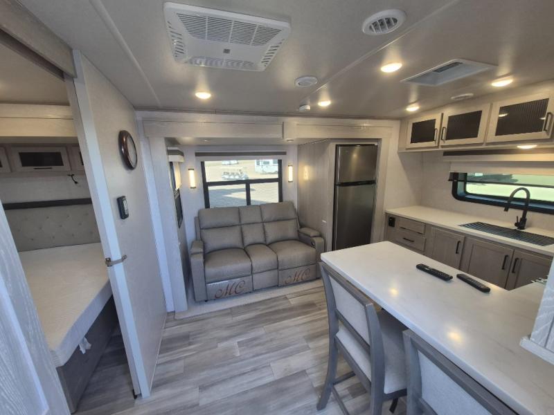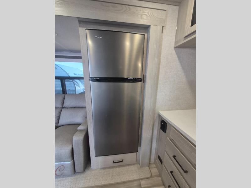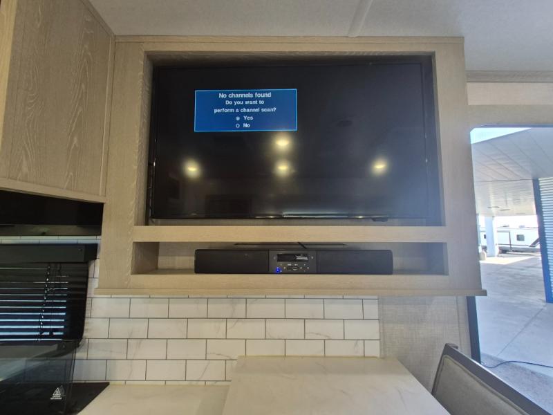 This front kitchen, couple's trailer is ready for adventure when you are! Once you arrive at your destination, prepare a quick lunch on the outside griddle, and enjoy the shade provided by the 19' power awning. You can eat outside, or inside at the counter with stools. The theatre seat will make this travel trailer feel more like home, and the double slides provide more space to stretch out. Within the master bedroom you'll find a king bed, a large wardrobe and a dresser, plus an optional TV. And check out the full rear bath with dual bath sinks and a shower with a seat! Now, that's what I call comfort!