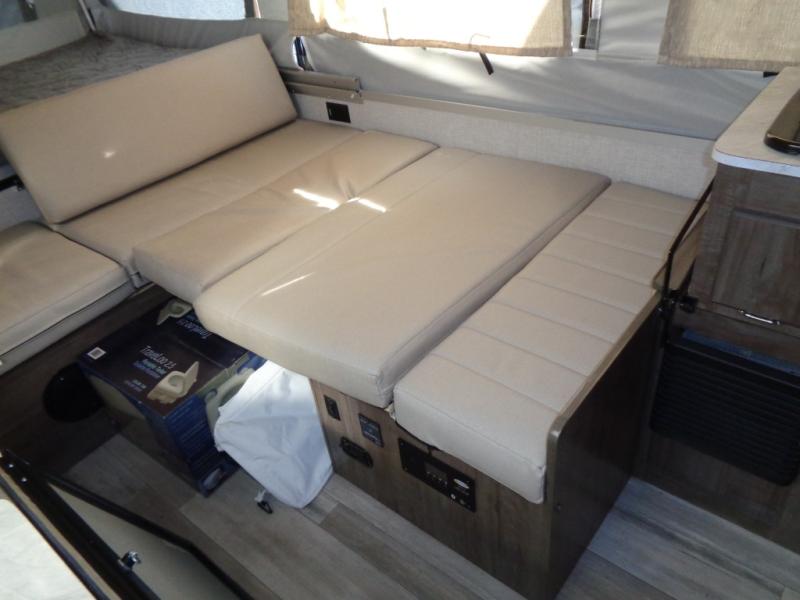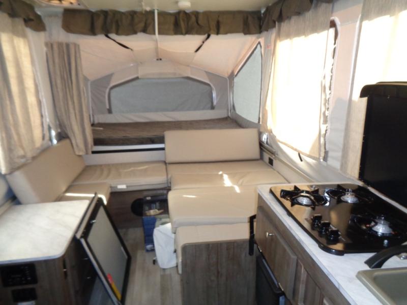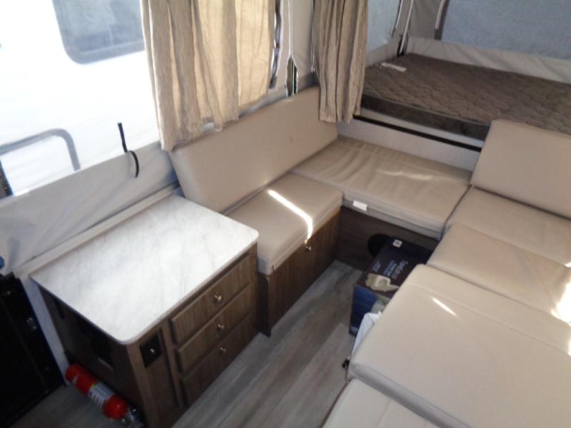 Your family of four to six will love camping in this camper with two tent end beds and an L-shaped dinette with a table extension giving you a place to dine. There is even a Port-a-Pottie for added convenience at night. The cook will have a swing galley with a range and sink to make meals inside as well as an exterior griddle. The interior also offers residential style cabinet doors, full extension metal drawer guides, plus USB charging ports to keep the electronics ready.
