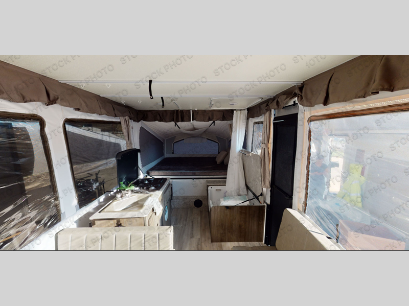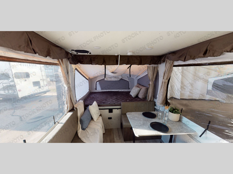 With any Rockwood Extreme Sports Package folding pop-up camper, you will have confidence in the construction from the powder coated tubular steel frame, the fiberglass vacuum bonded radius roof with no center seam, the five-piece Vinolon Supreme tenting, and the full perimeter aluminum bed frames. The ESP Extreme package provides features such as aluminum wheels with 15" Mud Rover tires for better ground-clearance to reach places most RVs wouldn't try, a 200W roof mount solar panel with 1000W inverter, ProRac permanent crossbars, and a power roof lift, plus more. And the interior offers conveniences and comforts while exploring the boundaries.