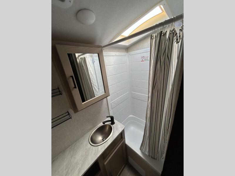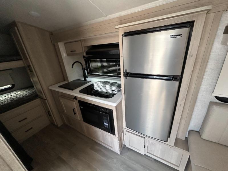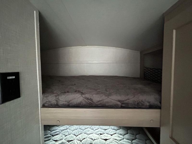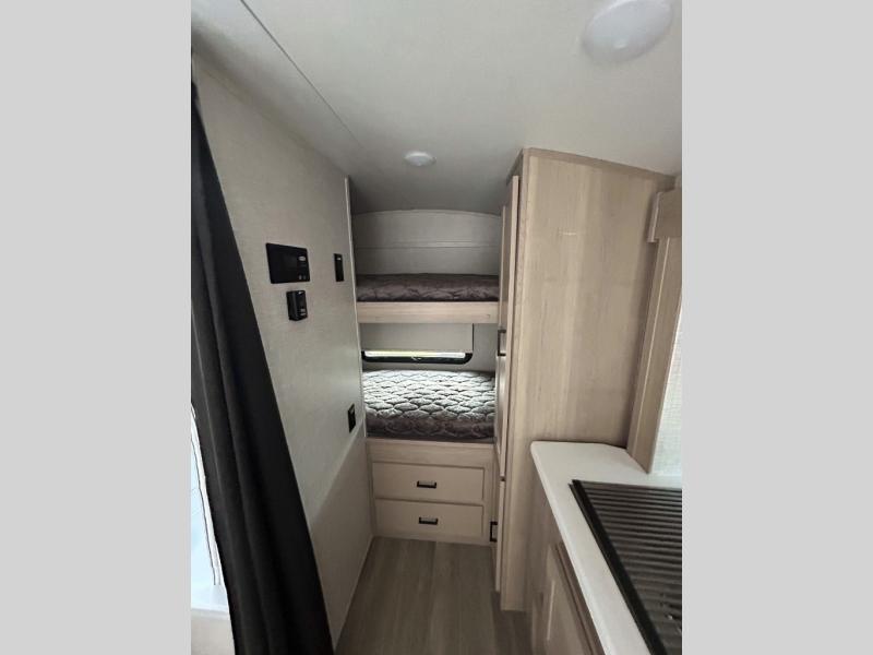 This travel trailer with bunk beds will be perfect for family camping or weekend trips to the lake with friends. There is a U-shaped dinette up front that can convert to a 54" x 82" bed and plenty of overhead compartments for your belongings. The chef of your group can prepare meals on the three burner cooktop within the slide out, and there is a wardrobe by the bunks for extra storage. This model also includes a full bath with a foot flush toilet, a Shower Miser Water Saver, and a Maxxair ventilation fan to keep everything fresh.