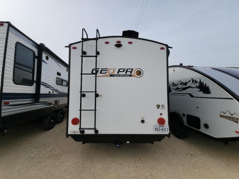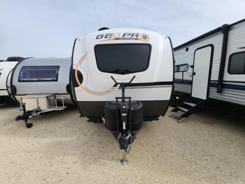 The Rockwood GEO Pro travel trailers and toy hauler by Forest River are ready for all your adventures. The interior and exterior Azdel construction, along with the vacuum laminated roof and walls provide a durable trailer, and the Dexter torsion axles with aluminum wheels make towing easier than ever. There are many convenient amenities, like the 13,500 BTU A/C, the Bluetooth system control panel, and the all-in-one Teton HD TV/WiFi/FM antenna with LTE prep. Each model includes frameless windows, fabric valances and roller shades, and a modern interior that will make you feel right at home. Everything you're looking for in your next RV is in a Rockwood GEO pro by Forest River!