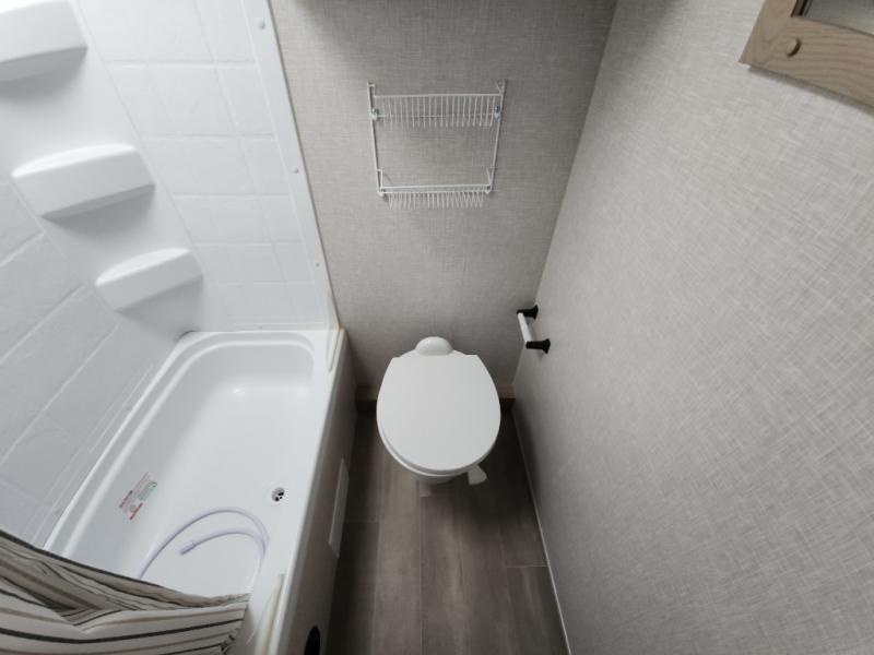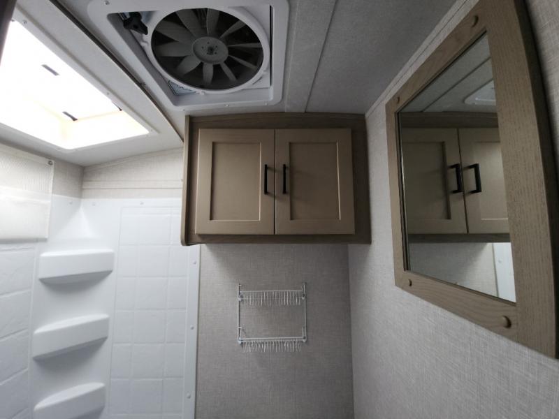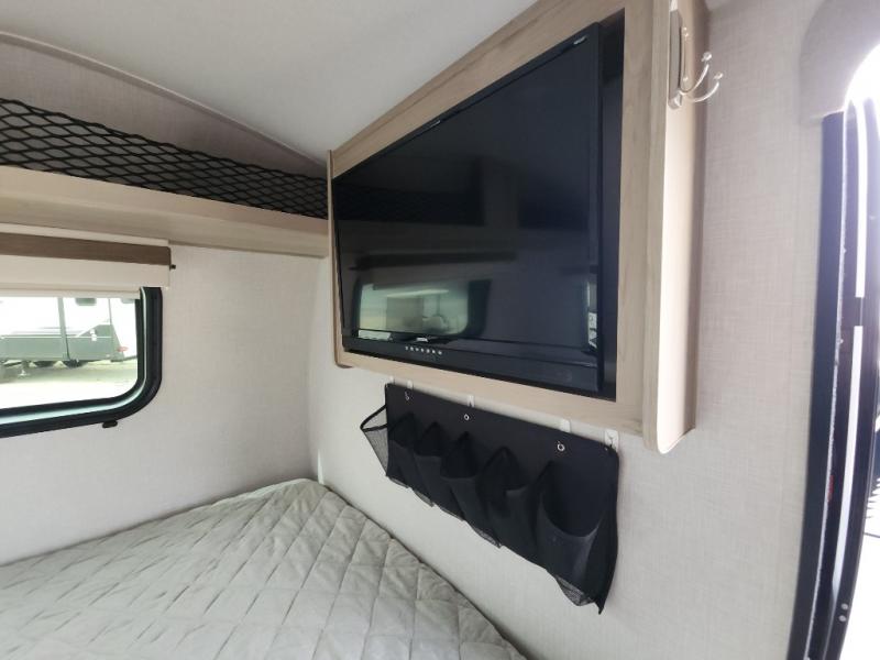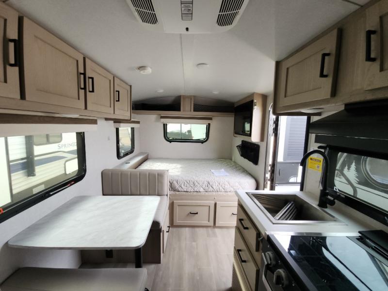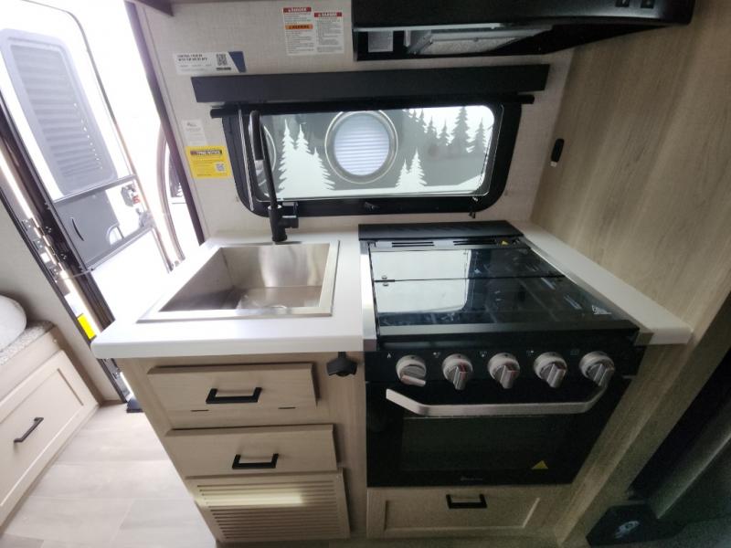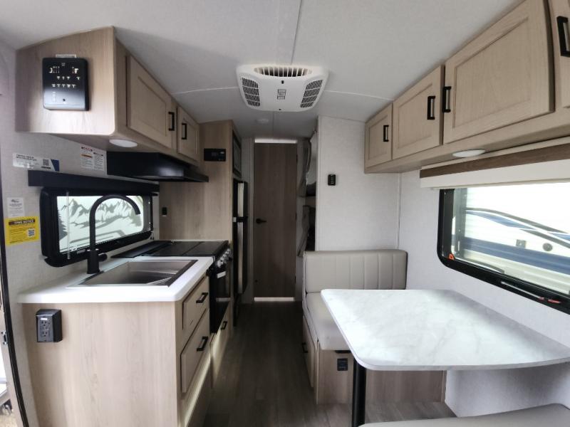 This no slide travel trailer is the perfect lightweight RV for those that love to move around to different campsites. It will be so easy packing up the lawn chairs in the exterior bike door, and there is a rear ladder if you need to clean off the top of your unit. Once you arrive at your destination, put out the 13' power awning, then make lunch on the outside griddle. You will also find a three burner cooktop indoors and a booth dinette where you dine together. This area can be a sleeping space for a small child or adult, plus there is a full-size bed up front and bunk beds in the back.