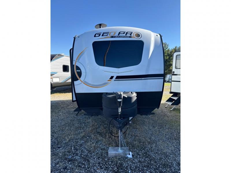 The Rockwood GEO Pro travel trailers and toy hauler by Forest River are ready for all your adventures. The interior and exterior Azdel construction, along with the vacuum laminated roof and walls provide a durable trailer, and the Dexter torsion axles with aluminum wheels make towing easier than ever. There are many convenient amenities, like the 13,500 BTU A/C, the Bluetooth system control panel, and the all-in-one Teton HD TV/WiFi/FM antenna with LTE prep. Each model includes frameless windows, fabric valances and roller shades, and a modern interior that will make you feel right at home. Everything you're looking for in your next RV is in a Rockwood GEO pro by Forest River!