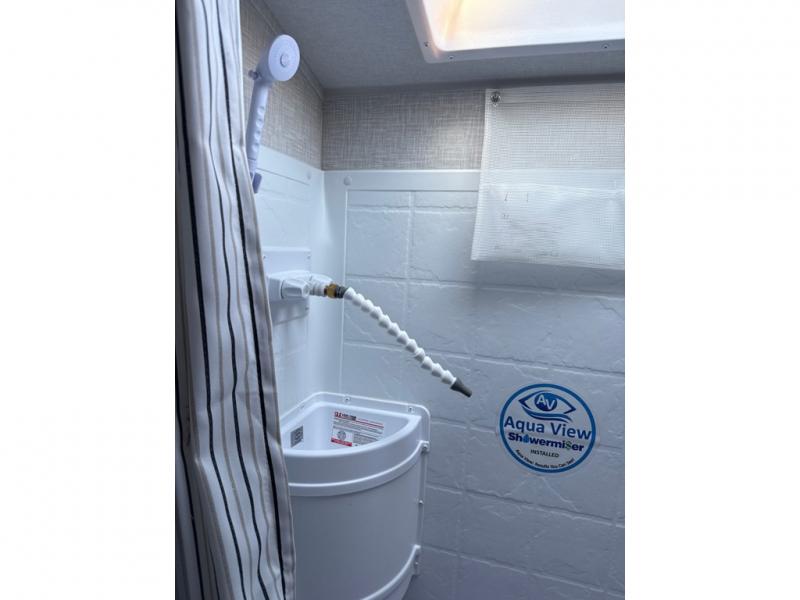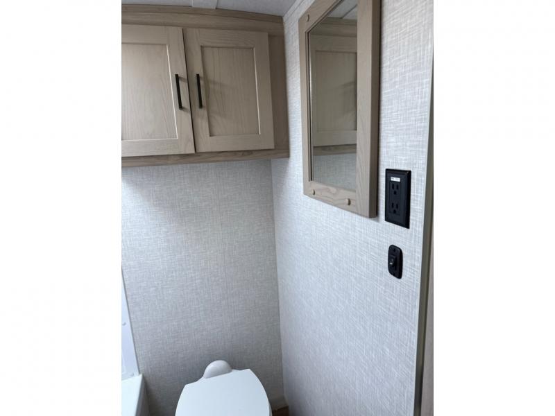 This no slide travel trailer is the perfect lightweight RV for those that love to move around to different campsites. It will be so easy packing up the lawn chairs in the exterior bike door, and there is a rear ladder if you need to clean off the top of your unit. Once you arrive at your destination, put out the 13' power awning, then make lunch on the outside griddle. You will also find a three burner cooktop indoors and a booth dinette where you dine together. This area can be a sleeping space for a small child or adult, plus there is a full-size bed up front and bunk beds in the back.