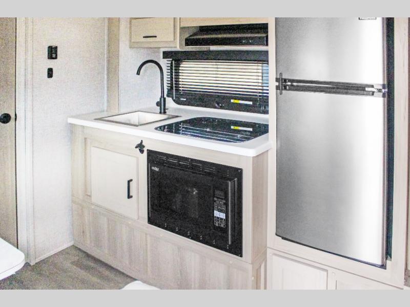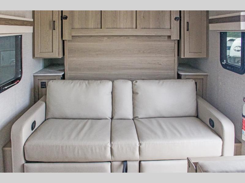 Comfortable sleeping space, convenient seating space, and a full rear bath makes this couple's trailer the one! You will love being able to relax on the sofa during the day, and sleep on the Murphy bed at night. There is a single slide out that will provide you more space to move around or cook meals, and the full bath includes a large shower so you won't feel cramped. If it's a rainy day you can watch movies on the 12V TV, and if it's nice out, sit under the 14' power awning and cook lunch on the outside griddle. The possibilities are endless with this couple's trailer!