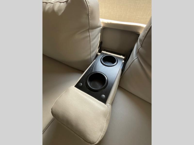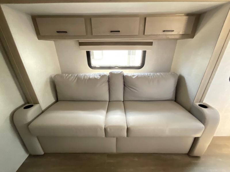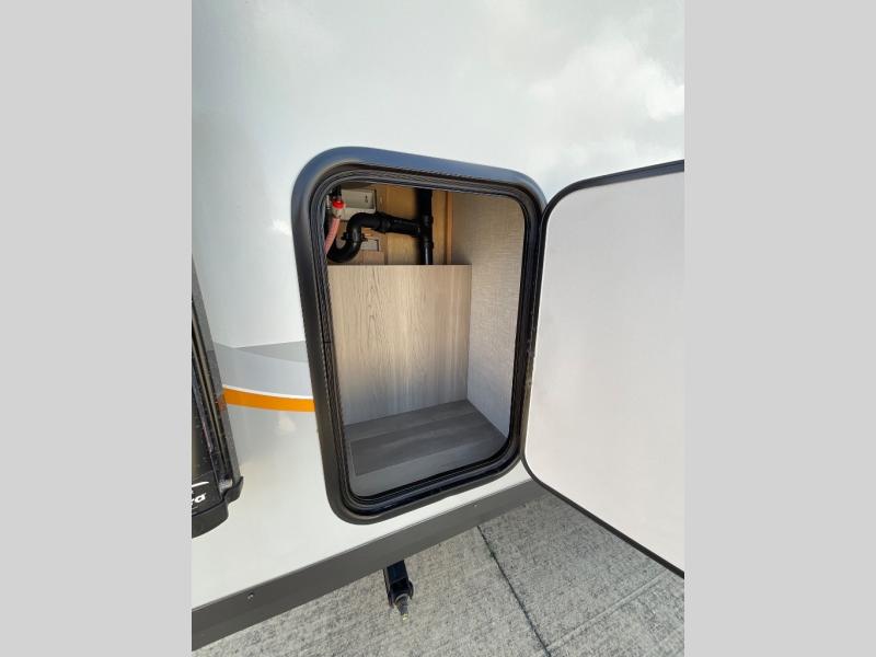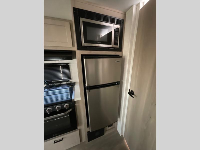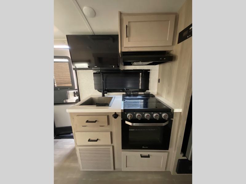This travel trailer will feel more like home with its front bedroom and walk-around full-size bed. You'll enjoy the 12V TV as you relax on the 72" sofa with a table. The full rear bath includes an oversized shower to clean up in each day and there is a linen closet for clean towels. When you're ready to prepare dinner you'll have a three burner cooktop and microwave oven indoors, and a griddle outdoors! And don't forget the exterior storage allows you to bring along beach toys and tackle boxes!
