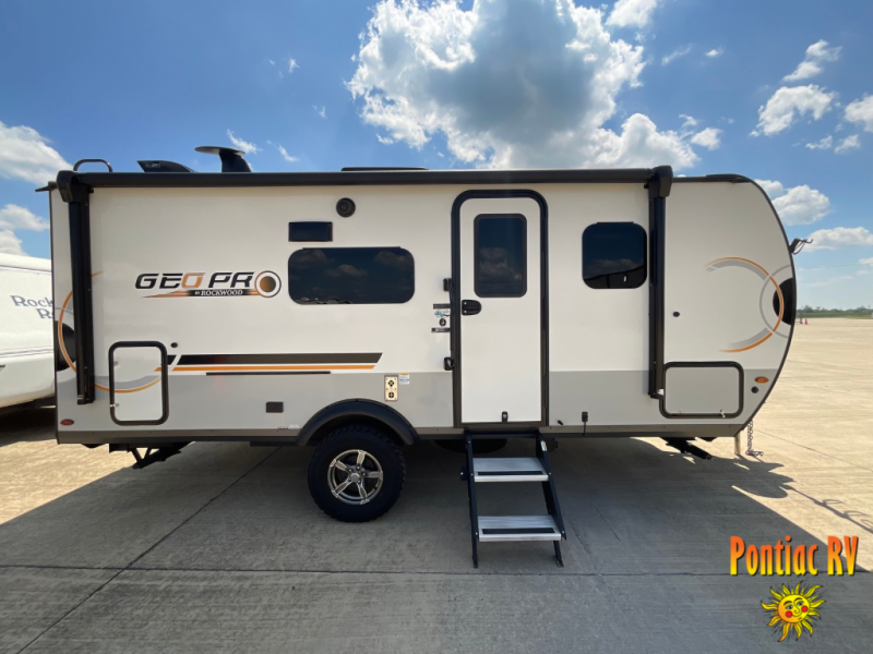 The Rockwood GEO Pro travel trailers and toy hauler by Forest River are ready for all your adventures. The interior and exterior Azdel construction, along with the vacuum laminated roof and walls provide a durable trailer, and the Dexter torsion axles with aluminum wheels make towing easier than ever. There are many convenient amenities, like the 13,500 BTU A/C, the Bluetooth system control panel, and the all-in-one Teton HD TV/WiFi/FM antenna with LTE prep. Each model includes frameless windows, fabric valances and roller shades, and a modern interior that will make you feel right at home. Everything you're looking for in your next RV is in a Rockwood GEO pro by Forest River!