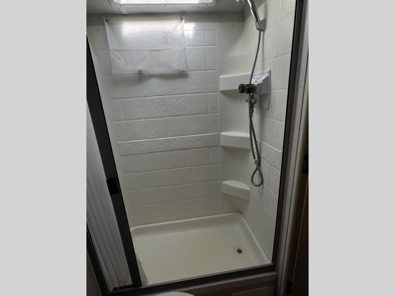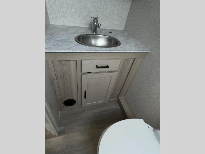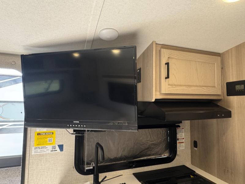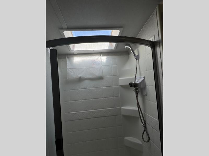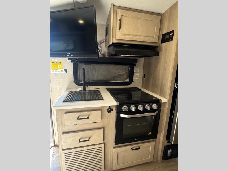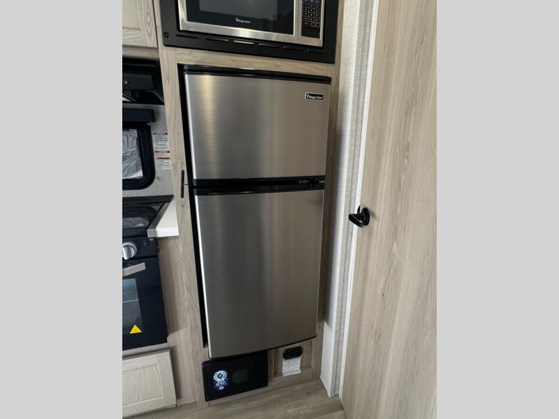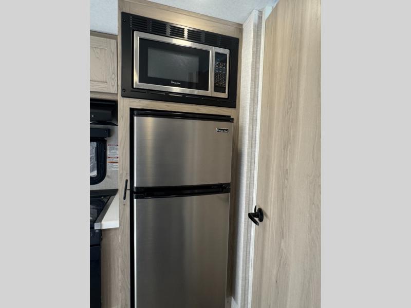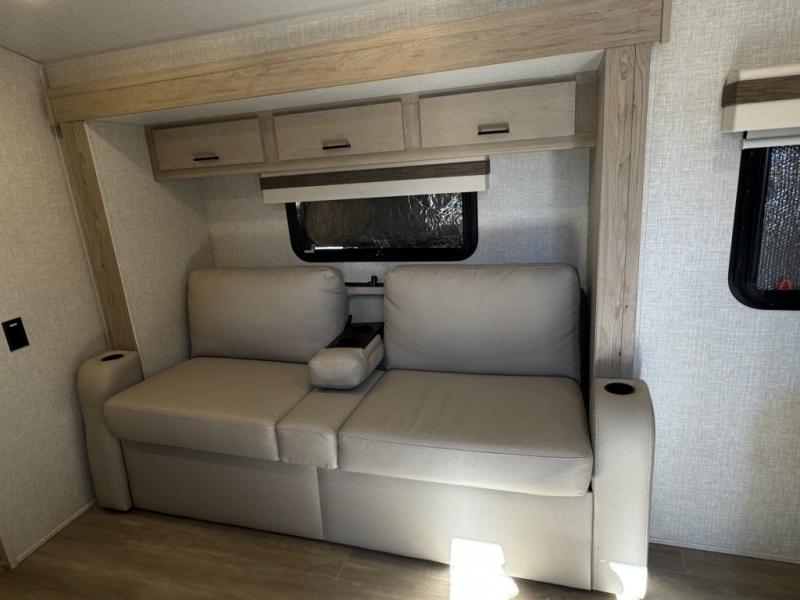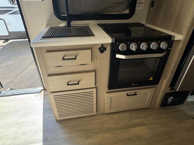 This travel trailer will feel more like home with its front bedroom and walk-around full-size bed. You'll enjoy the 12V TV as you relax on the 72" sofa with a table. The full rear bath includes an oversized shower to clean up in each day and there is a linen closet for clean towels. When you're ready to prepare dinner you'll have a three burner cooktop and microwave oven indoors, and a griddle outdoors! And don't forget the exterior storage allows you to bring along beach toys and tackle boxes!