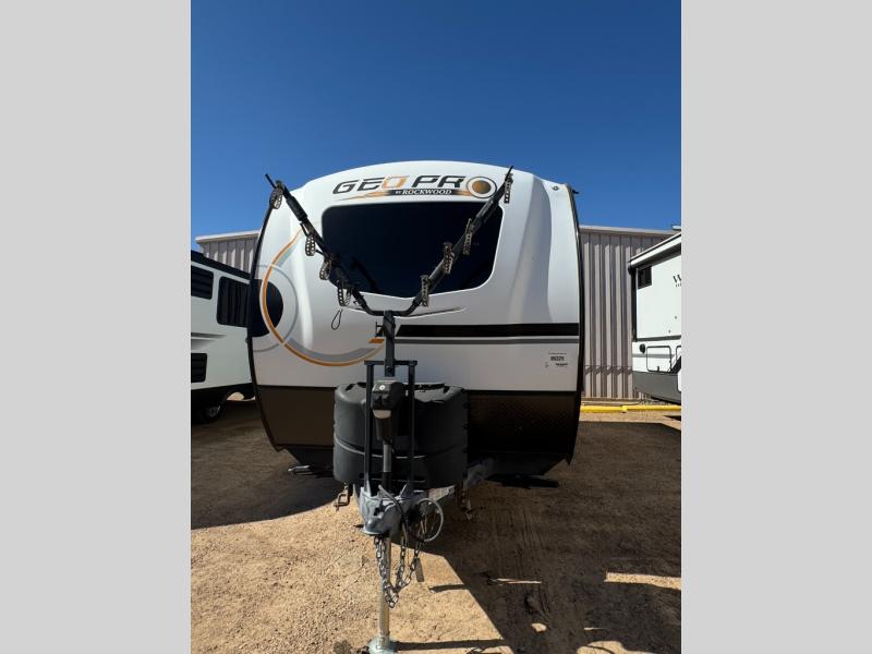 The Rockwood GEO Pro travel trailers and toy hauler by Forest River are ready for all your adventures. The interior and exterior Azdel construction, along with the vacuum laminated roof and walls provide a durable trailer, and the Dexter torsion axles with aluminum wheels make towing easier than ever. There are many convenient amenities, like the 13,500 BTU A/C, the Bluetooth system control panel, and the all-in-one Teton HD TV/WiFi/FM antenna with LTE prep. Each model includes frameless windows, fabric valances and roller shades, and a modern interior that will make you feel right at home. Everything you're looking for in your next RV is in a Rockwood GEO pro by Forest River!