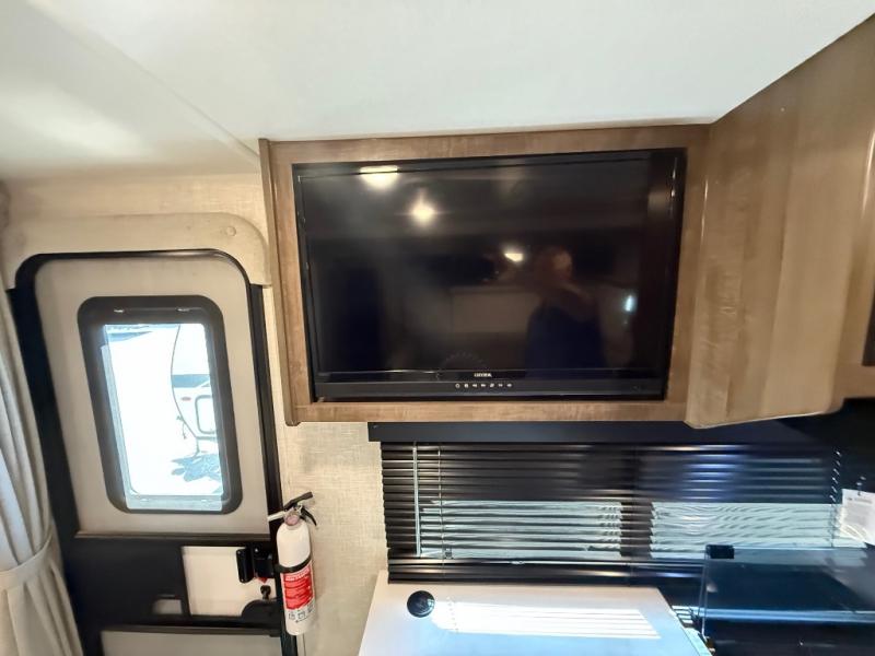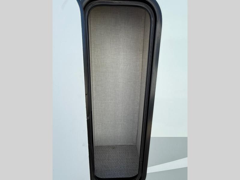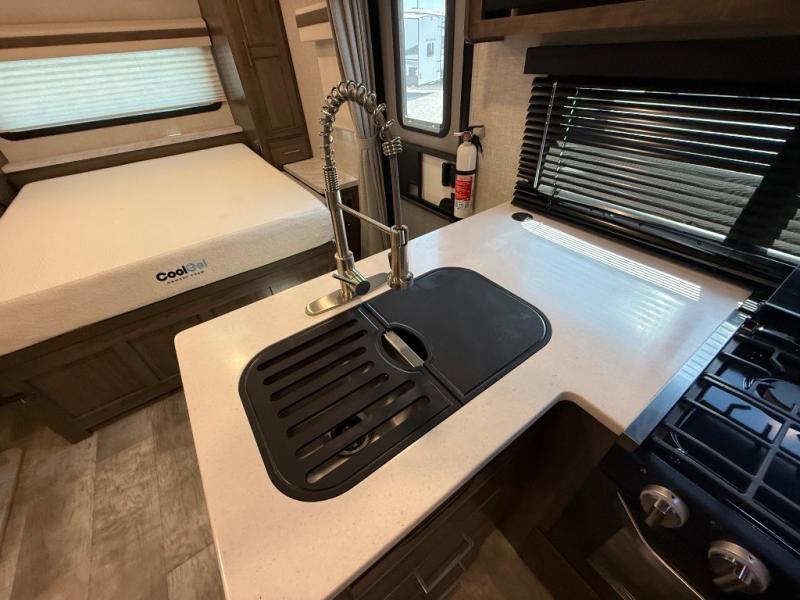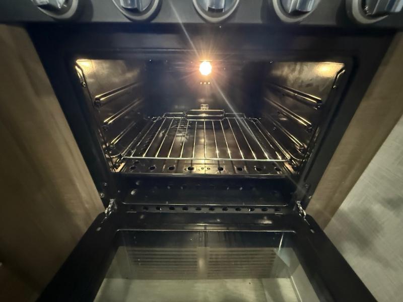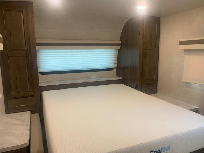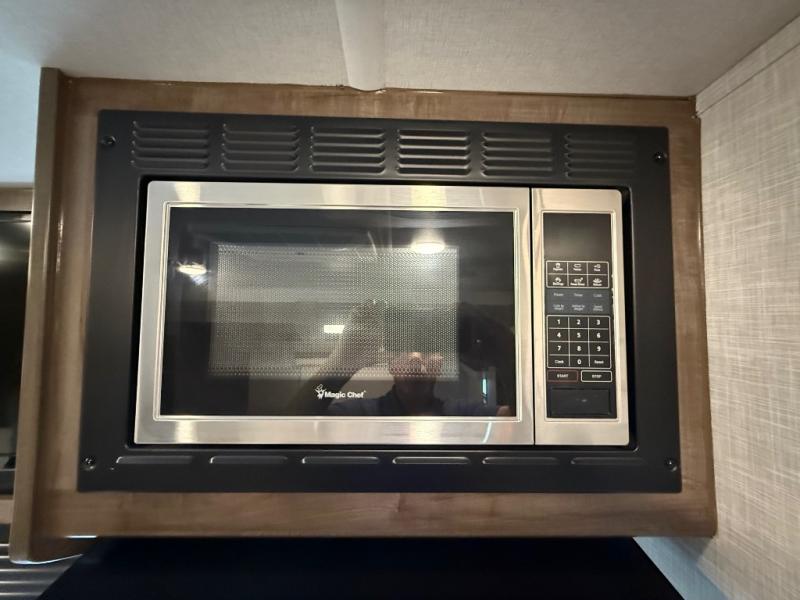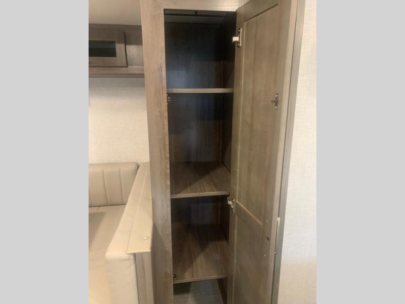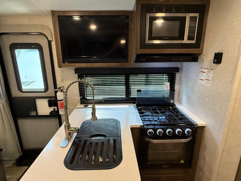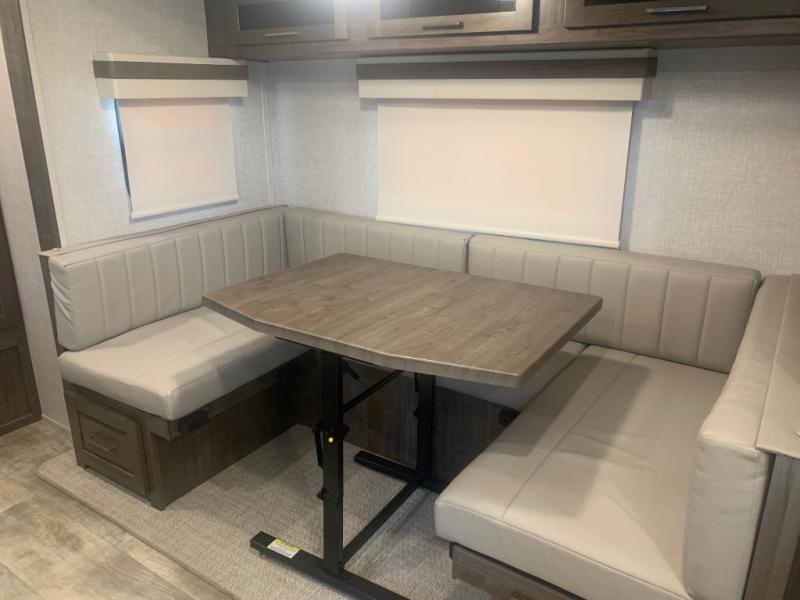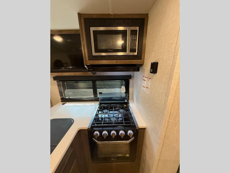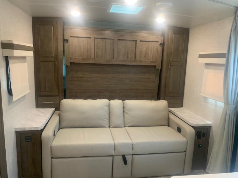 Versatile, cozy, and spacious are just a few ways to describe this travel trailer! Once you arrive at the campsite, unload your gear from the pass-through storage and additional exterior storage, then set up the 15' power awning with LED lights. You may want to visit in your camp chairs, or head inside to prepare lunch on the three burner cooktop. There is a U-shaped dinette within the slide out, plus a wardrobe here for jackets or your guests' clothes. You will also find the 72" sofa is a comfy spot to relax, and at night, you can fold down the RV queen-size Murphy bed!