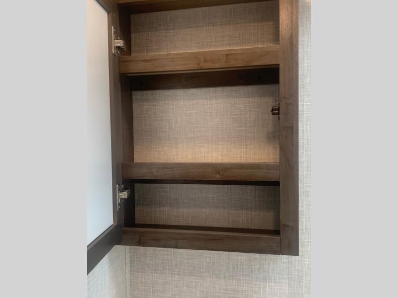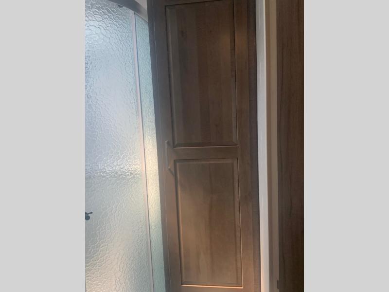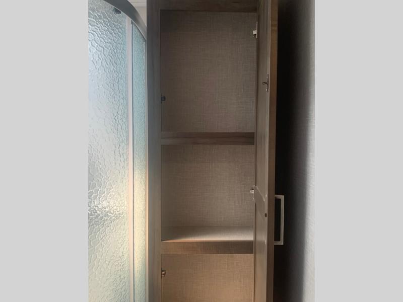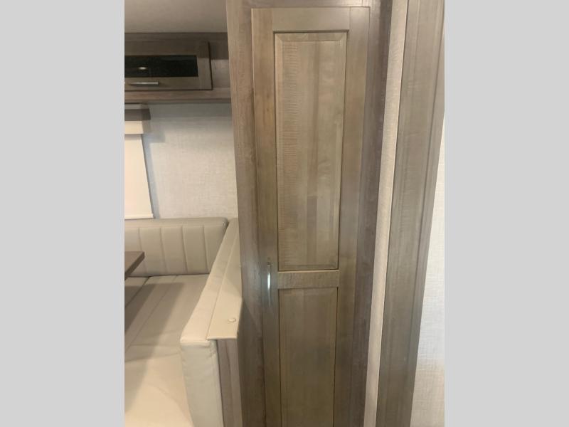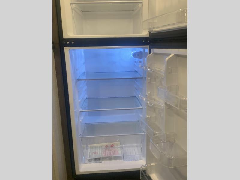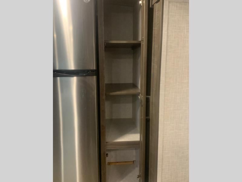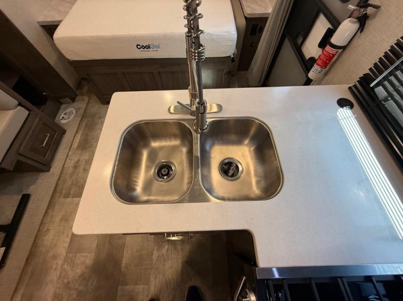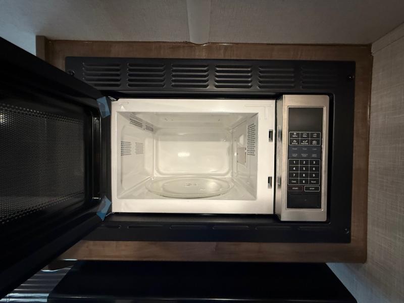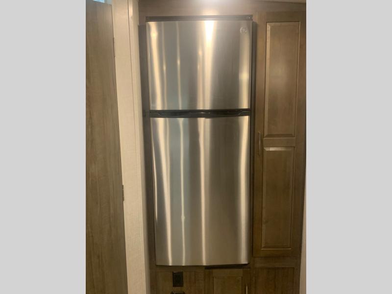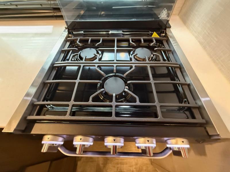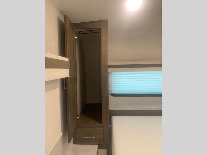Versatile, cozy, and spacious are just a few ways to describe this travel trailer! Once you arrive at the campsite, unload your gear from the pass-through storage and additional exterior storage, then set up the 15' power awning with LED lights. You may want to visit in your camp chairs, or head inside to prepare lunch on the three burner cooktop. There is a U-shaped dinette within the slide out, plus a wardrobe here for jackets or your guests' clothes. You will also find the 72" sofa is a comfy spot to relax, and at night, you can fold down the RV queen-size Murphy bed!