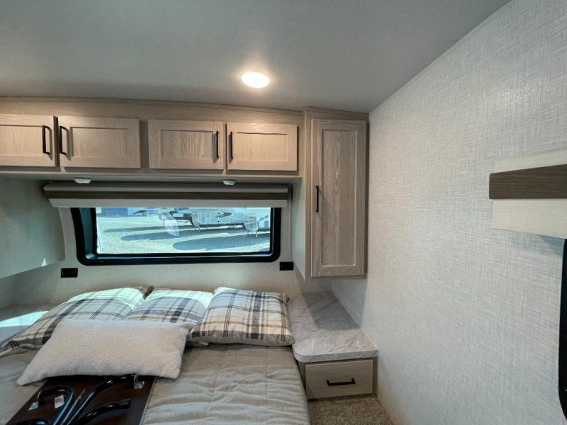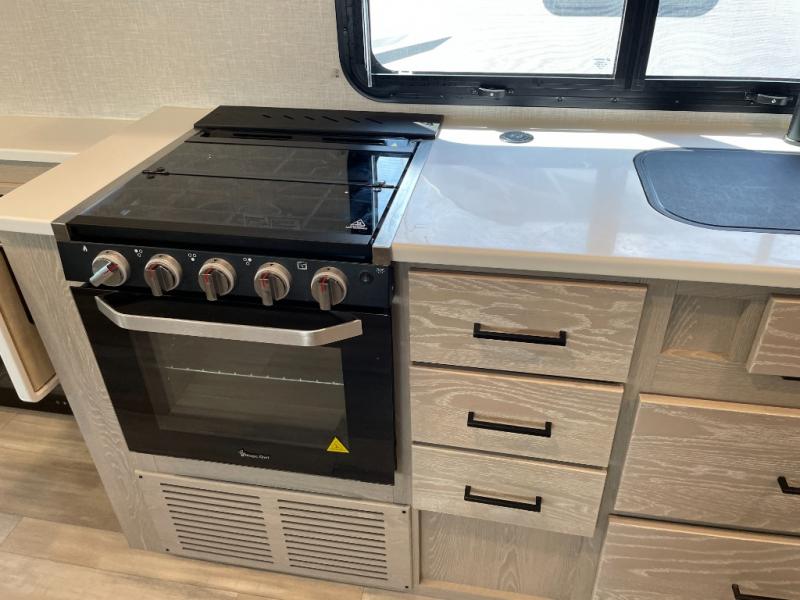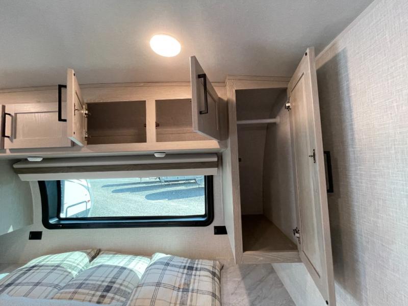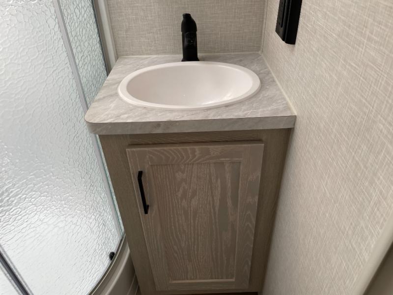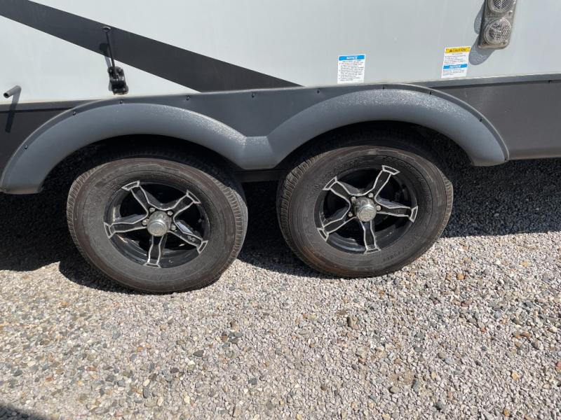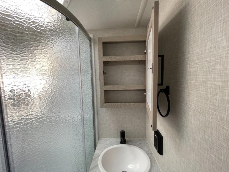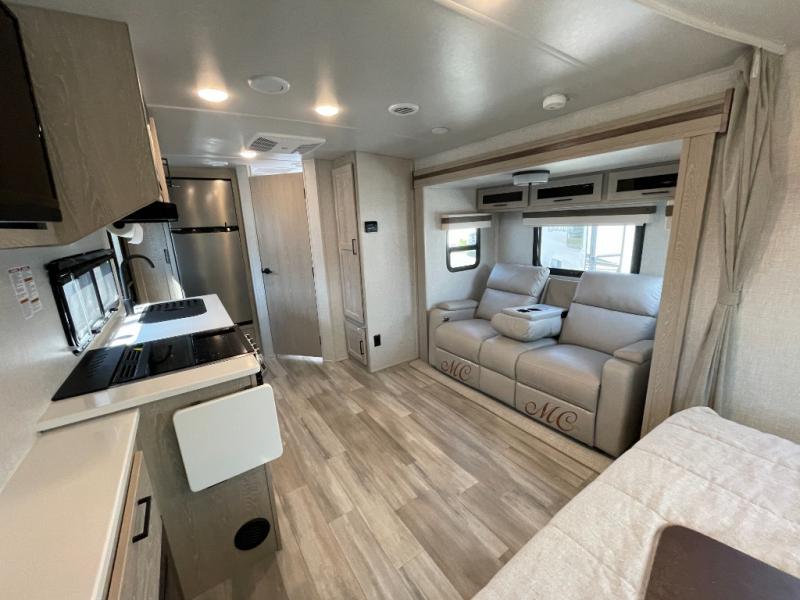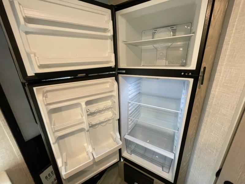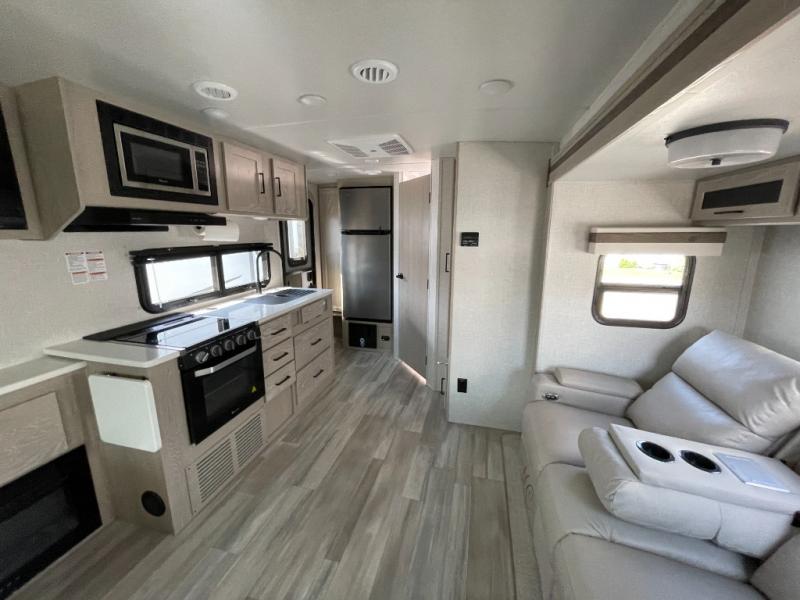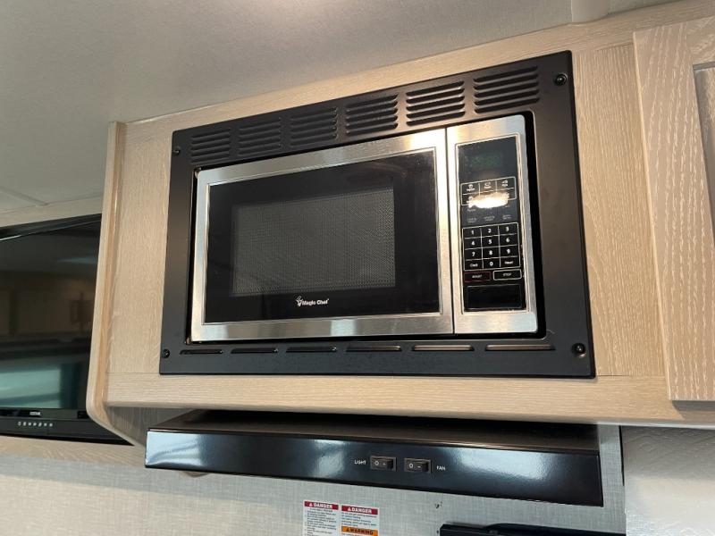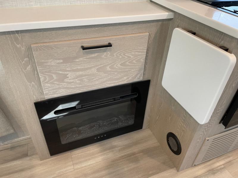 Enjoy camping season with your spouse, friend, or significant other in this cozy travel trailer for two. Each morning, you can have your coffee on the theater seats with a table within the slide out, then head outdoors to make pancakes on the outdoor griddle with an LP hookup. The interior kitchen includes a three burner cooktop, a microwave oven, plus a 12 volt refrigerator for perishables. An entertainment center with a fireplace will make your space feel more like home, and what's better than sleeping on your own queen bed with dual bedroom wardrobes for your clothes!?