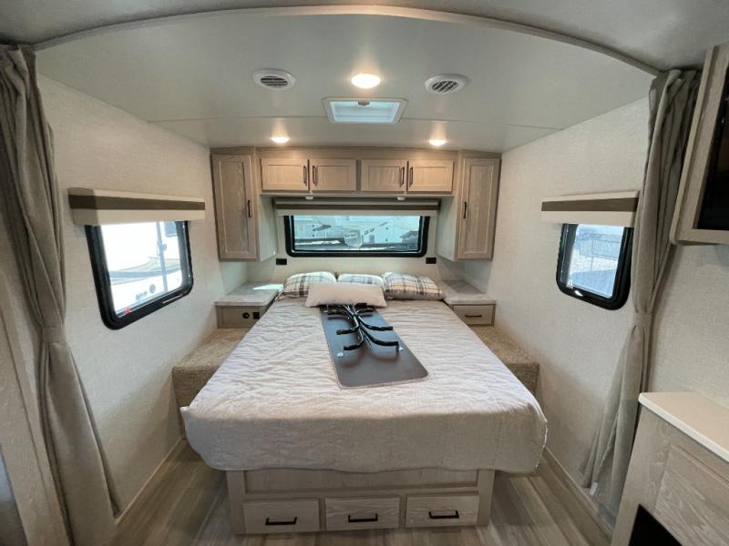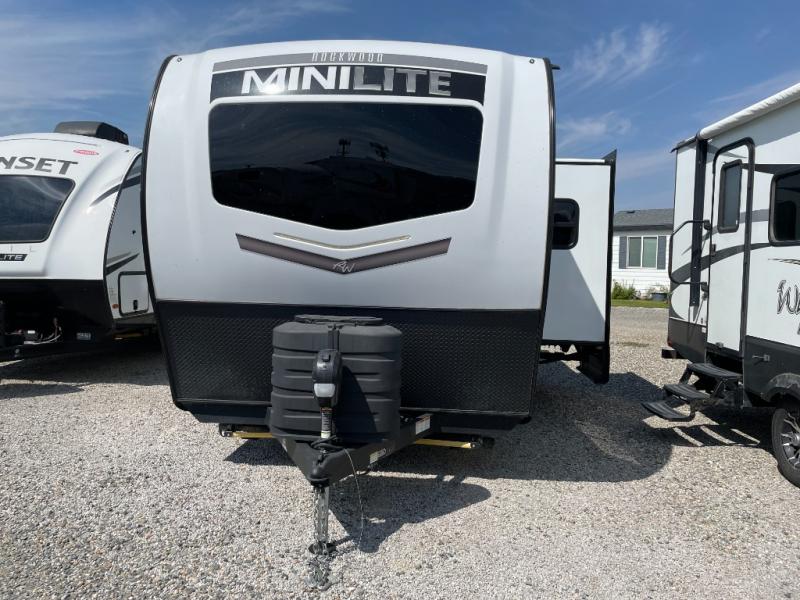 Each Rockwood Mini Lite travel trailer by Forest River is constructed with a fully laminated one-piece walkable roof, sleek frameless windows, and a six-sided full aluminum frame for strength and durability. The 12V thermostatically controlled heated tanks, plus radiant foil in the underbelly, front caps, and slide out floors will allow you to camp well into the colder months, and the 200W roof solar panel will be perfect for a little off-gridding. Each model includes solid surface kitchen countertops, solid wood cabinet doors, night roller shades, plus many more interior features. Having a Teton all in one Wi-Fi booster/LTE prep and antenna on board will allow you to get some work done if it's needed, and the power tongue jack provides hassle-free set up, so you can enjoy more time relaxing!