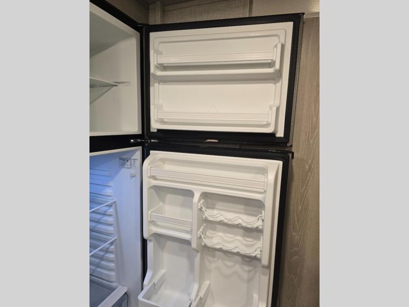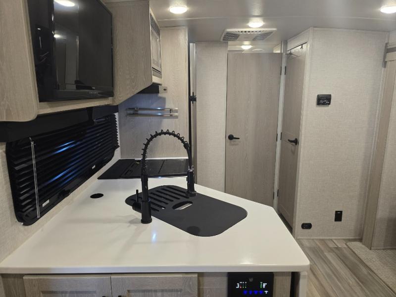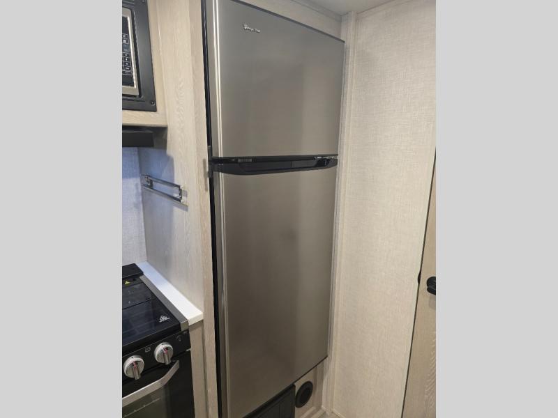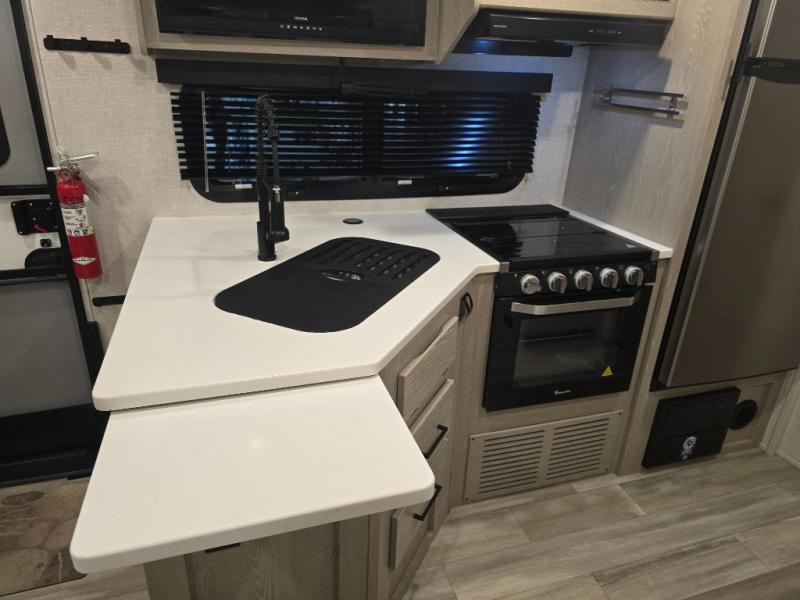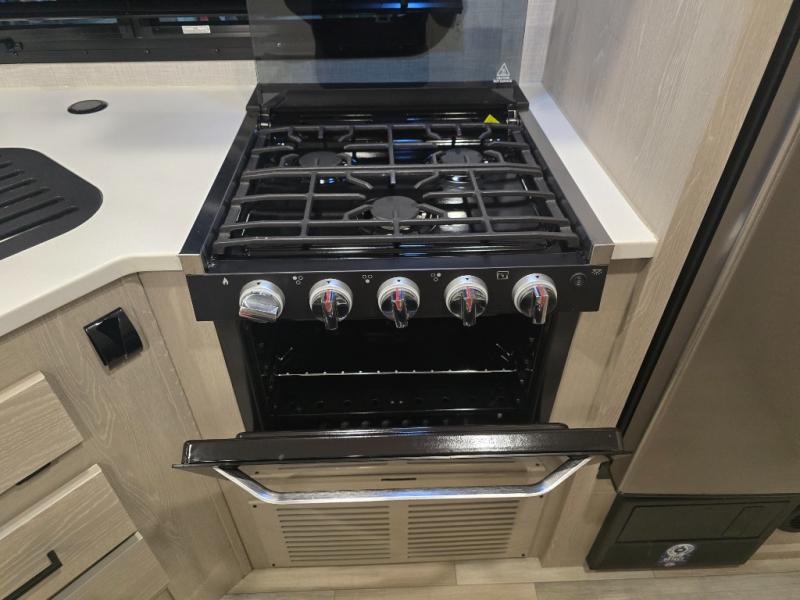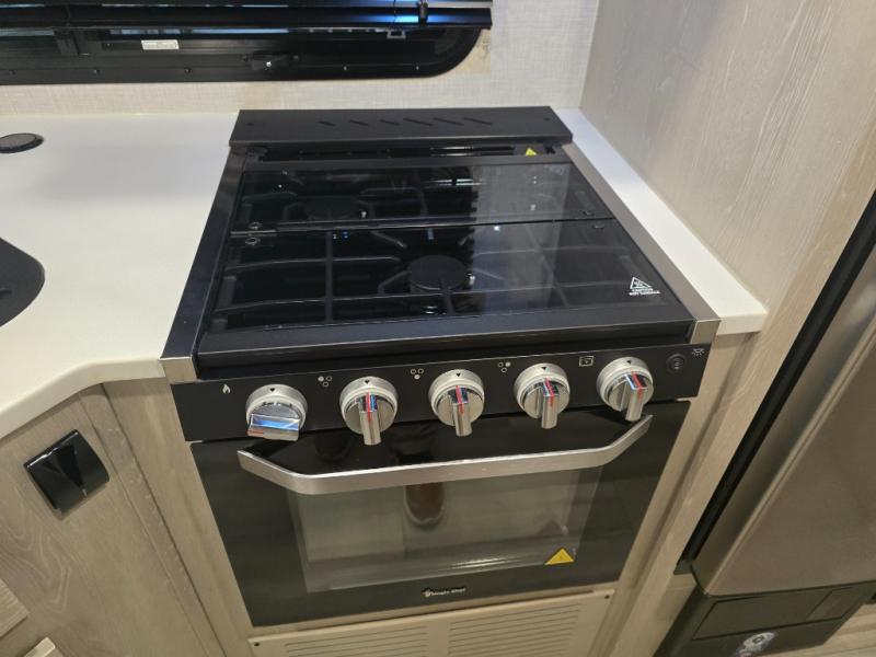 - Fully Equipped Kitchen: Cook up delicious meals with ease! The Mini Lite boasts a modern kitchen with a three-burner cooktop, oven, microwave, and a spacious refrigerator. With ample counter space and storage, you'll have everything you need to prepare meals on the go.