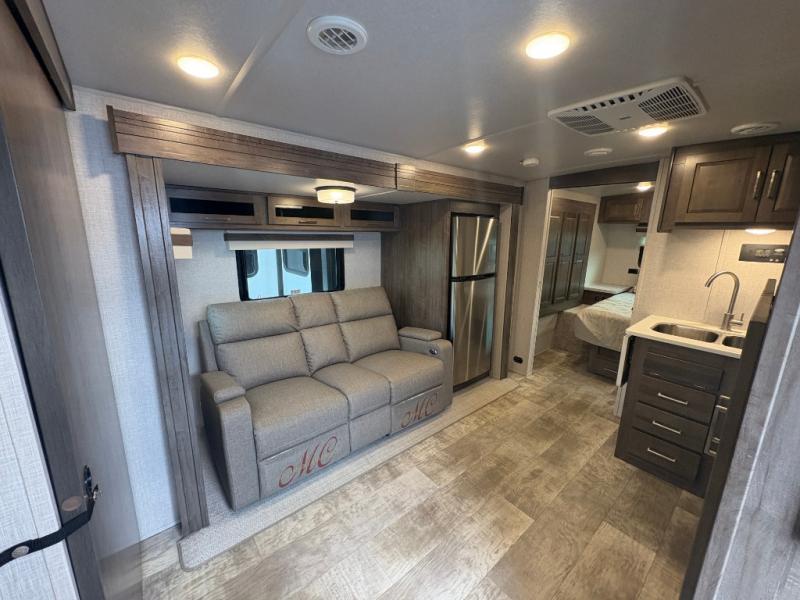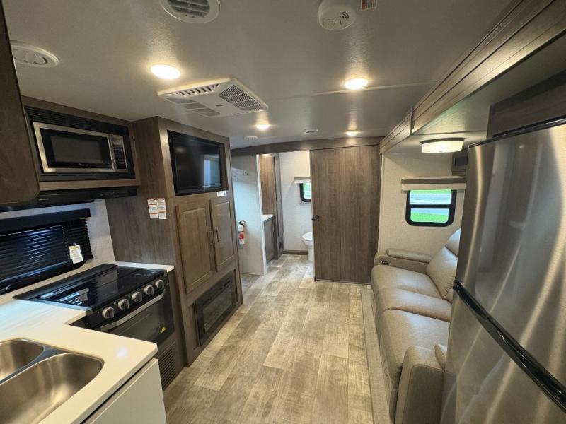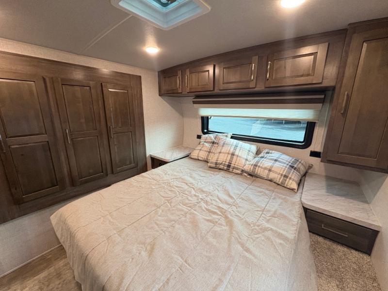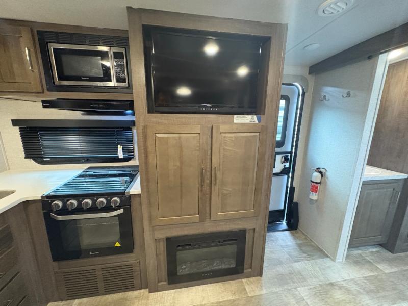 Camping trips to the lake just got sweeter with this dual slide out travel trailer in tow! Once you arrive, unload your gear from the exterior drop-frame pass-through storage, then start lunch on the exterior griddle. If you need a rest after traveling all day, the RV queen bed in the front bedroom is sure to give you comfort, or you can relax on the theater seating. The fireplace and entertainment center with an LED TV will make this space feel just like home, and check out the spacious full rear bath for added privacy. This model also includes an entryway closet/pantry for jackets, shoes, and food!