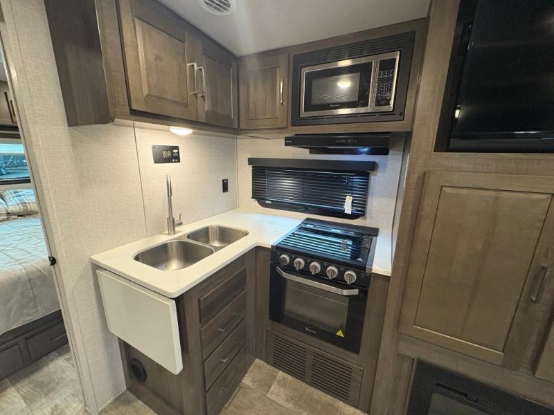 Each Rockwood Mini Lite travel trailer by Forest River is constructed with a fully laminated one-piece walkable roof, sleek frameless windows, and a six-sided full aluminum frame for strength and durability. The 12V thermostatically controlled heated tanks, plus radiant foil in the underbelly, front caps, and slide out floors will allow you to camp well into the colder months, and the 200W roof solar panel will be perfect for a little off-gridding. Each model includes solid surface kitchen countertops, solid wood cabinet doors, night roller shades, plus many more interior features. Having a Teton all in one Wi-Fi booster/LTE prep and antenna on board will allow you to get some work done if it's needed, and the power tongue jack provides hassle-free set up, so you can enjoy more time relaxing!
