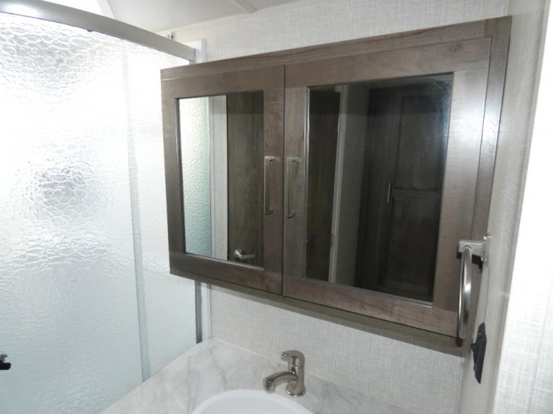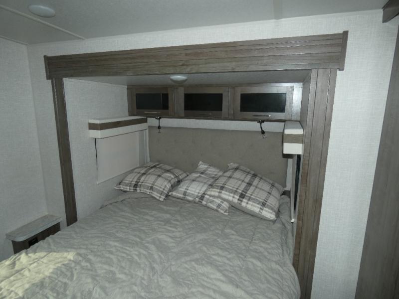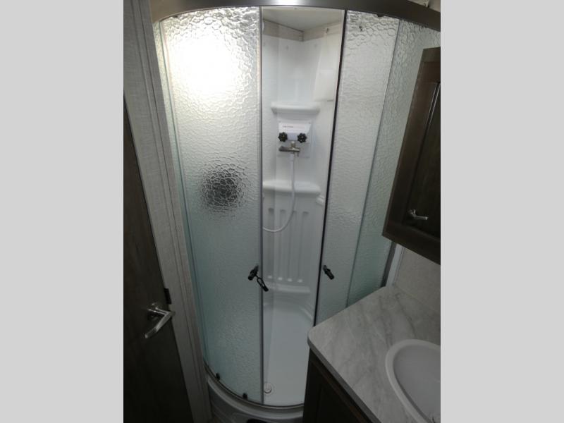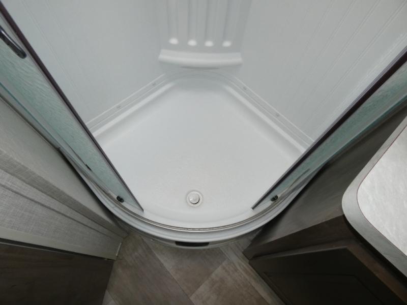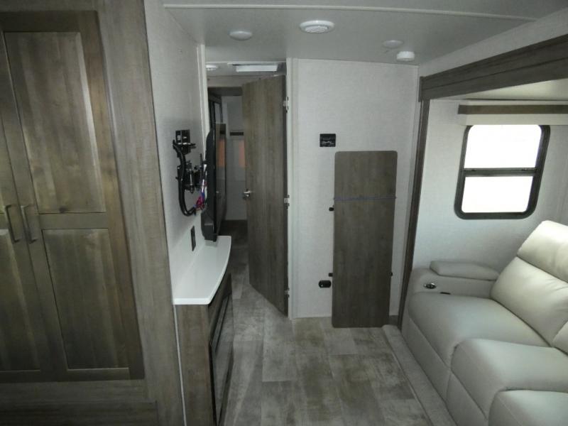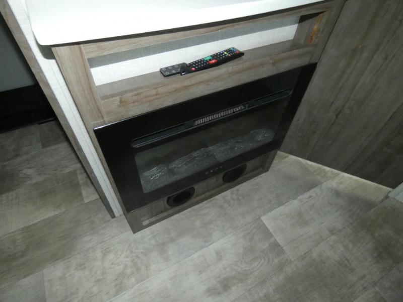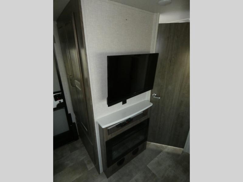 Escape the city life for weekend trips in this cozy couple's trailer. The dual entry doors will allow you to enter in through the rear private bedroom, or the front kitchen/main living area for convenience. You will enjoy relaxing on the theater seating across from the LED TV and fireplace in the evenings, or you can visit outdoors under the 19' power awning. You'll also find an exterior griddle here for quick meals and exterior storage for the fishing poles or hiking gear. This model also includes a walk-through bath with a shower skylight, a linen closet, plus a Showermiser Water Saving System. And don't worry about storage space inside since this model includes an entryway pantry/closet, a second pantry in the front kitchen, plus a large bedroom wardrobe to keep your clothes wrinkle-free!