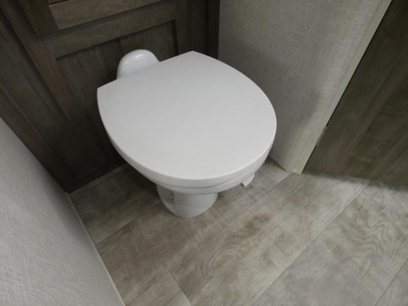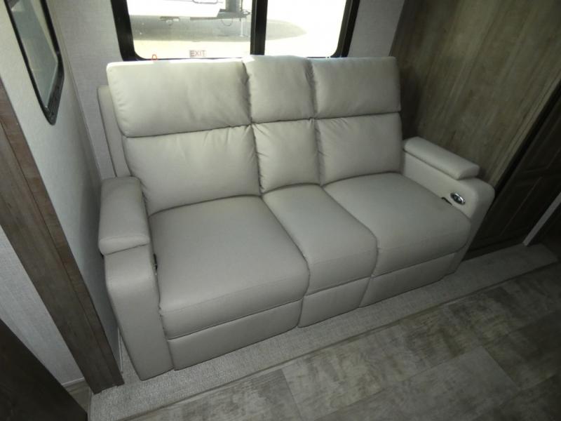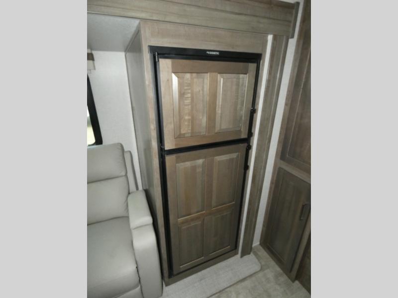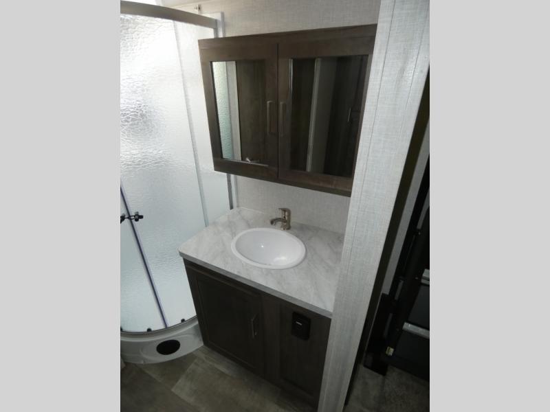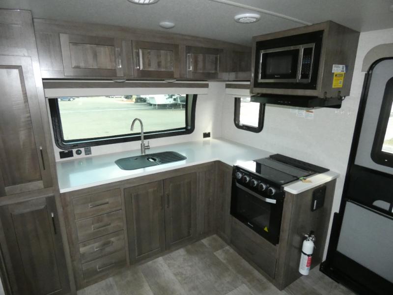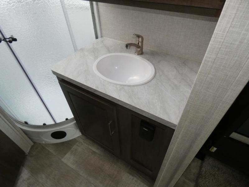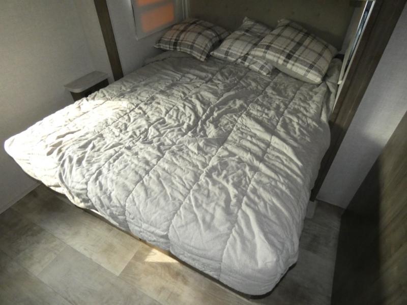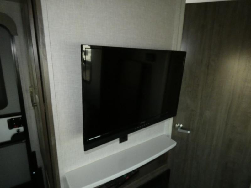 Escape the city life for weekend trips in this cozy couple's trailer. The dual entry doors will allow you to enter in through the rear private bedroom, or the front kitchen/main living area for convenience. You will enjoy relaxing on the theater seating across from the LED TV and fireplace in the evenings, or you can visit outdoors under the 19' power awning. You'll also find an exterior griddle here for quick meals and exterior storage for the fishing poles or hiking gear. This model also includes a walk-through bath with a shower skylight, a linen closet, plus a Showermiser Water Saving System. And don't worry about storage space inside since this model includes an entryway pantry/closet, a second pantry in the front kitchen, plus a large bedroom wardrobe to keep your clothes wrinkle-free!