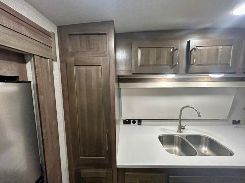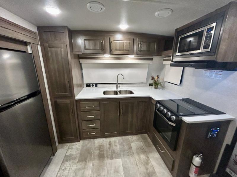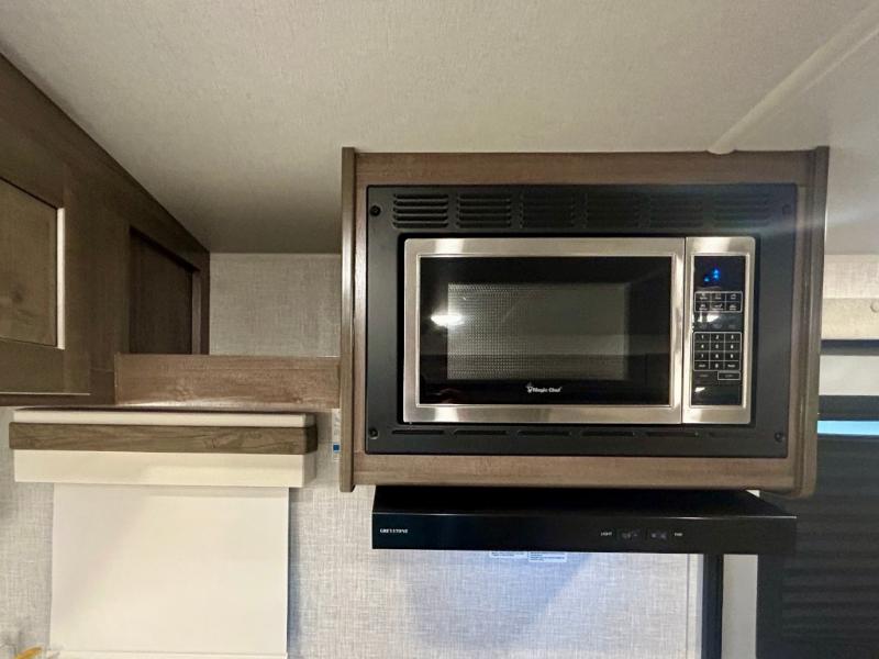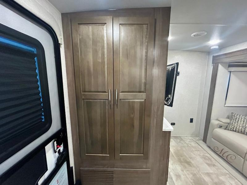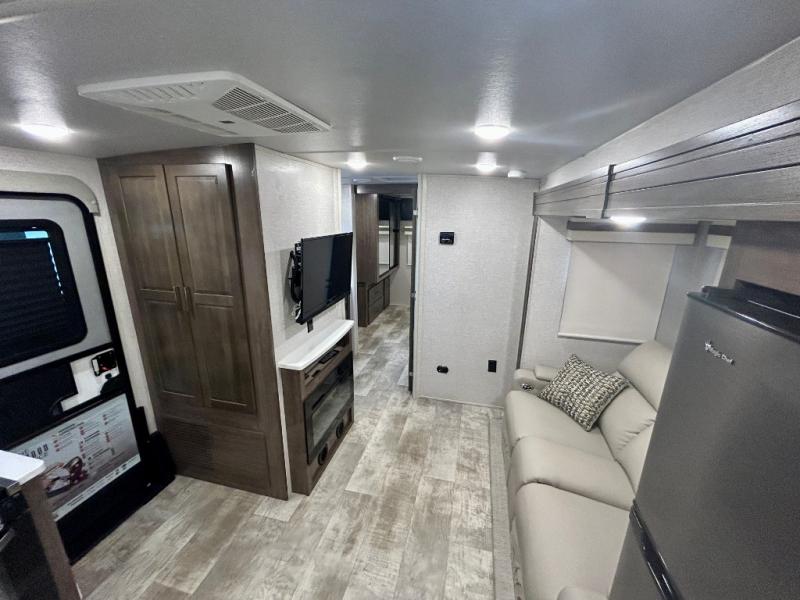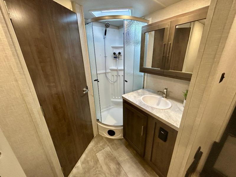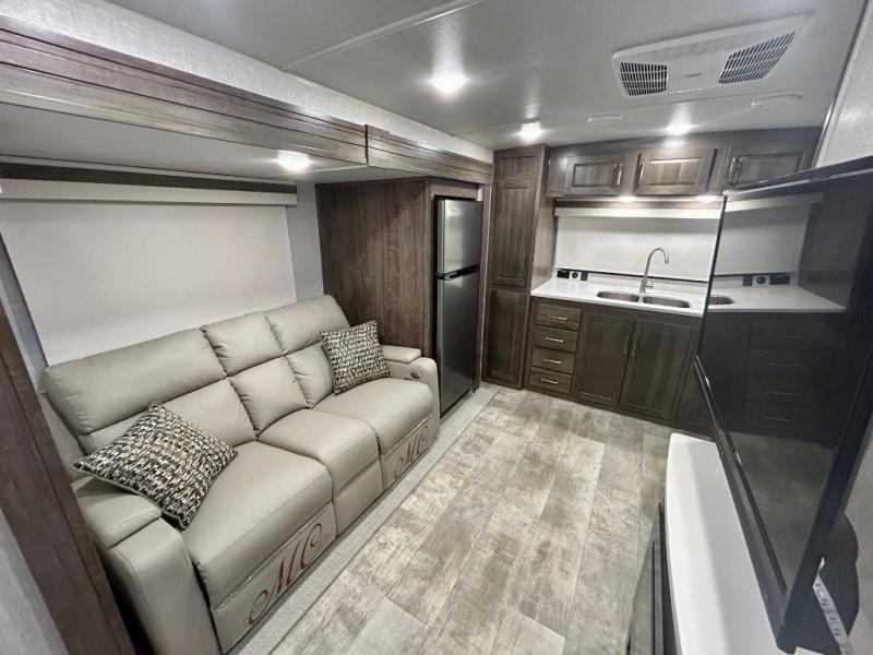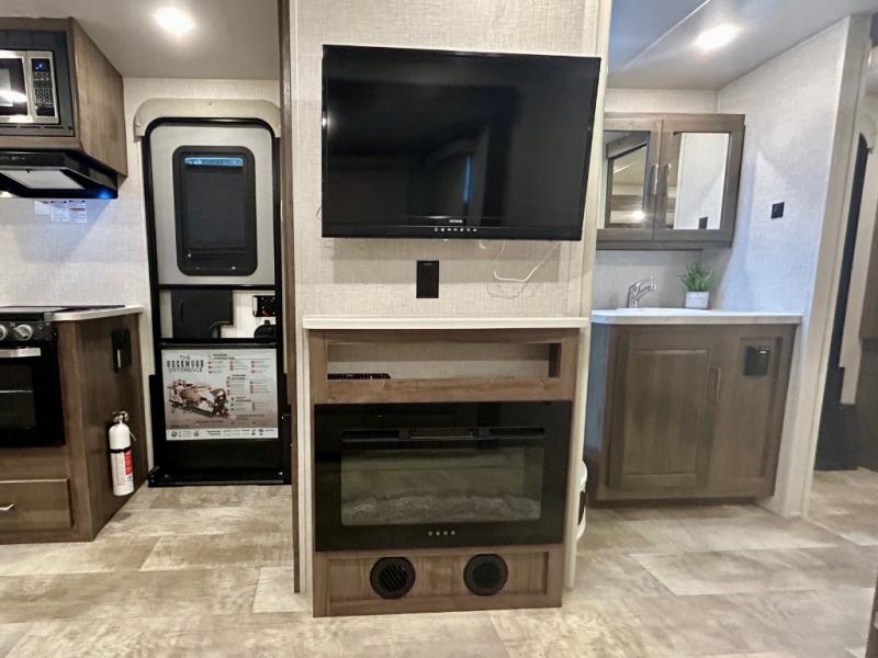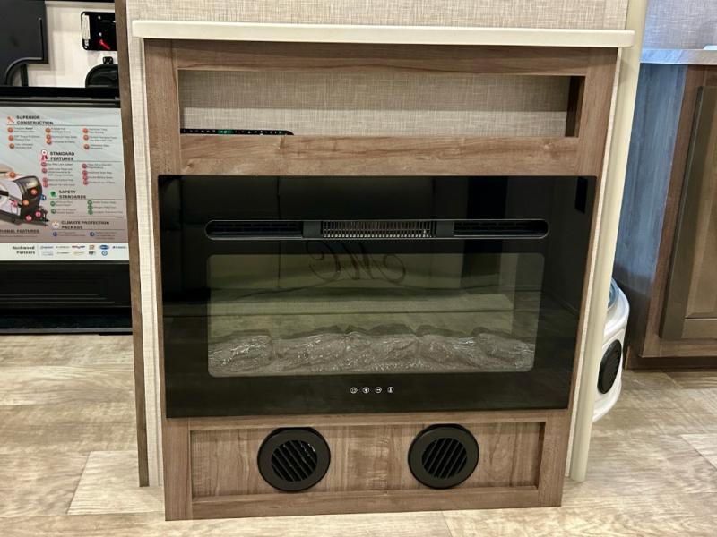 Escape the city life for weekend trips in this cozy couple's trailer. The dual entry doors will allow you to enter in through the rear private bedroom, or the front kitchen/main living area for convenience. You will enjoy relaxing on the theater seating across from the LED TV and fireplace in the evenings, or you can visit outdoors under the 19' power awning. You'll also find an exterior griddle here for quick meals and exterior storage for the fishing poles or hiking gear. This model also includes a walk-through bath with a shower skylight, a linen closet, plus a Showermiser Water Saving System. And don't worry about storage space inside since this model includes an entryway pantry/closet, a second pantry in the front kitchen, plus a large bedroom wardrobe to keep your clothes wrinkle-free!
