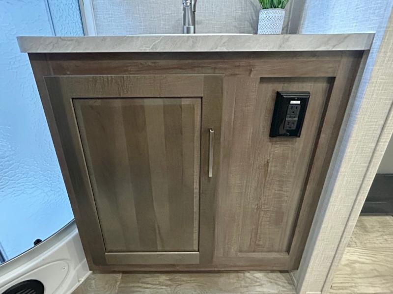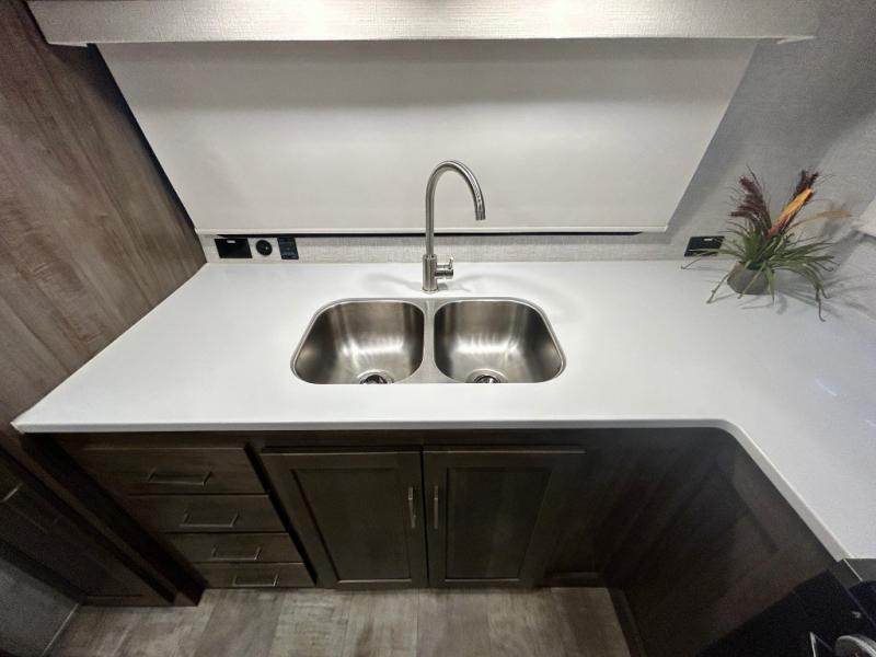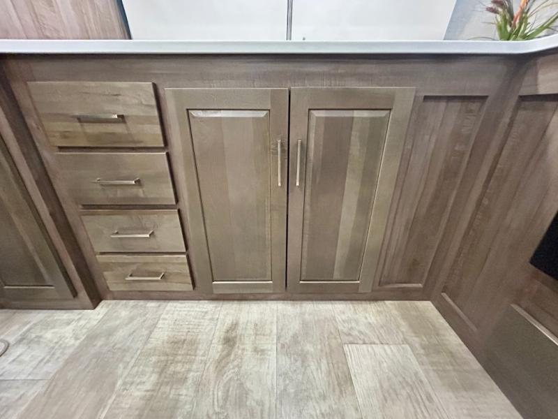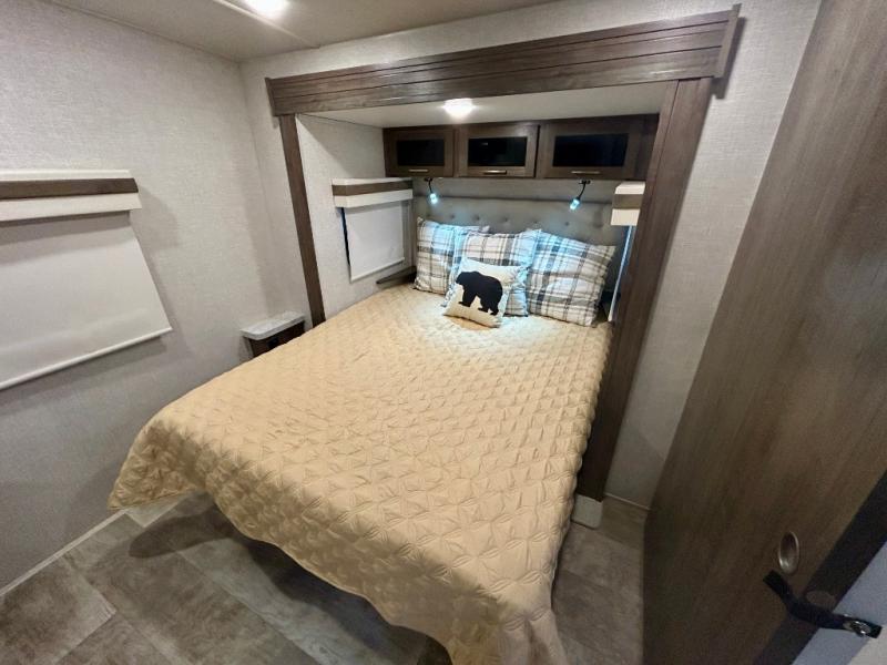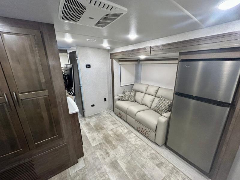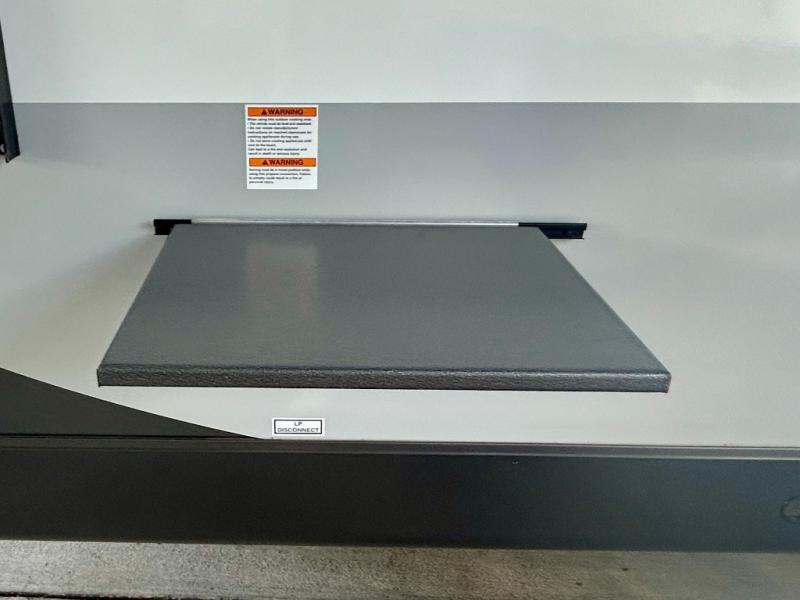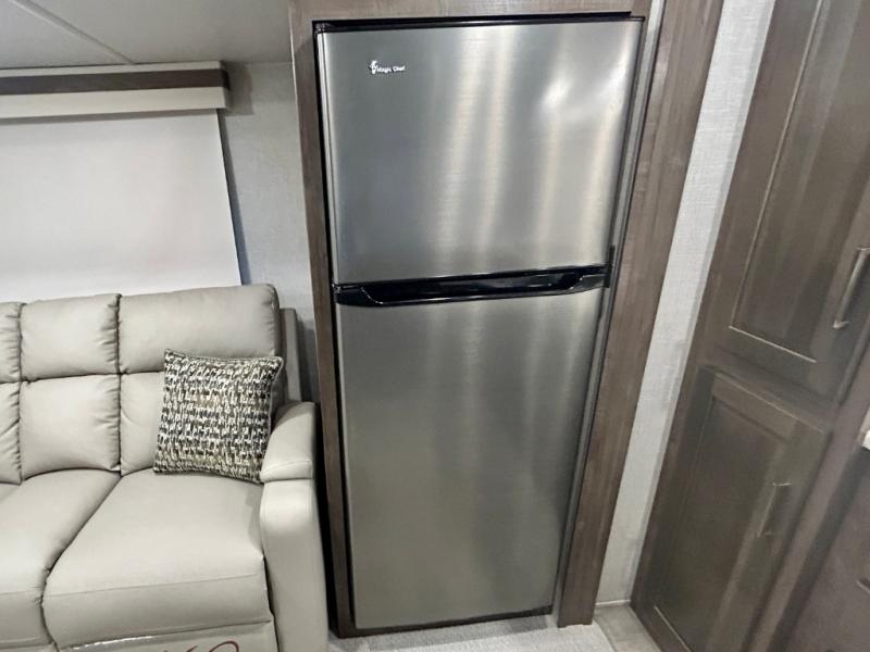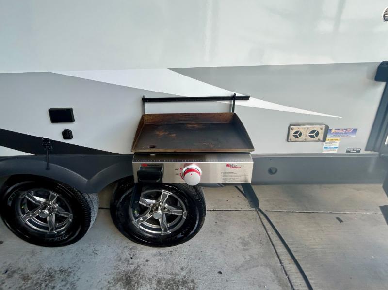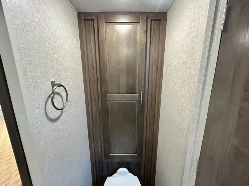Escape the city life for weekend trips in this cozy couple's trailer. The dual entry doors will allow you to enter in through the rear private bedroom, or the front kitchen/main living area for convenience. You will enjoy relaxing on the theater seating across from the LED TV and fireplace in the evenings, or you can visit outdoors under the 19' power awning. You'll also find an exterior griddle here for quick meals and exterior storage for the fishing poles or hiking gear. This model also includes a walk-through bath with a shower skylight, a linen closet, plus a Showermiser Water Saving System. And don't worry about storage space inside since this model includes an entryway pantry/closet, a second pantry in the front kitchen, plus a large bedroom wardrobe to keep your clothes wrinkle-free!