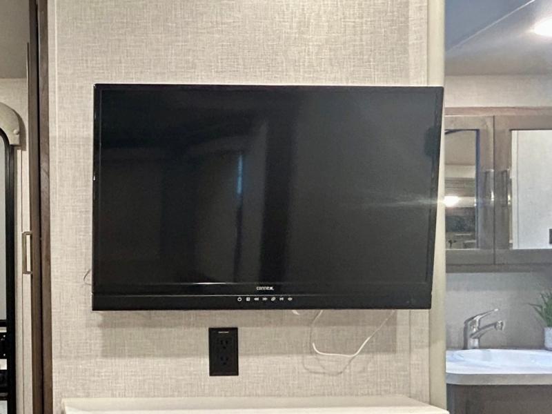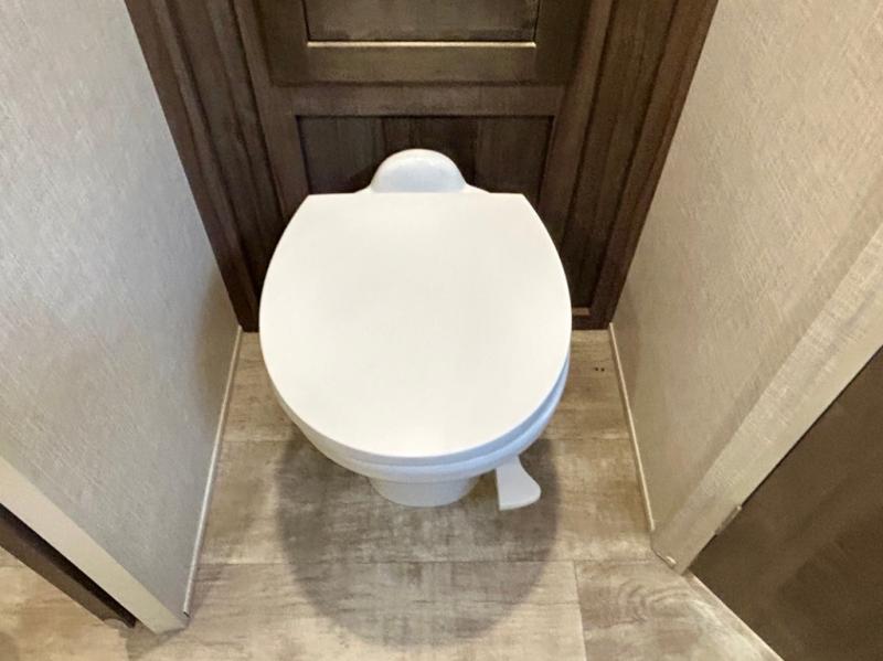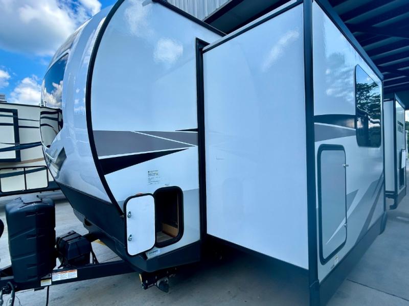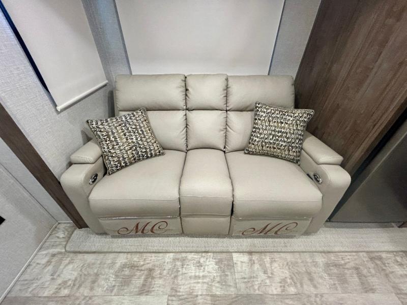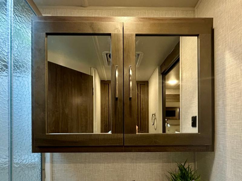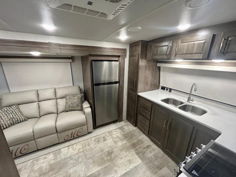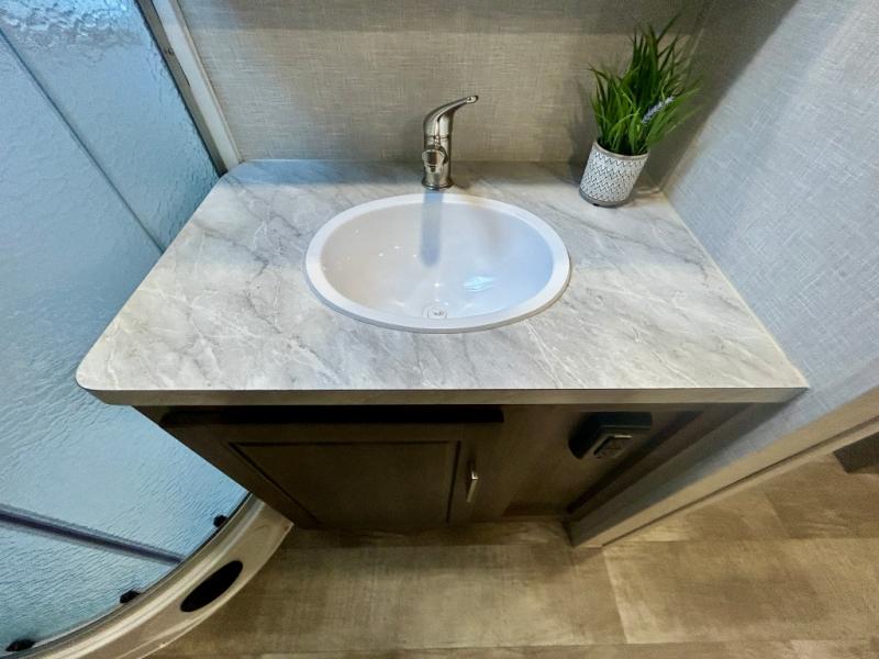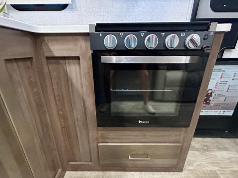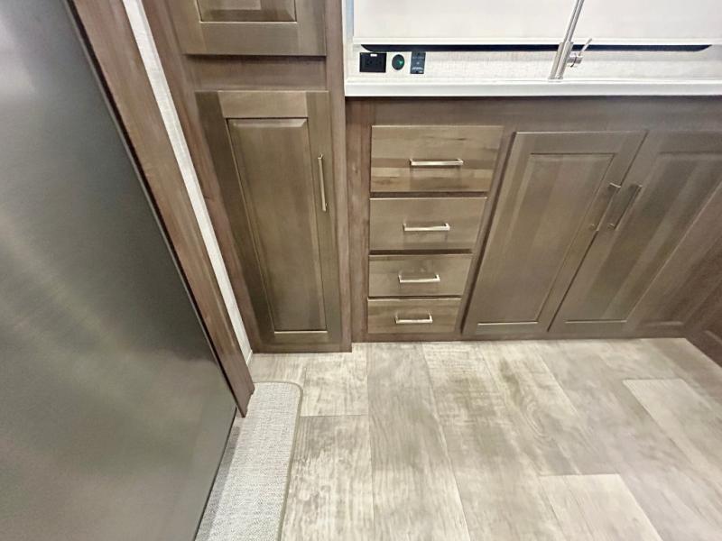 Escape the city life for weekend trips in this cozy couple's trailer. The dual entry doors will allow you to enter in through the rear private bedroom, or the front kitchen/main living area for convenience. You will enjoy relaxing on the theater seating across from the LED TV and fireplace in the evenings, or you can visit outdoors under the 19' power awning. You'll also find an exterior griddle here for quick meals and exterior storage for the fishing poles or hiking gear. This model also includes a walk-through bath with a shower skylight, a linen closet, plus a Showermiser Water Saving System. And don't worry about storage space inside since this model includes an entryway pantry/closet, a second pantry in the front kitchen, plus a large bedroom wardrobe to keep your clothes wrinkle-free!