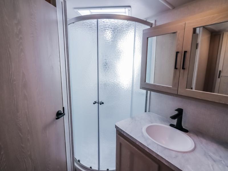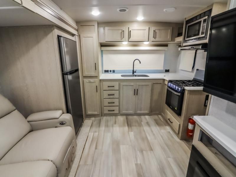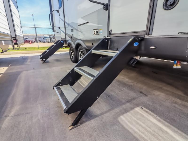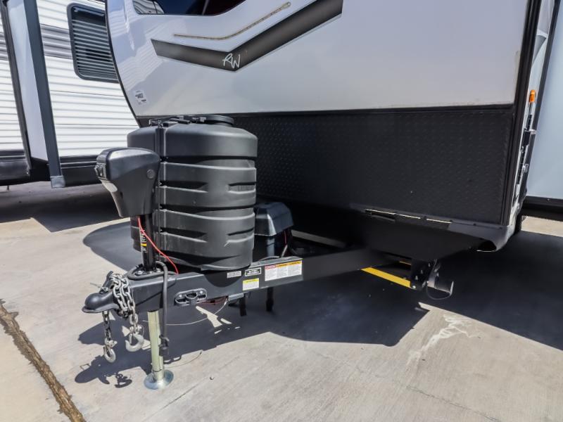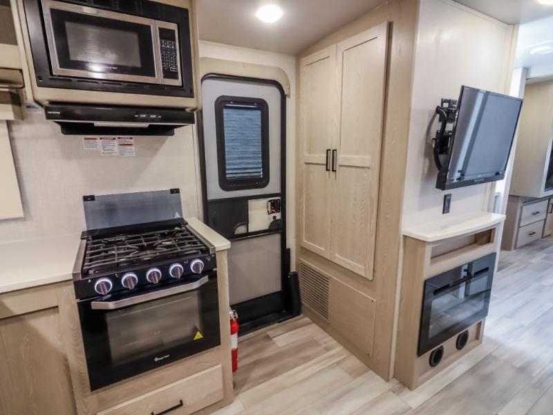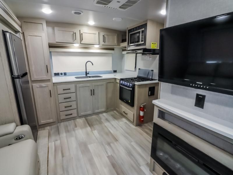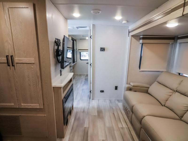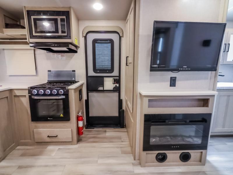 Escape the city life for weekend trips in this cozy couple's trailer. The dual entry doors will allow you to enter in through the rear private bedroom, or the front kitchen/main living area for convenience. You will enjoy relaxing on the theater seating across from the LED TV and fireplace in the evenings, or you can visit outdoors under the 19' power awning. You'll also find an exterior griddle here for quick meals and exterior storage for the fishing poles or hiking gear. This model also includes a walk-through bath with a shower skylight, a linen closet, plus a Showermiser Water Saving System. And don't worry about storage space inside since this model includes an entryway pantry/closet, a second pantry in the front kitchen, plus a large bedroom wardrobe to keep your clothes wrinkle-free!