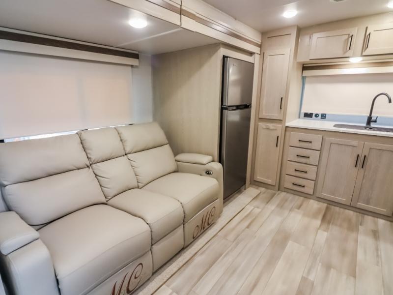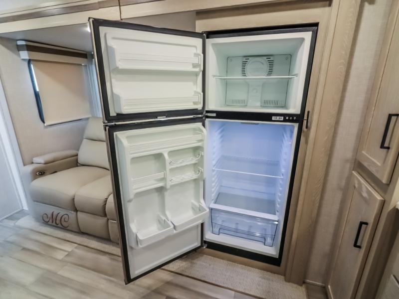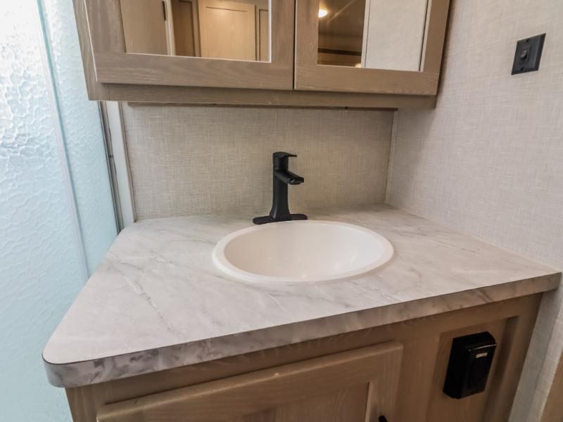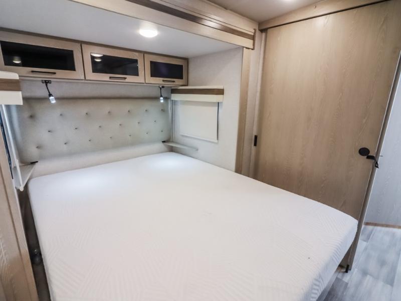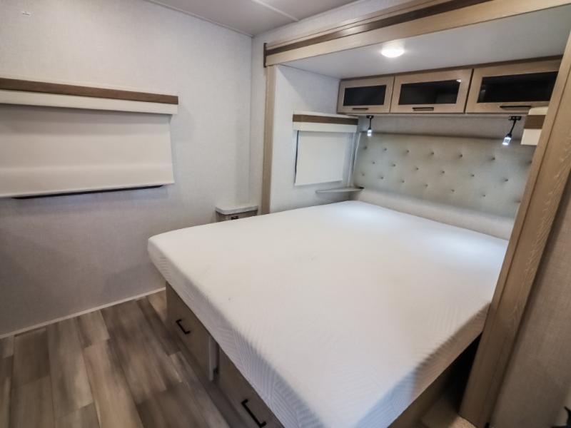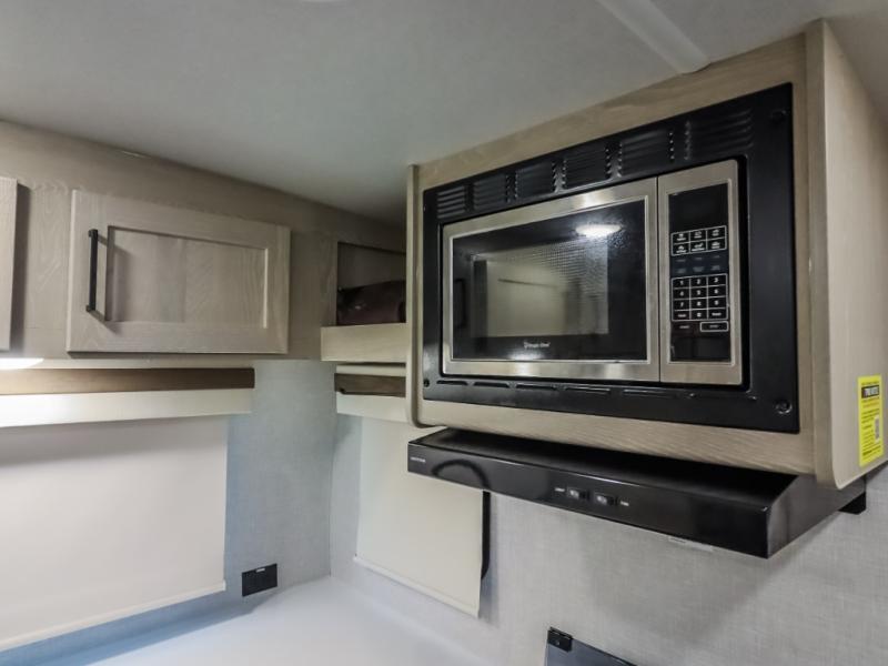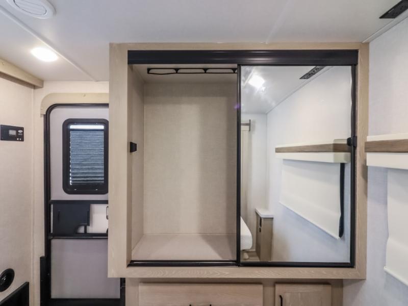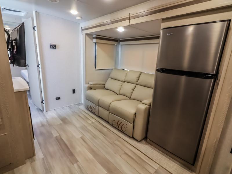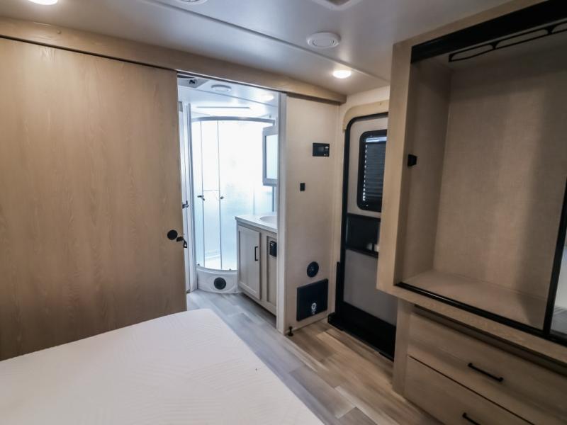 Escape the city life for weekend trips in this cozy couple's trailer. The dual entry doors will allow you to enter in through the rear private bedroom, or the front kitchen/main living area for convenience. You will enjoy relaxing on the theater seating across from the LED TV and fireplace in the evenings, or you can visit outdoors under the 19' power awning. You'll also find an exterior griddle here for quick meals and exterior storage for the fishing poles or hiking gear. This model also includes a walk-through bath with a shower skylight, a linen closet, plus a Showermiser Water Saving System. And don't worry about storage space inside since this model includes an entryway pantry/closet, a second pantry in the front kitchen, plus a large bedroom wardrobe to keep your clothes wrinkle-free!