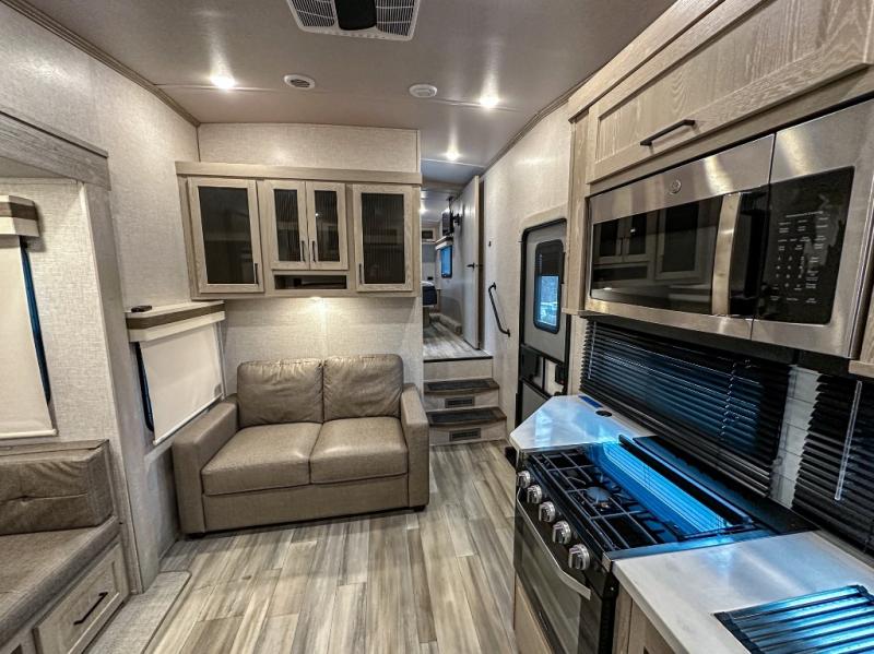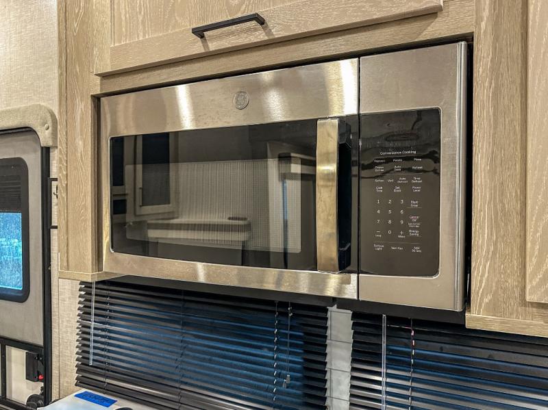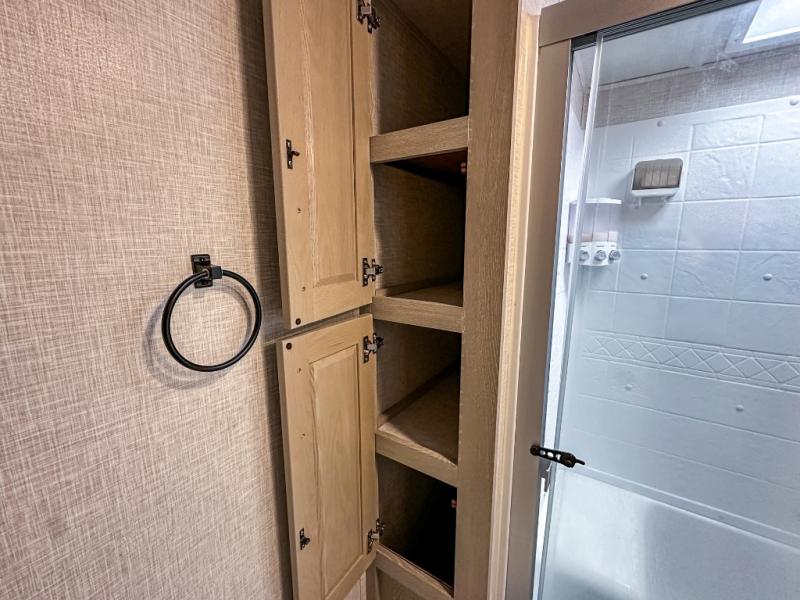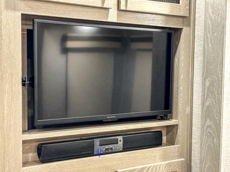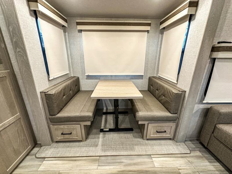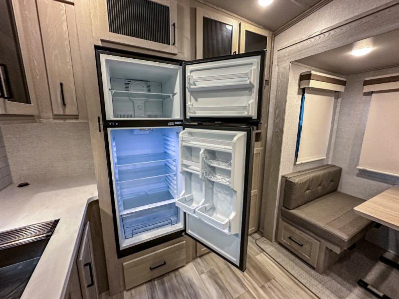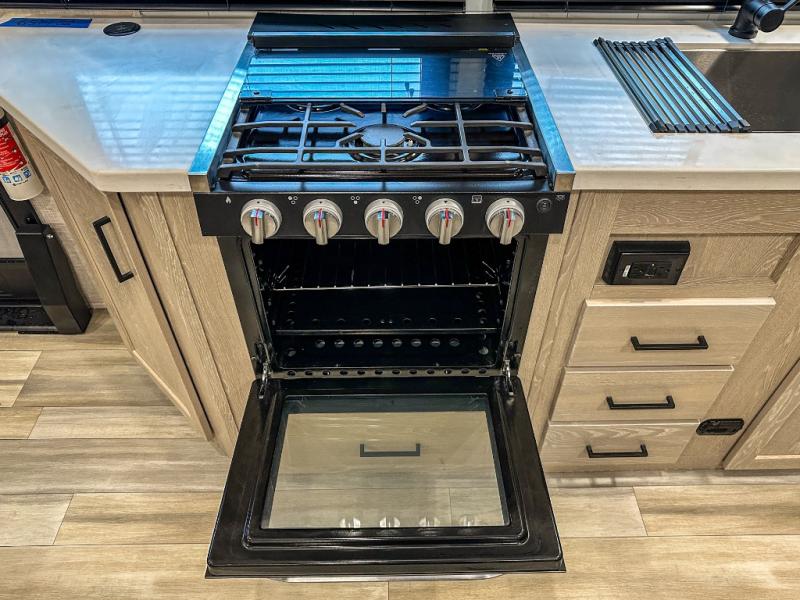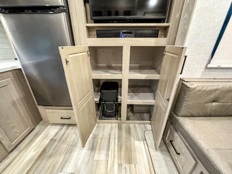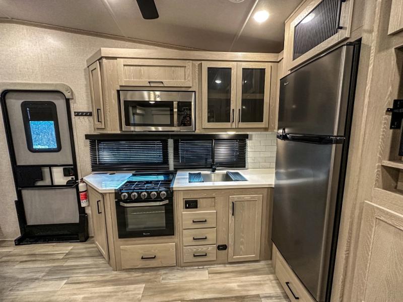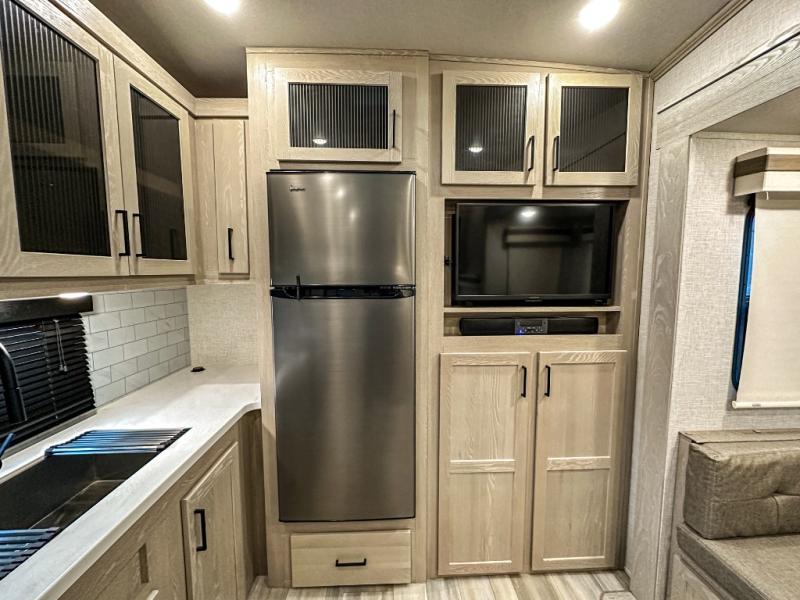 This spacious fifth wheel is perfect for five to six happy campers. The outdoor griddle and refrigerator allows you to cook breakfast outdoors in the morning, and the 18' power awning will provide a nice outdoor living space. Inside, you'll find a three burner range, a microwave oven, plus an 11 cu. ft. 12V refrigerator for food storage. You can watch the LED TV while dining at the booth dinette slide or sitting on the hide-a-bed sofa, and both double as extra sleeping space. There is also a full bathroom and a front bedroom with a queen bed and a wardrobe slide including shelves giving you lots of storage.