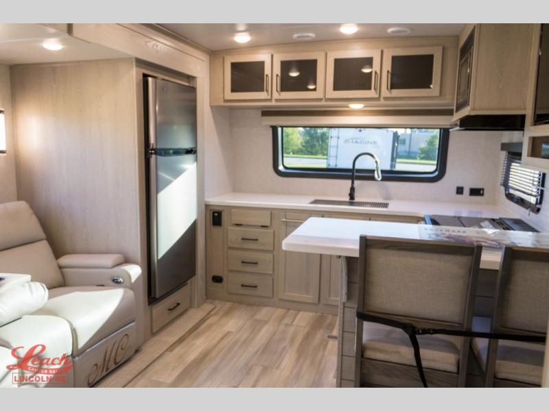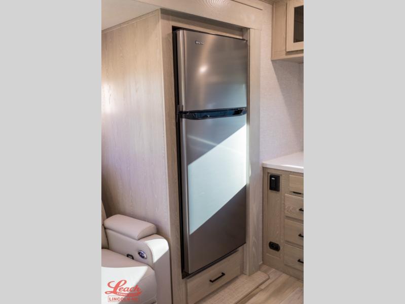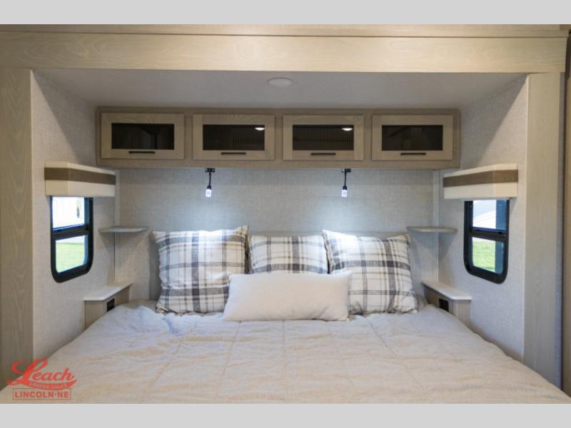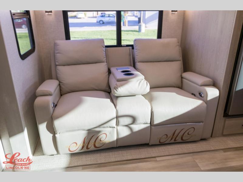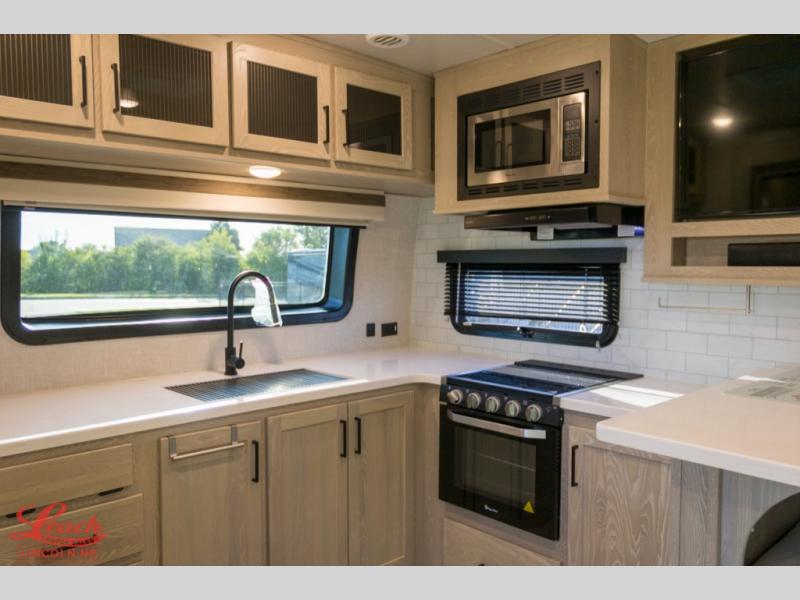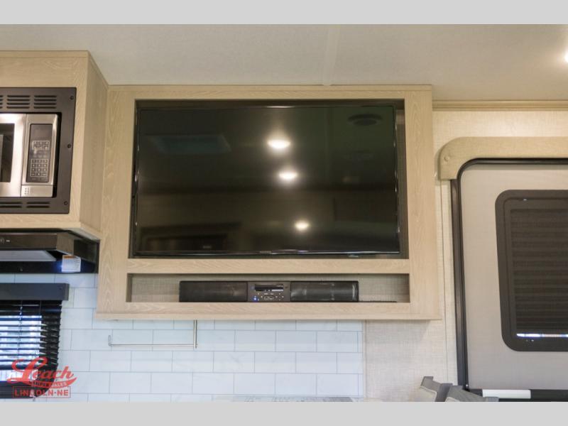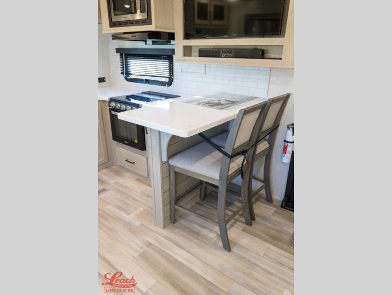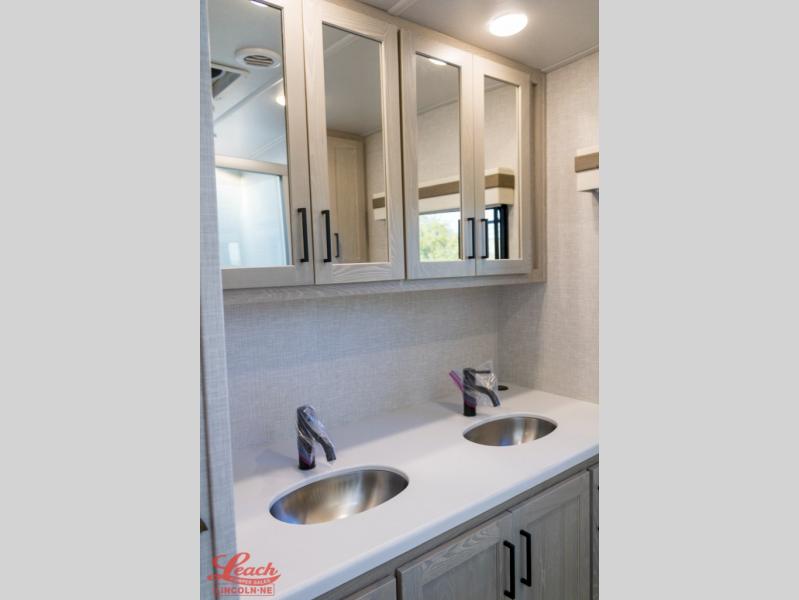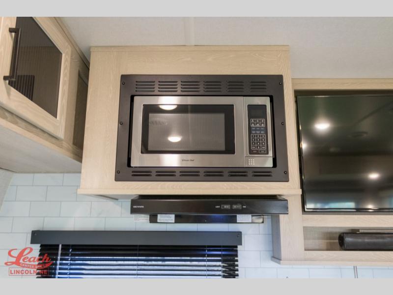 This front kitchen, couple's trailer is ready for adventure when you are! Once you arrive at your destination, prepare a quick lunch on the outside griddle, and enjoy the shade provided by the 19' power awning. You can eat outside, or inside at the counter with stools. The theatre seat will make this travel trailer feel more like home, and the double slides provide more space to stretch out. Within the master bedroom you'll find a king bed, a large wardrobe and a dresser, plus an optional TV. And check out the full rear bath with dual bath sinks and a shower with a seat! Now, that's what I call comfort!