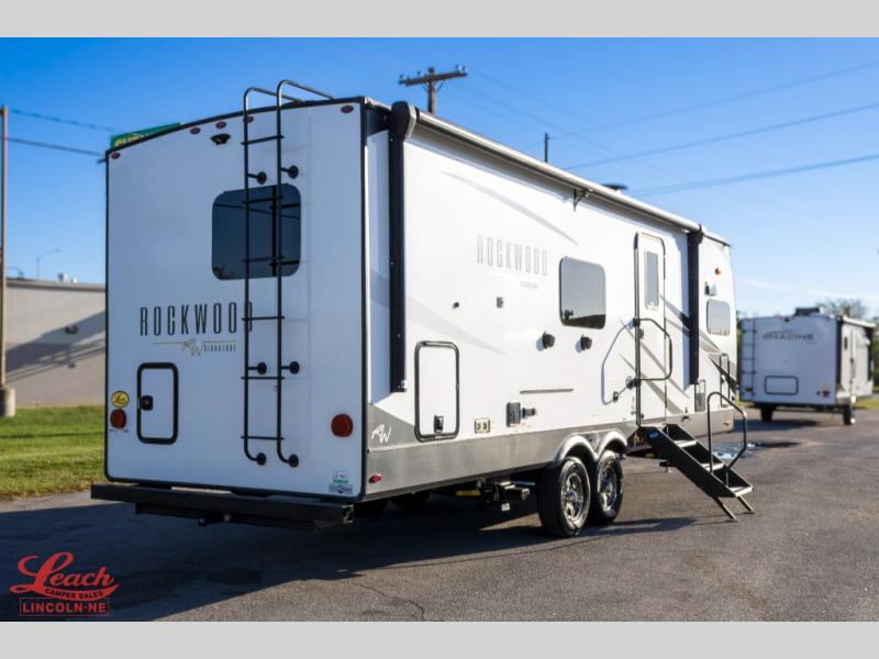 With any Rockwood Signature fifth wheel or travel trailer by Forest River RV, the superior construction includes white or champagne fiberglass sidewalls, a one piece seamless roof membrane, 6-sided aluminum framed walls, floors and roof, plus radiant foil insulation and an enclosed underbelly for use in all types of weather. Some safety standards include Dexter torsion axles, MORryde strut assist steps, and the TST tire pressure monitor system. The interior offers a One Touch OneControl panel with WeRV app control, for lights, awning, slides, water heater and more. You will also appreciate the interior vaulted ceilings, residential soft close doors and drawers, plus solid surface kitchen countertops, a designer kitchen backsplash, plus many more features depending on which Rockwood Signature unit you choose!