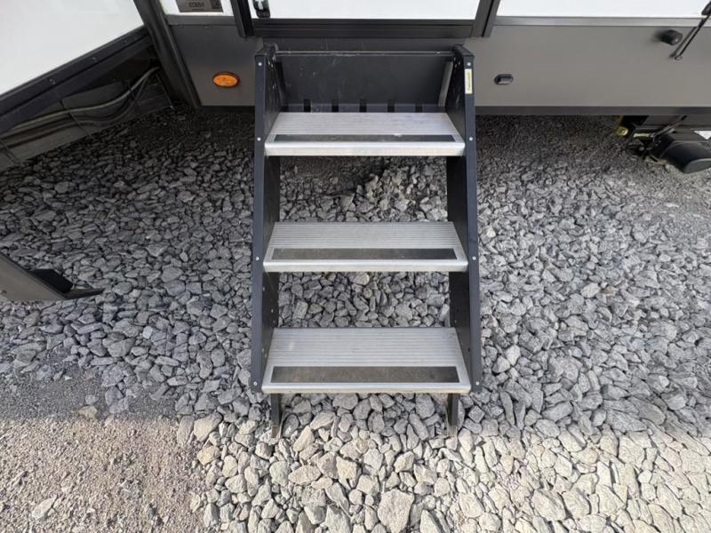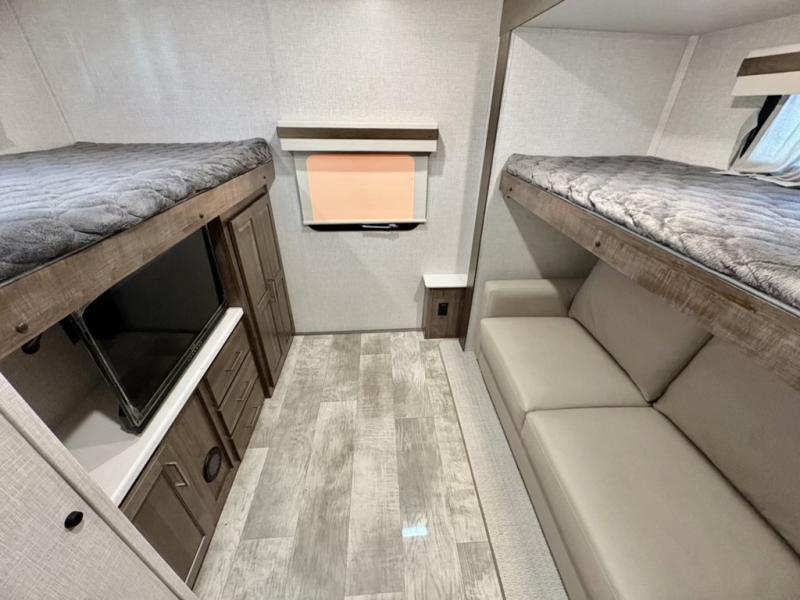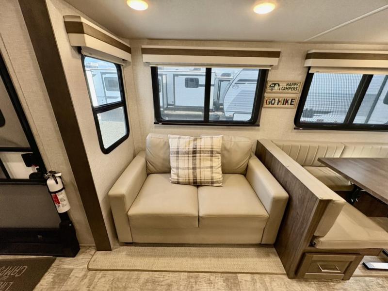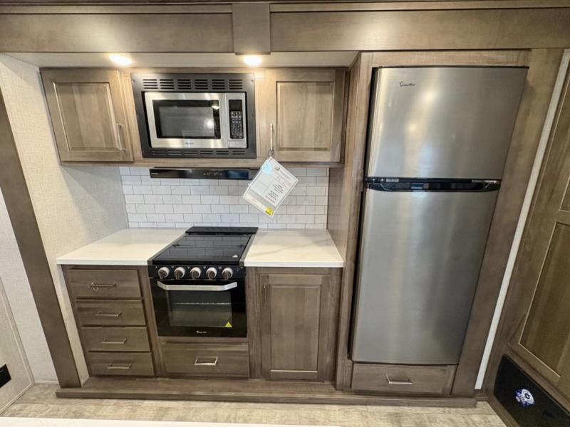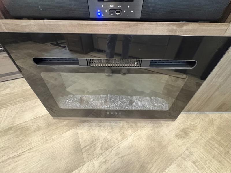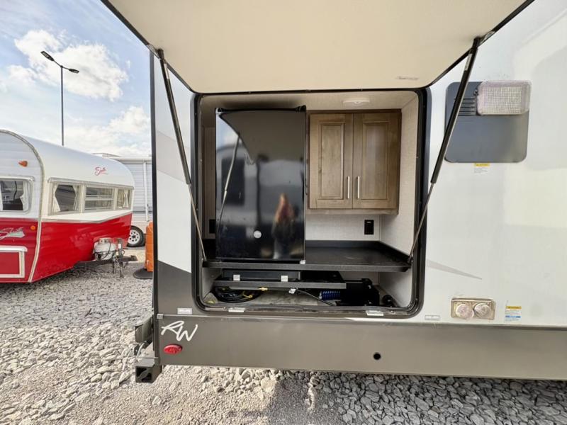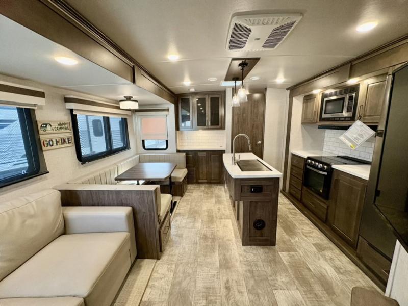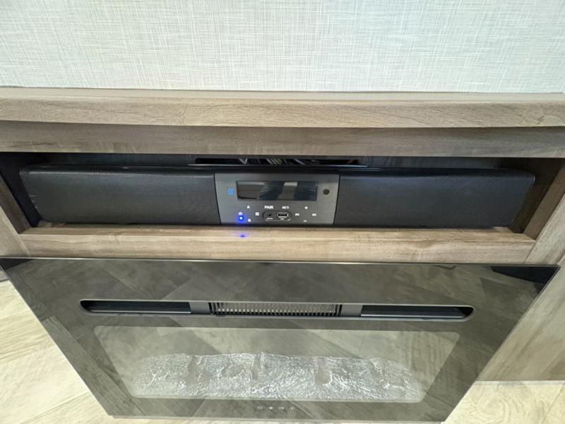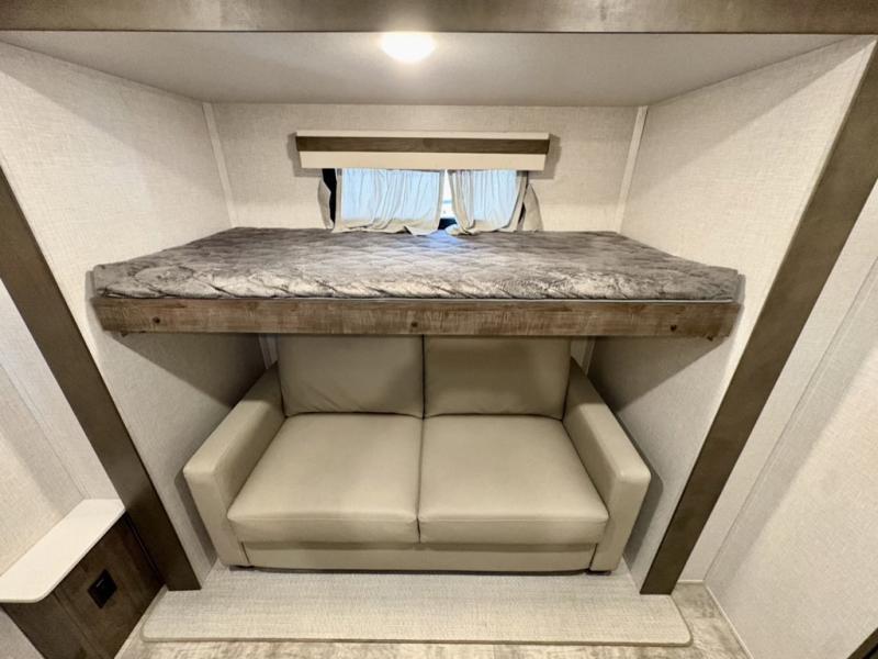Family vacations and weekend excursions with friends just got sweeter with this travel trailer in tow. The rear private bunkhouse includes a slide out for more space, two bunks, a hide-a-bed sofa. Head to the main living area to relax on the hide-a-bed sofa by the fireplace, or prepare lunch at the kitchen island. If the weather is nice, you may just want to go outdoors to cook on the outside kitchen. There are two power awnings here, and Solid Step entry steps for a sturdy entrance into the trailer. When it's time to call it a night, head to the front master bedroom to enjoy your queen bed slide out, large wardrobe, plus a large front counter with cabinets for more storage.