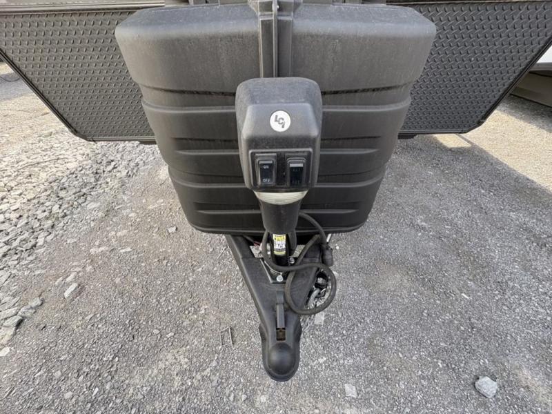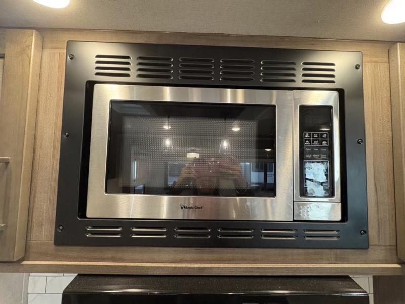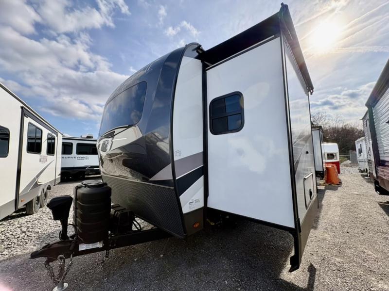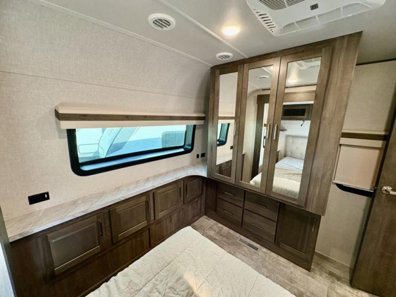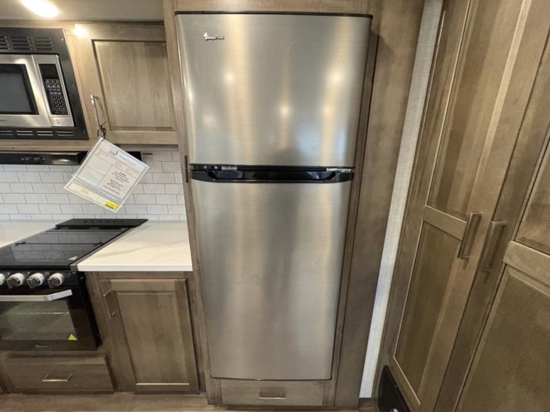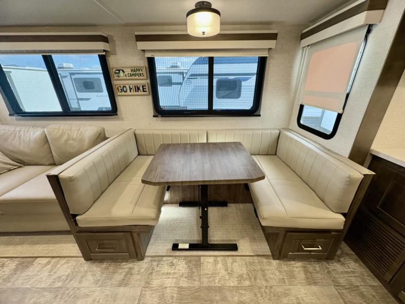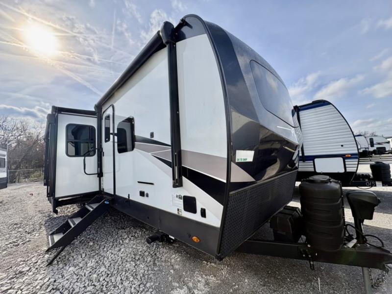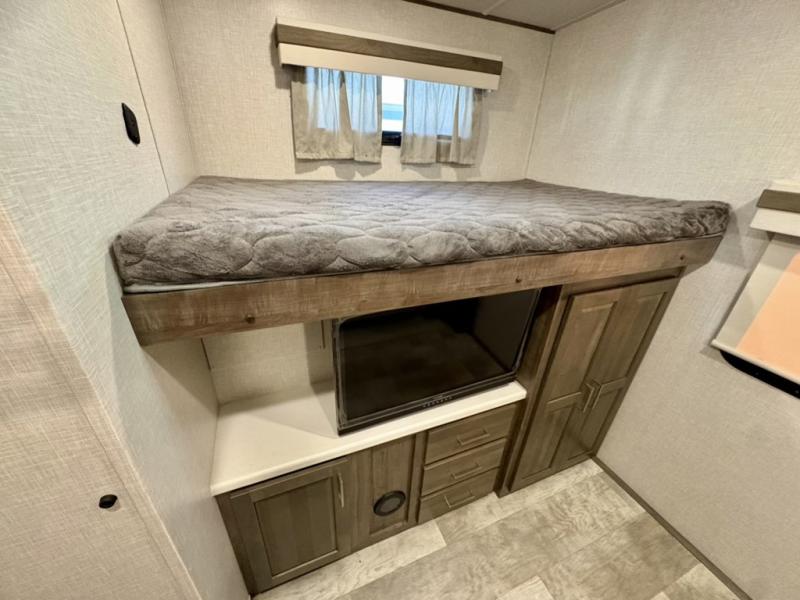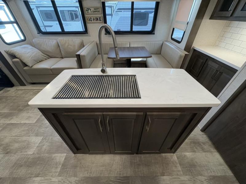 Family vacations and weekend excursions with friends just got sweeter with this travel trailer in tow. The rear private bunkhouse includes a slide out for more space, two bunks, a hide-a-bed sofa. Head to the main living area to relax on the hide-a-bed sofa by the fireplace, or prepare lunch at the kitchen island. If the weather is nice, you may just want to go outdoors to cook on the outside kitchen. There are two power awnings here, and Solid Step entry steps for a sturdy entrance into the trailer. When it's time to call it a night, head to the front master bedroom to enjoy your queen bed slide out, large wardrobe, plus a large front counter with cabinets for more storage.