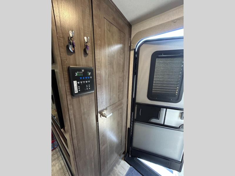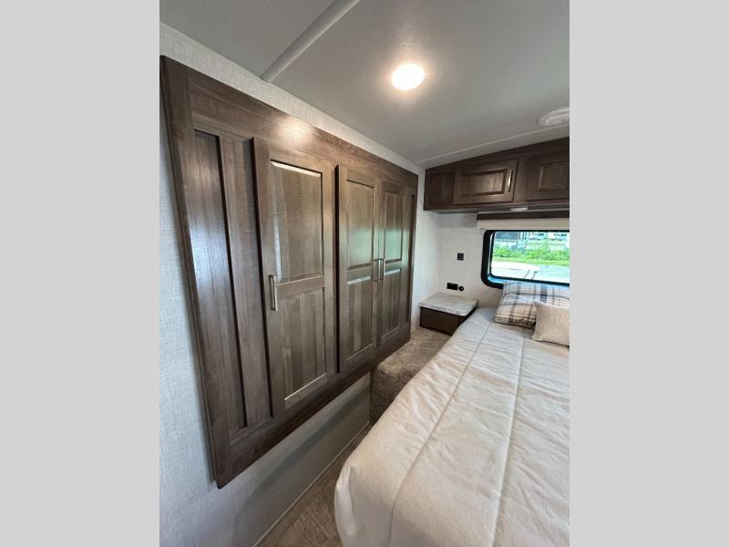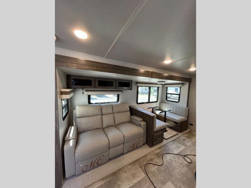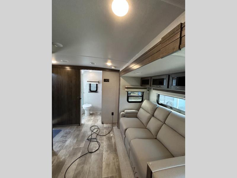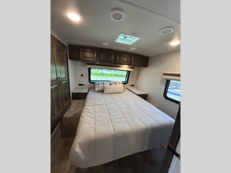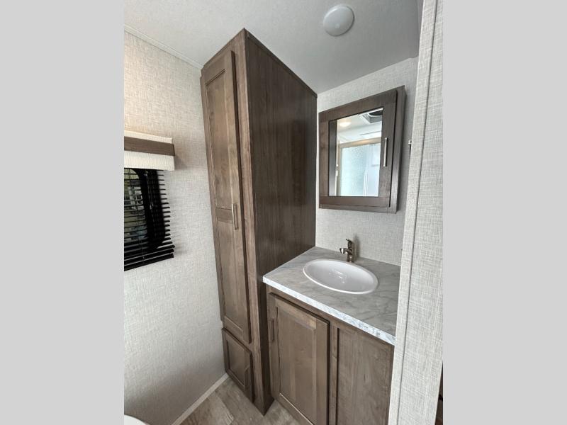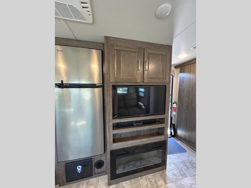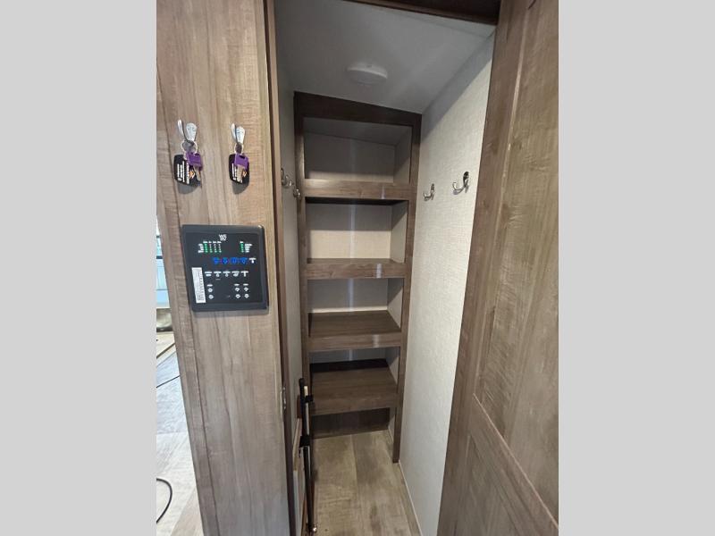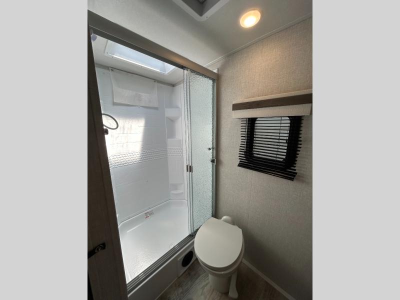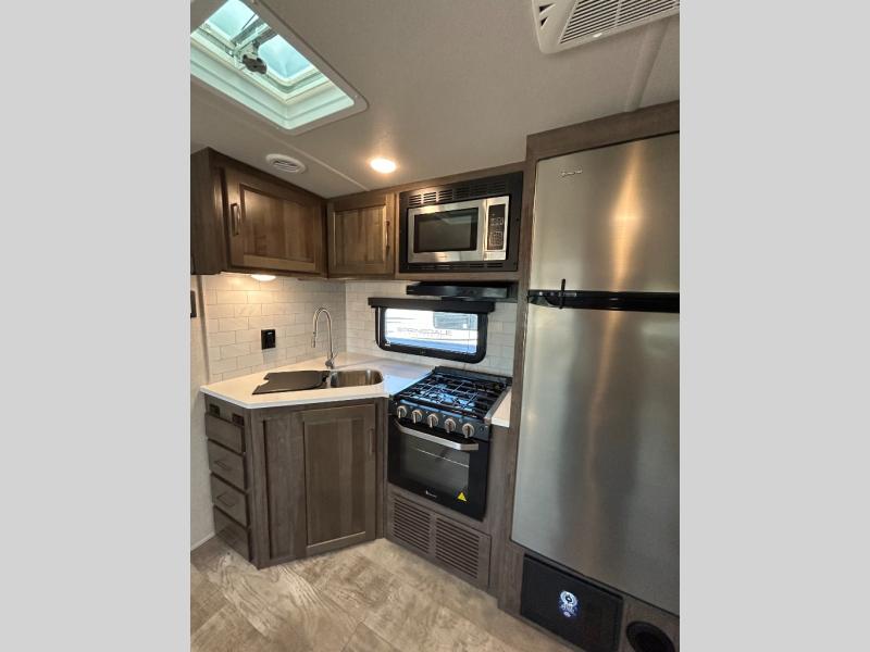 This trailer is the perfect couple's retreat with its private bedroom up front which includes a queen bed, a slide out wardrobe and a TV option. The spacious rear full bathroom provides a shower and linen storage, and a space savings sliding door. The cook will have full amenities including a counter extension for more prep space, and a pantry below the LED TV and entertainment center. The booth dinette offers inside dining as well as sleeping space, and the theater seating is a great place to relax.