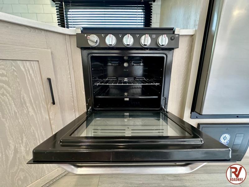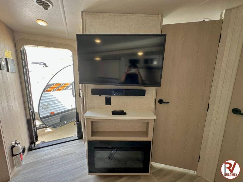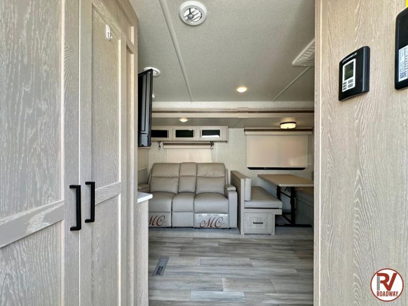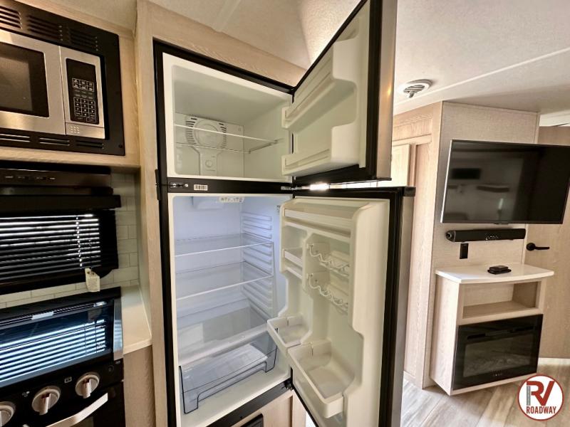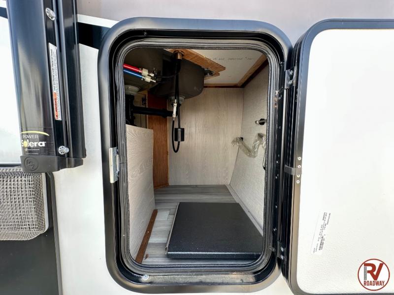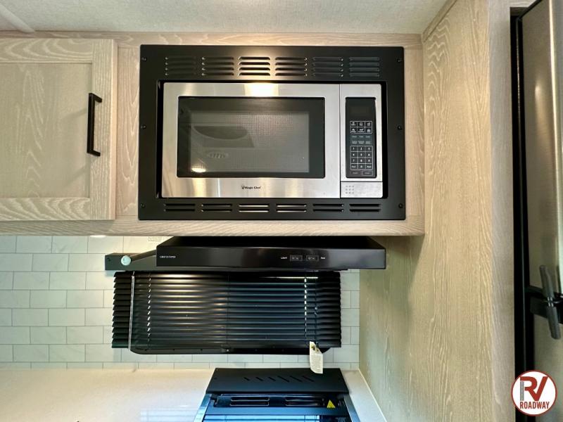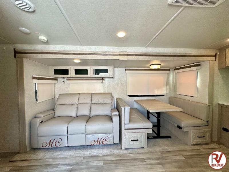 When you are outside this trailer you can enjoy the protection from the 21' power awning, and whip up a meal using the outside griddle. You will find exterior storage for your extra gear, and a ladder on the rear. You get to choose which entrance to step up into, be it the spacious rear bedroom with a queen bed slide and a wardrobe, or the main entry into the kitchen and living area. The furniture slide includes a booth dinette to eat your meals at, and theater seating to watch the LED TV with fireplace below. And the cook will love the front kitchen with extra counter space, and the appliances are nearby to make warm meals, and the pantry is next to the entry allowing you to grab a snack on your way out for a hike.