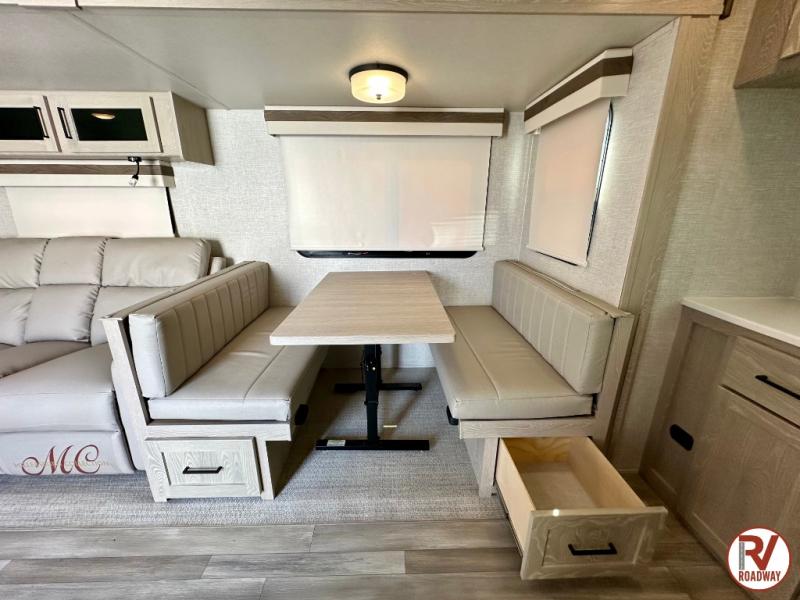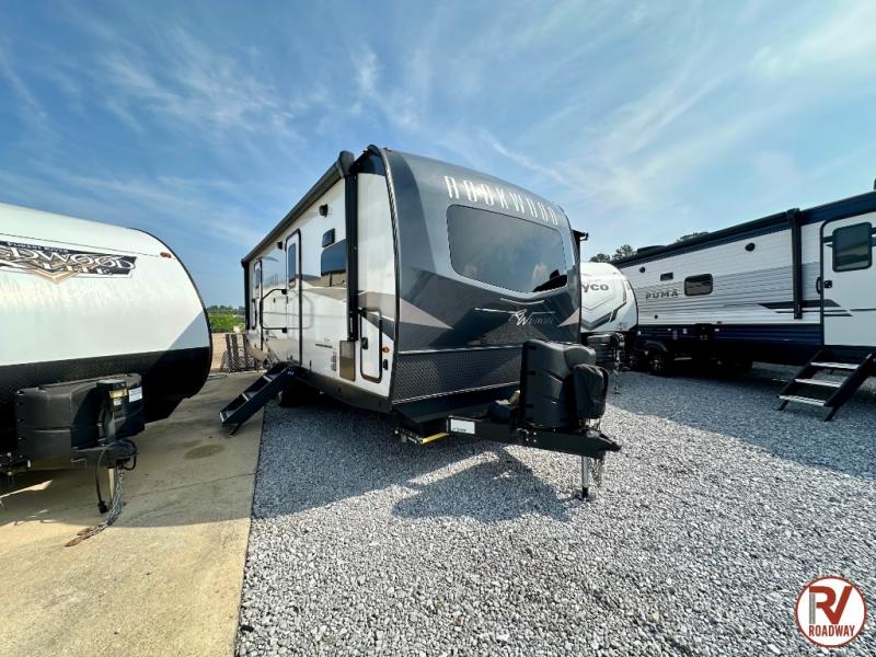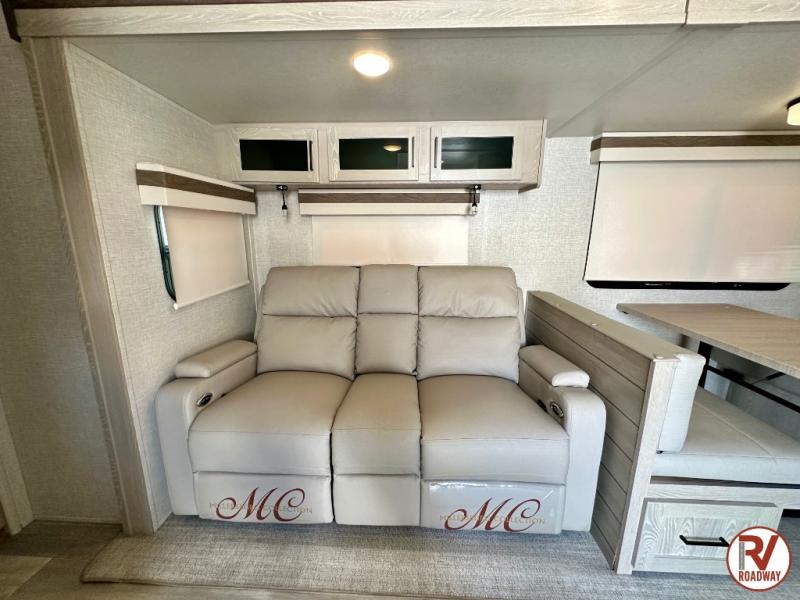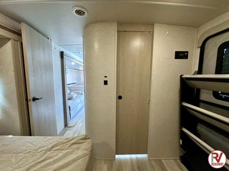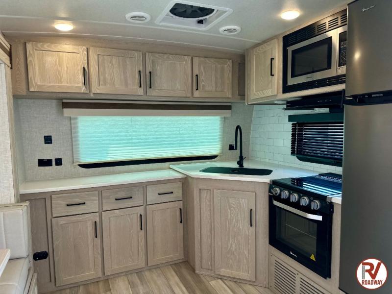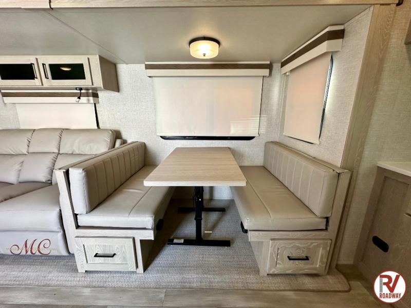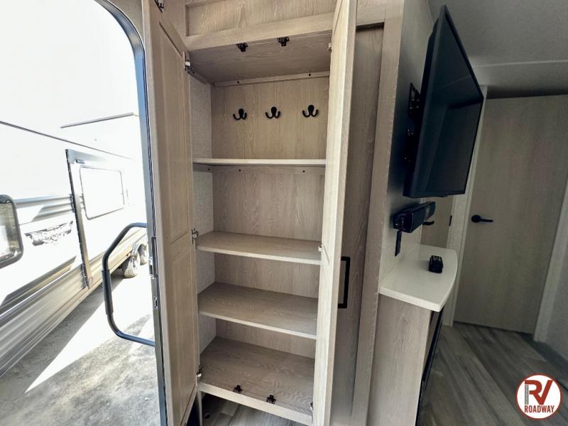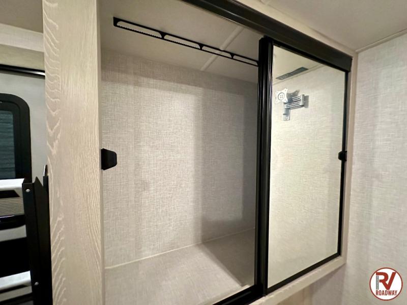 When you are outside this trailer you can enjoy the protection from the 21' power awning, and whip up a meal using the outside griddle. You will find exterior storage for your extra gear, and a ladder on the rear. You get to choose which entrance to step up into, be it the spacious rear bedroom with a queen bed slide and a wardrobe, or the main entry into the kitchen and living area. The furniture slide includes a booth dinette to eat your meals at, and theater seating to watch the LED TV with fireplace below. And the cook will love the front kitchen with extra counter space, and the appliances are nearby to make warm meals, and the pantry is next to the entry allowing you to grab a snack on your way out for a hike.